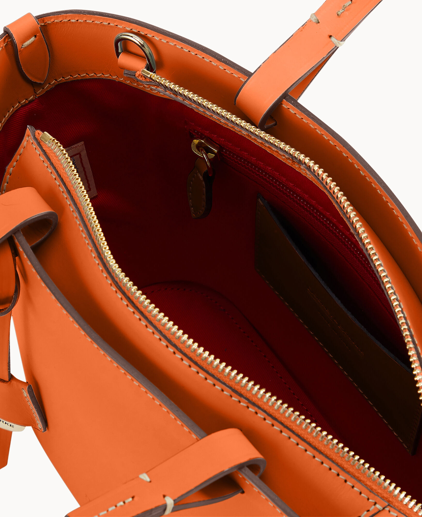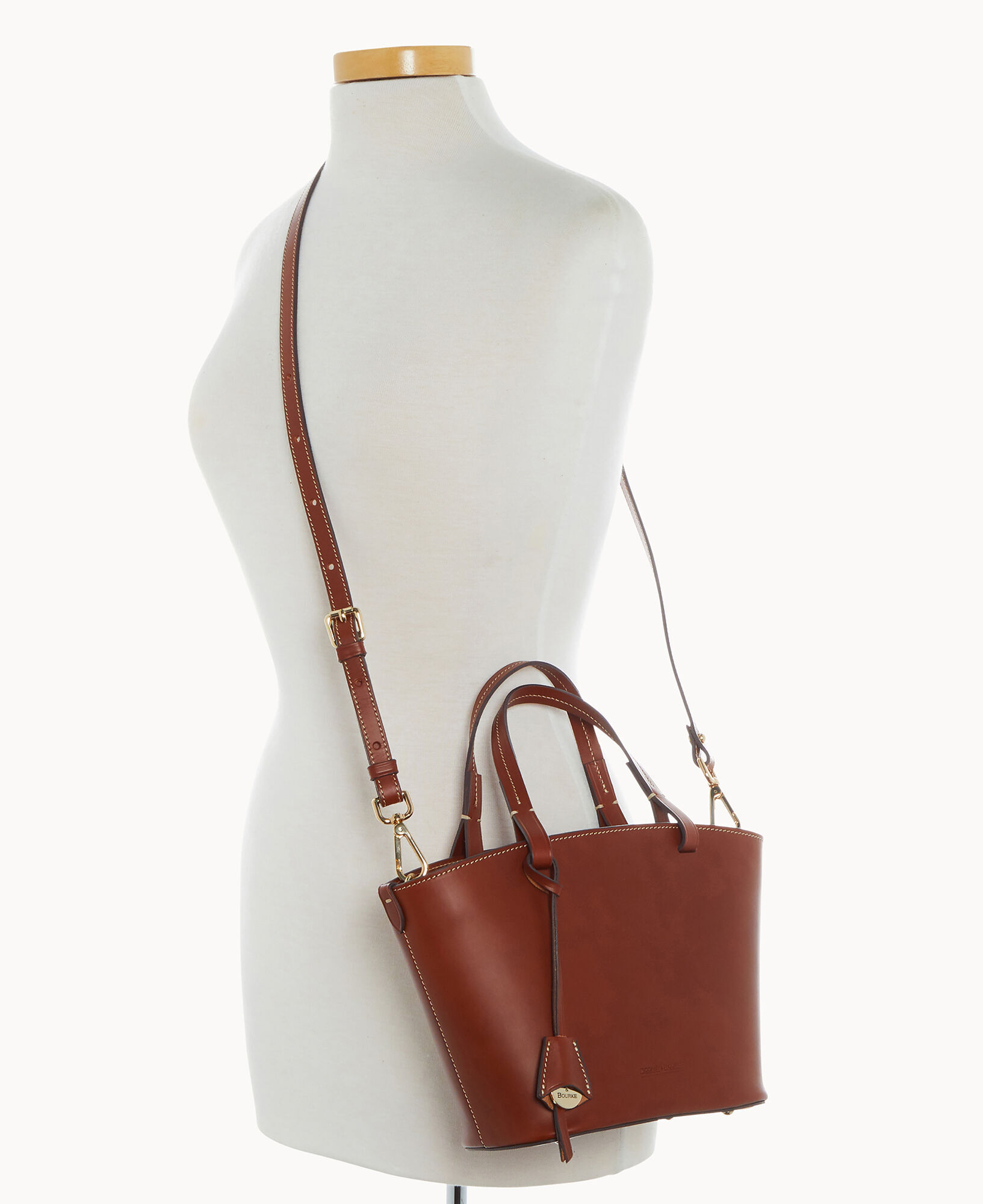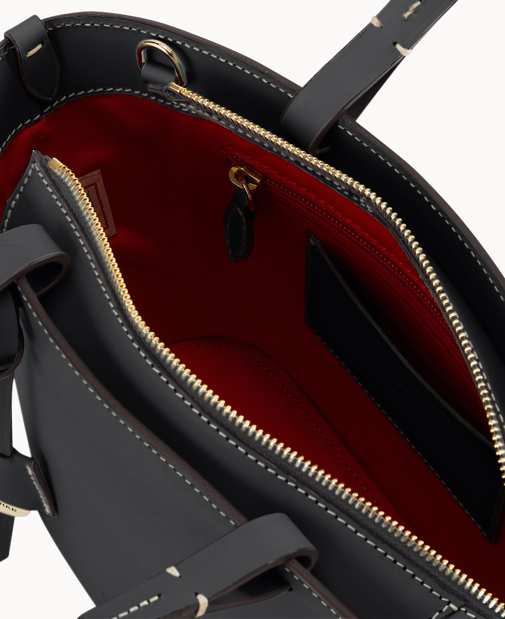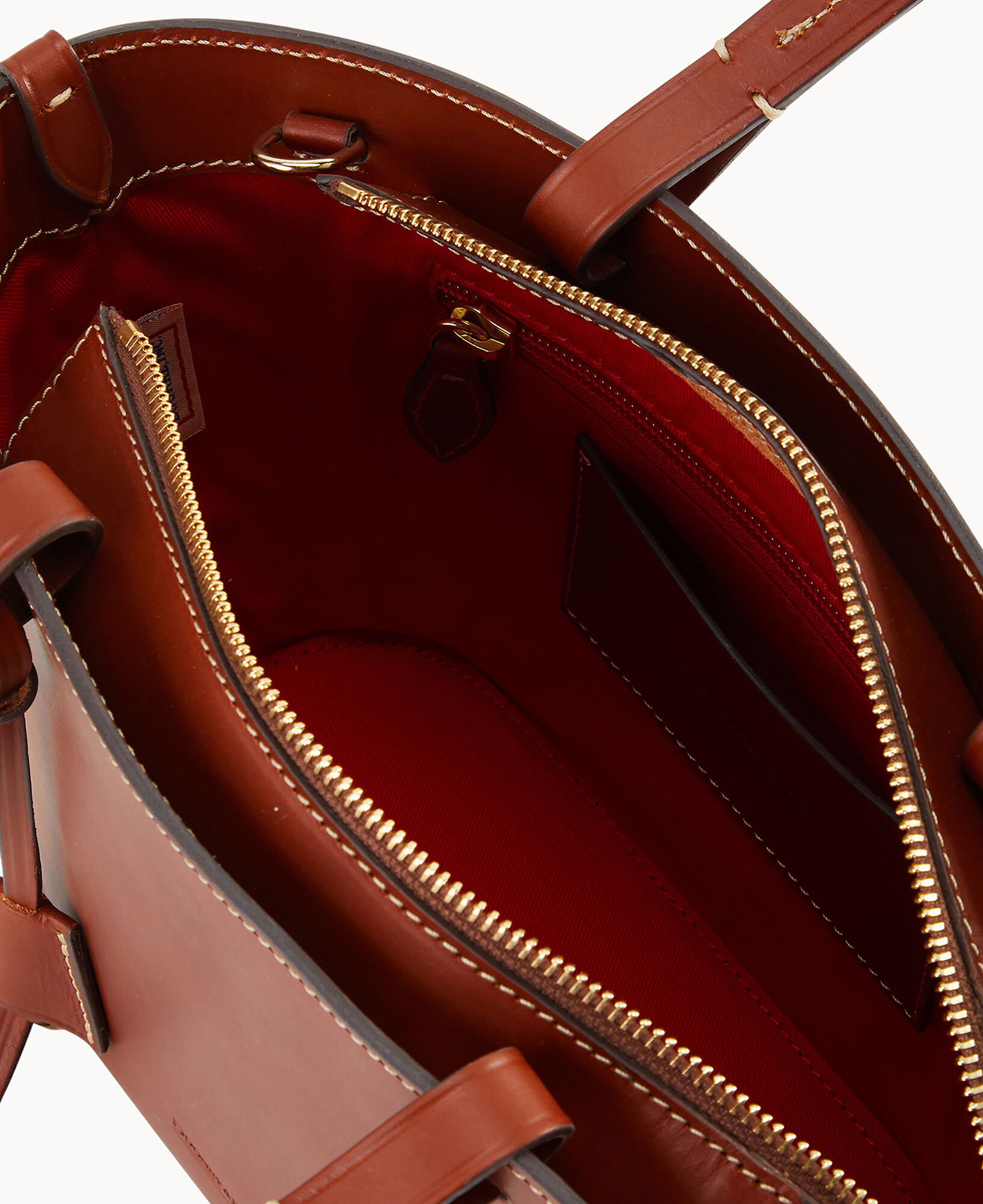 One inside zip pocket. Four inside pockets. One credit card pocket. Adjustable, detachable shoulder strap. Strap drop length 23.5″. Lined. Removable medallion. Zipper closure.
