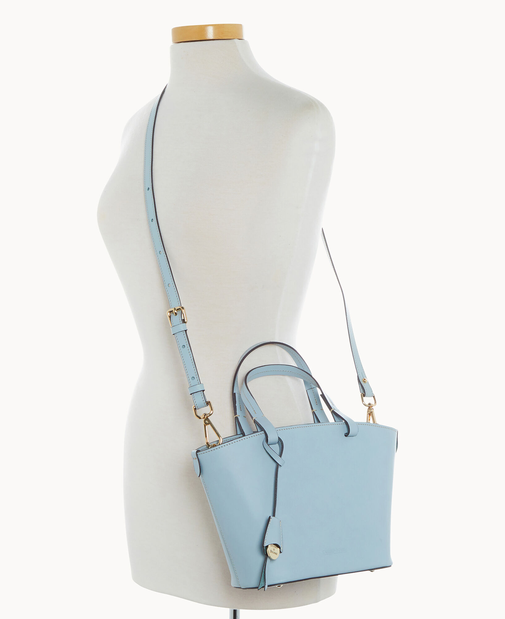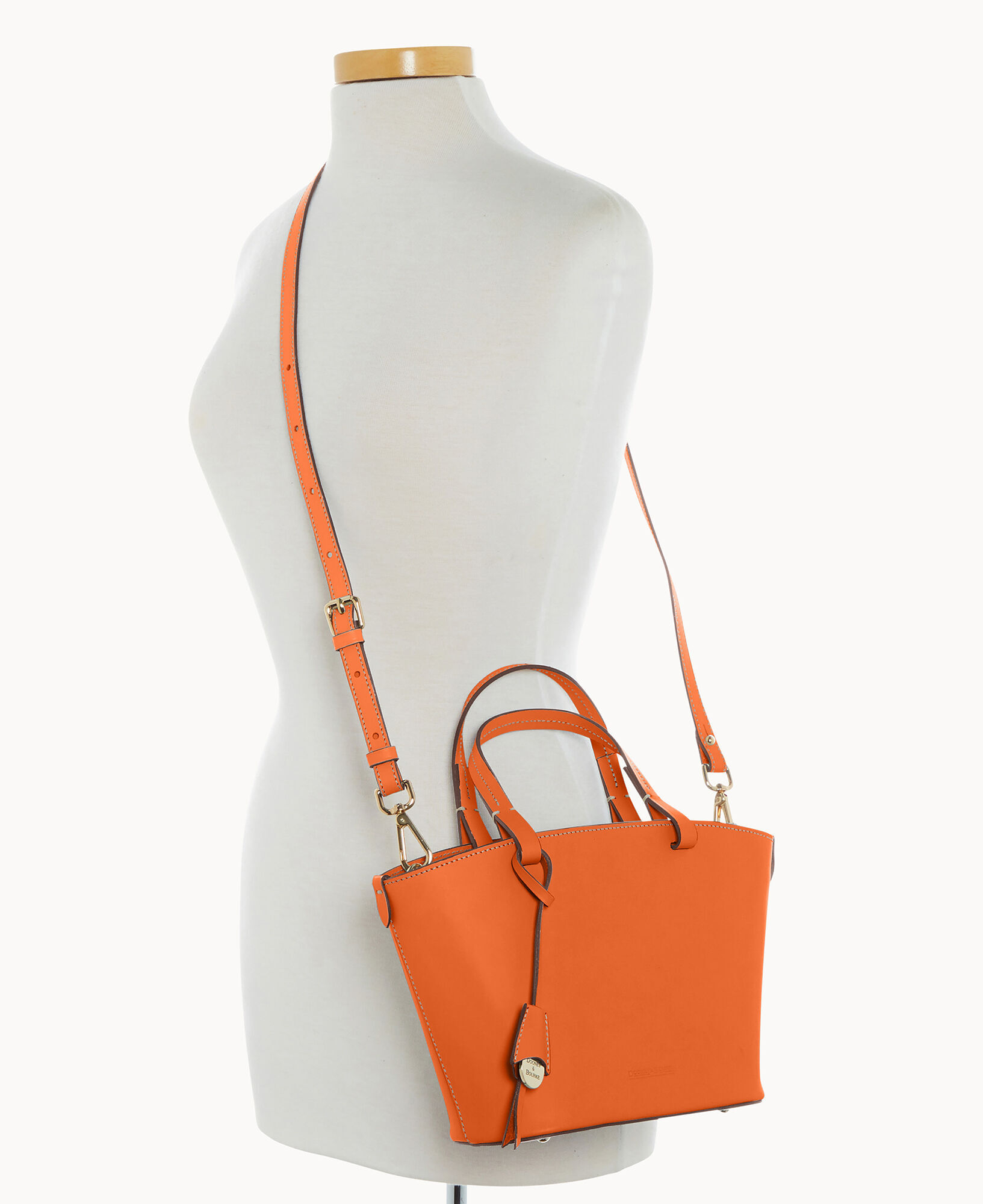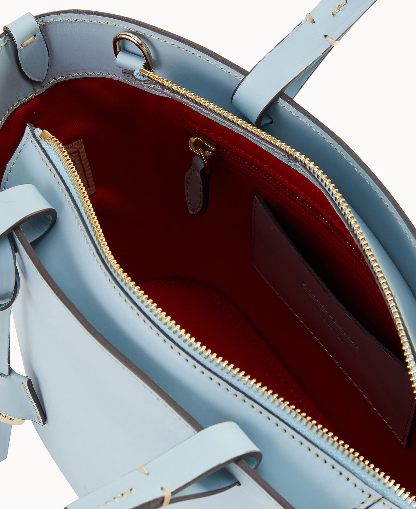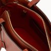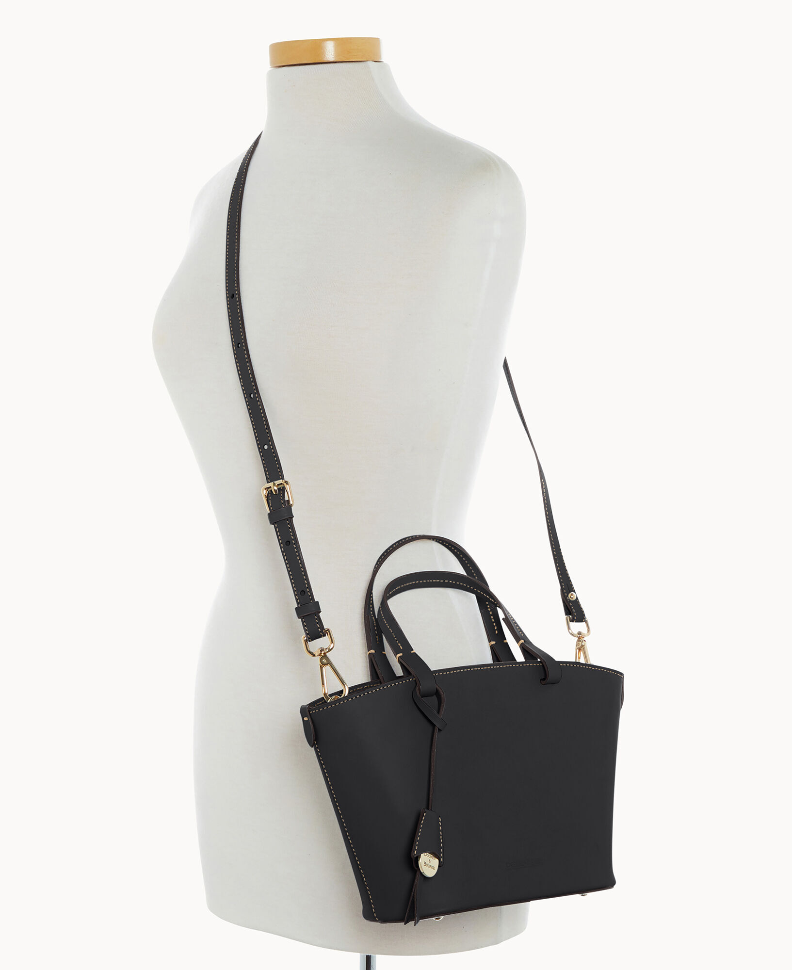 One inside zip pocket. Four inside pockets. One credit card pocket. Adjustable, detachable shoulder strap. Strap drop length 23.5″. Lined. Removable medallion. Zipper closure.