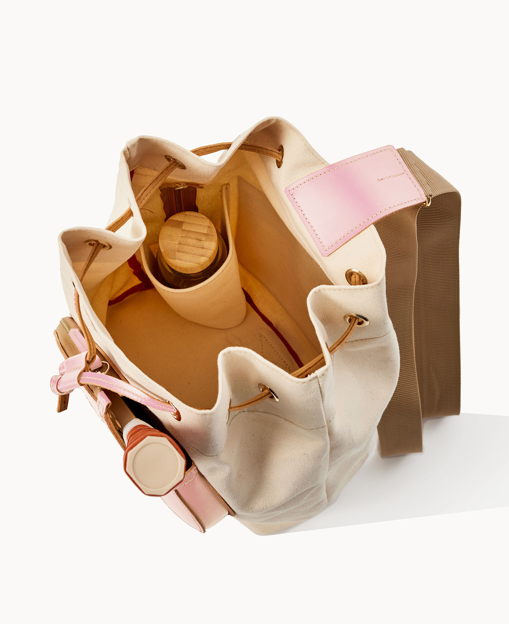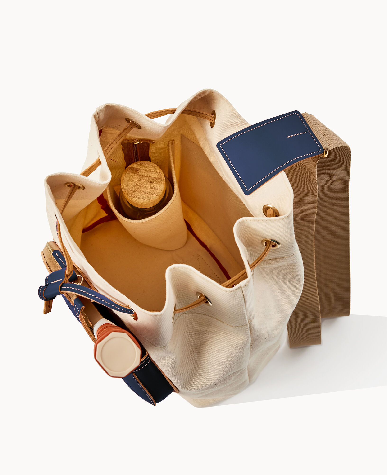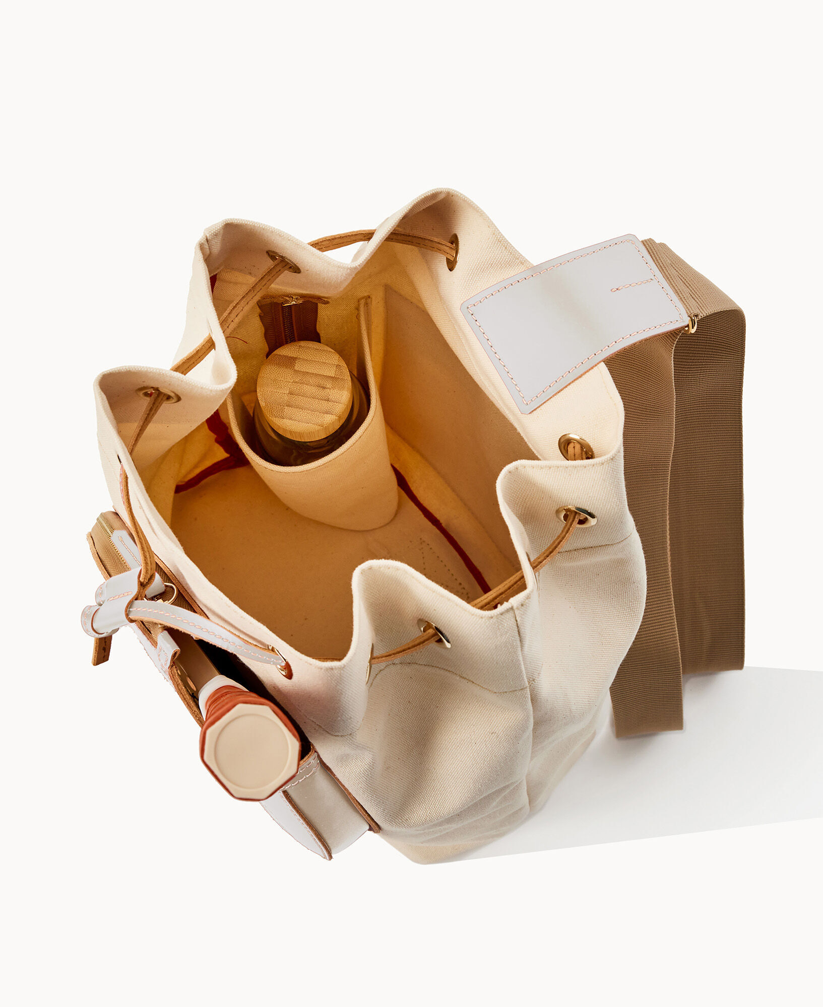 Two outside zip pockets. One inside bottle pocket. Adjustable strap. Drawstring closure.