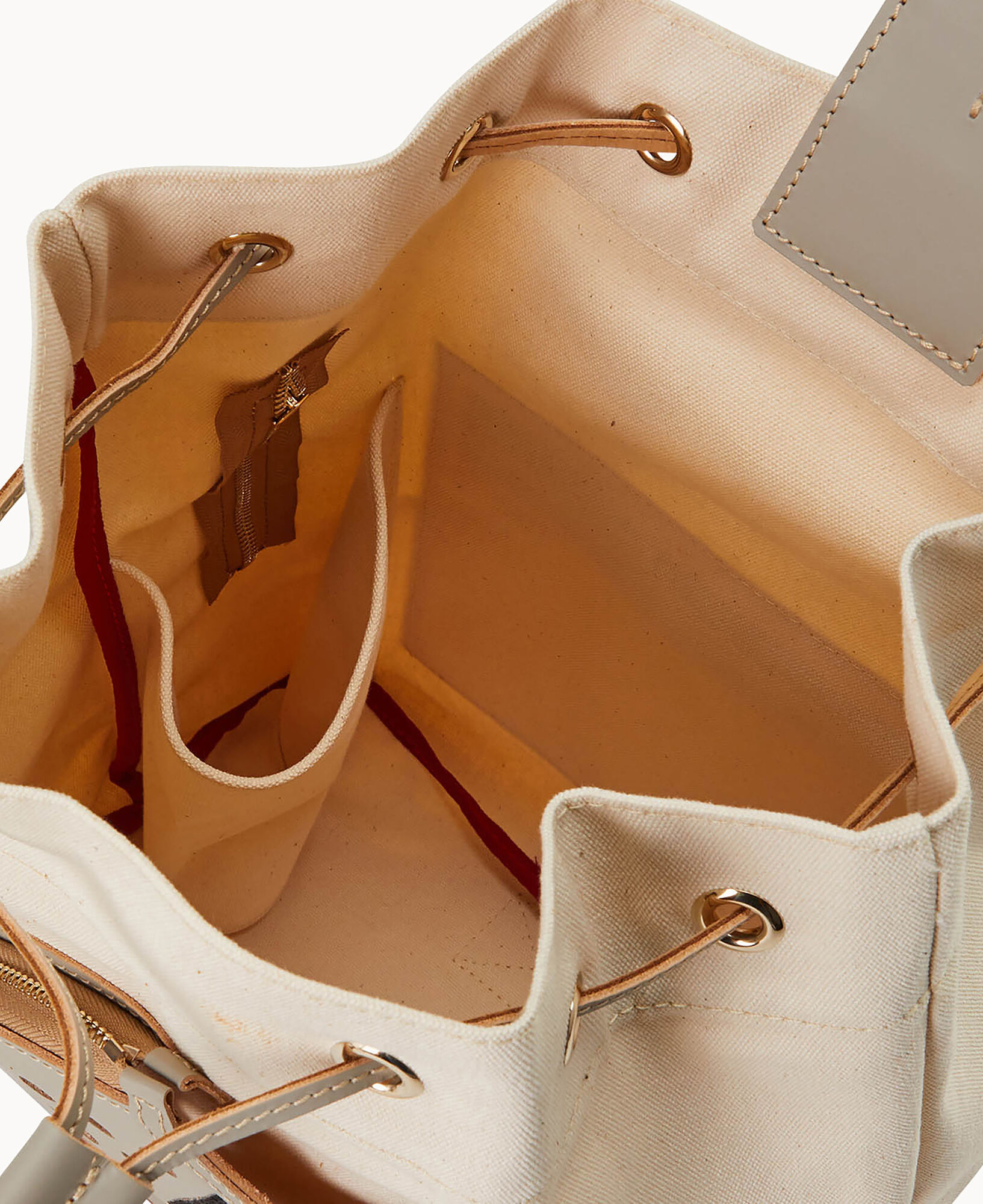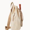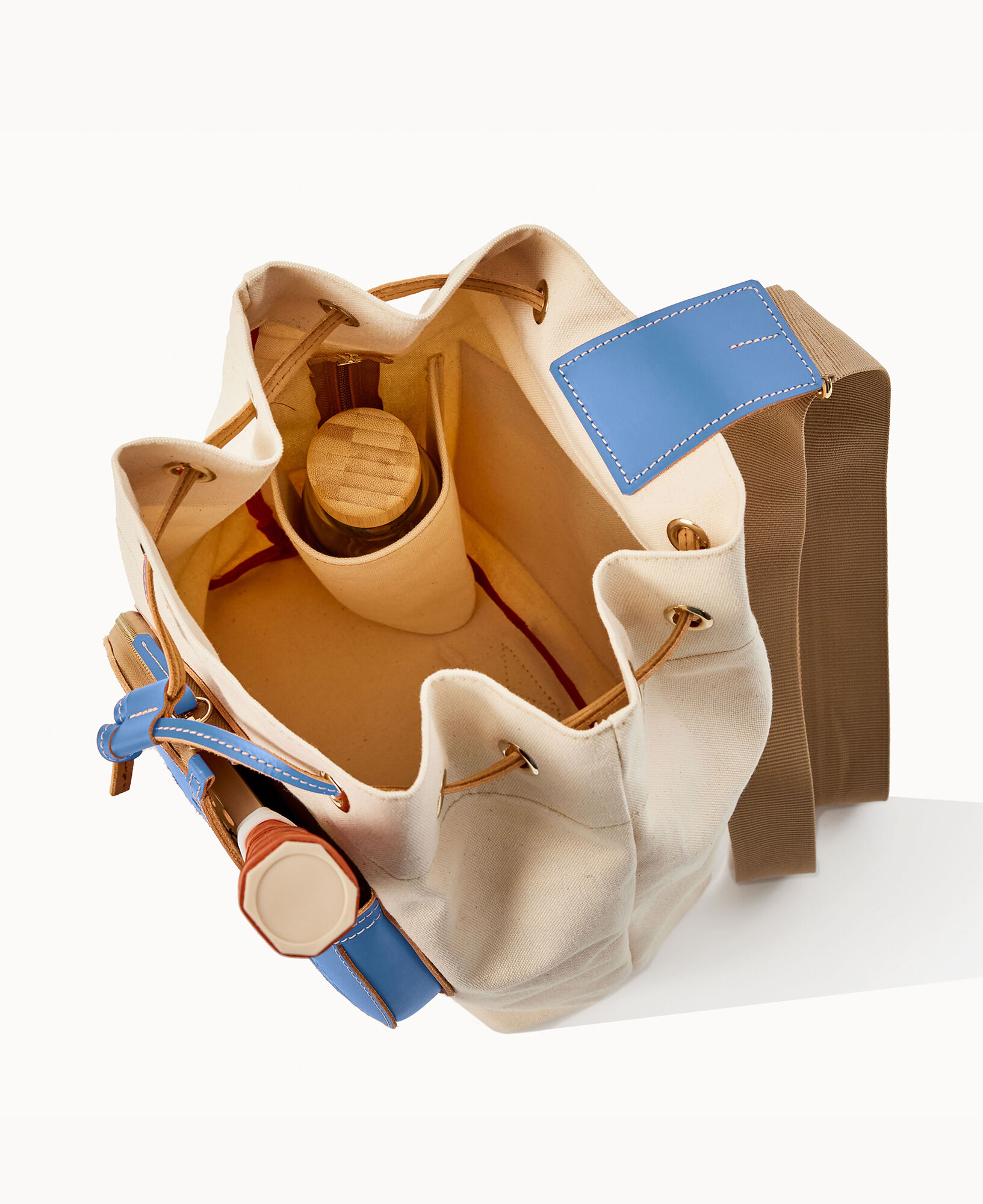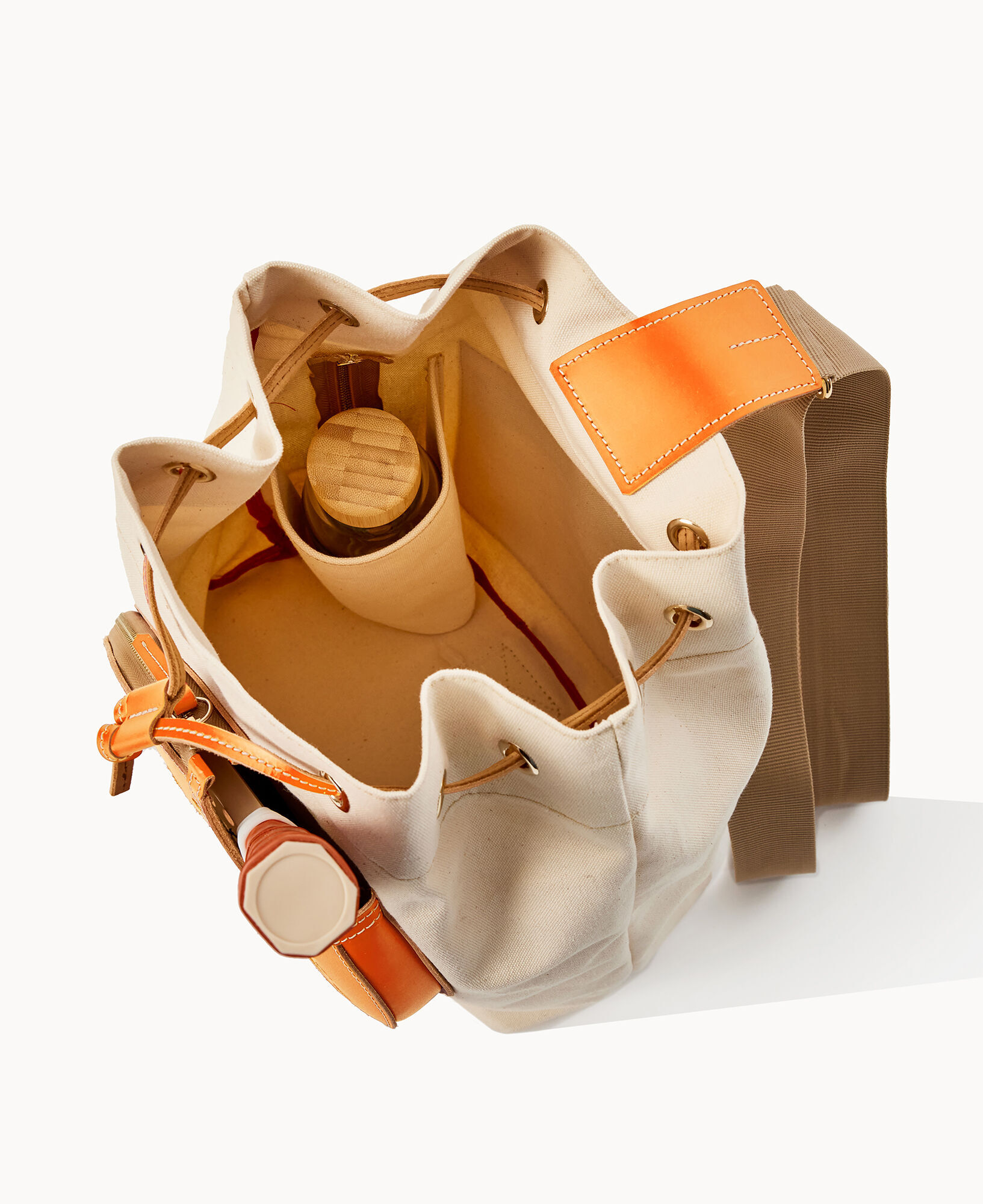 Two outside zip pockets. One inside bottle pocket. Adjustable strap. Drawstring closure.