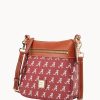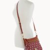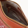 One outside zip pocket. One inside zip pocket. Two inside pockets. Adjustable, detachable shoulder strap. Strap drop length 27″. Inside key hook. Lined. Zipper closure.