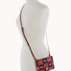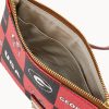 One inside zip pocket. Two inside pockets. Cell phone pocket. Inside key hook. Strap drop length 21″. Lined. Feet. Zipper closure.