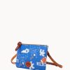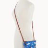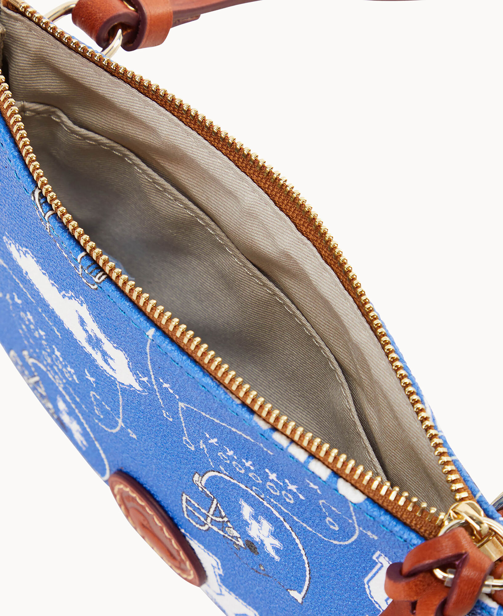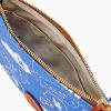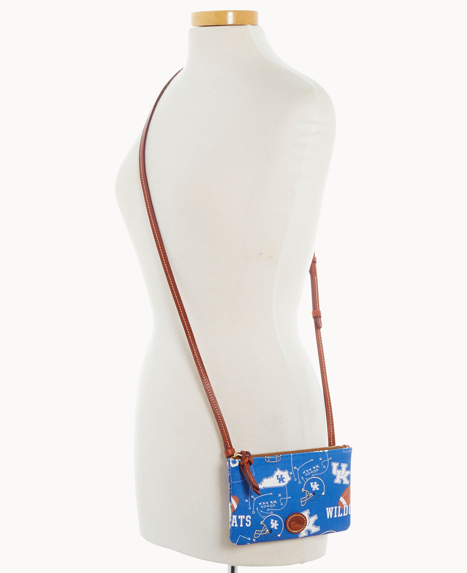 One inside zip pocket. Two inside pockets. Cell phone pocket. Inside key hook. Strap drop length 21″. Lined. Feet. Zipper closure.