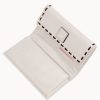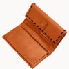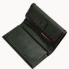 One outside zip pocket. Two inside pockets. Two bill compartments. License pocket with window. Seven credit card slots. Lined. Snap closure.