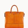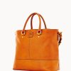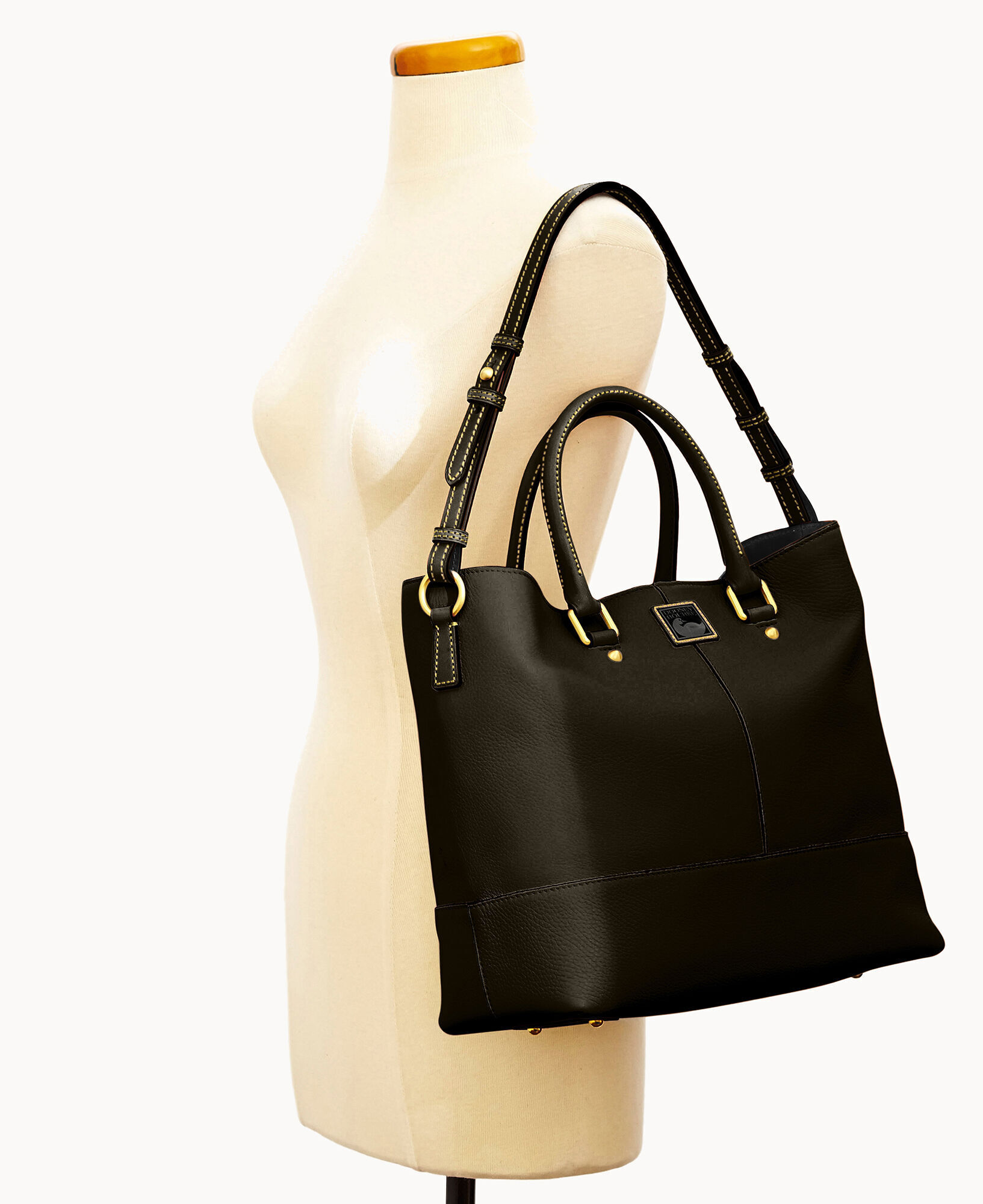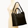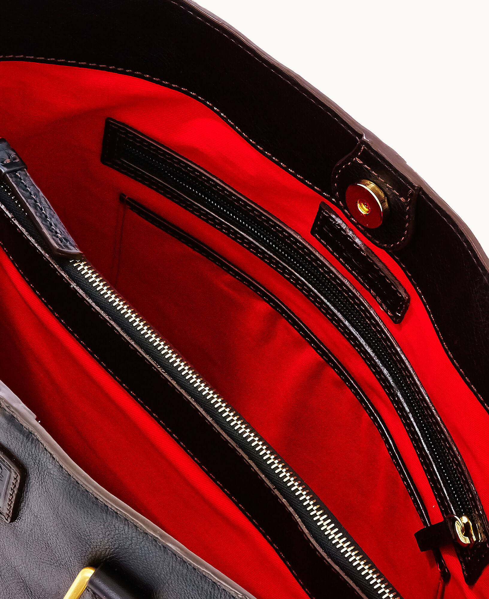 One inside zip pocket. Two inside pockets. Center zip divider compartment. Cell phone pocket. Inside key hook. Handle drop length 5″. Adjustable shoulder strap. Strap drop length 9″. Lined. Feet. Magnetic snap closure.