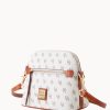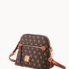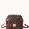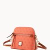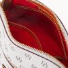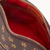 One outside zip pocket. Two inside pockets. Inside key hook. Adjustable, detachable shoulder strap. Strap drop length 24.5″. Lined. Feet. Zipper closure.