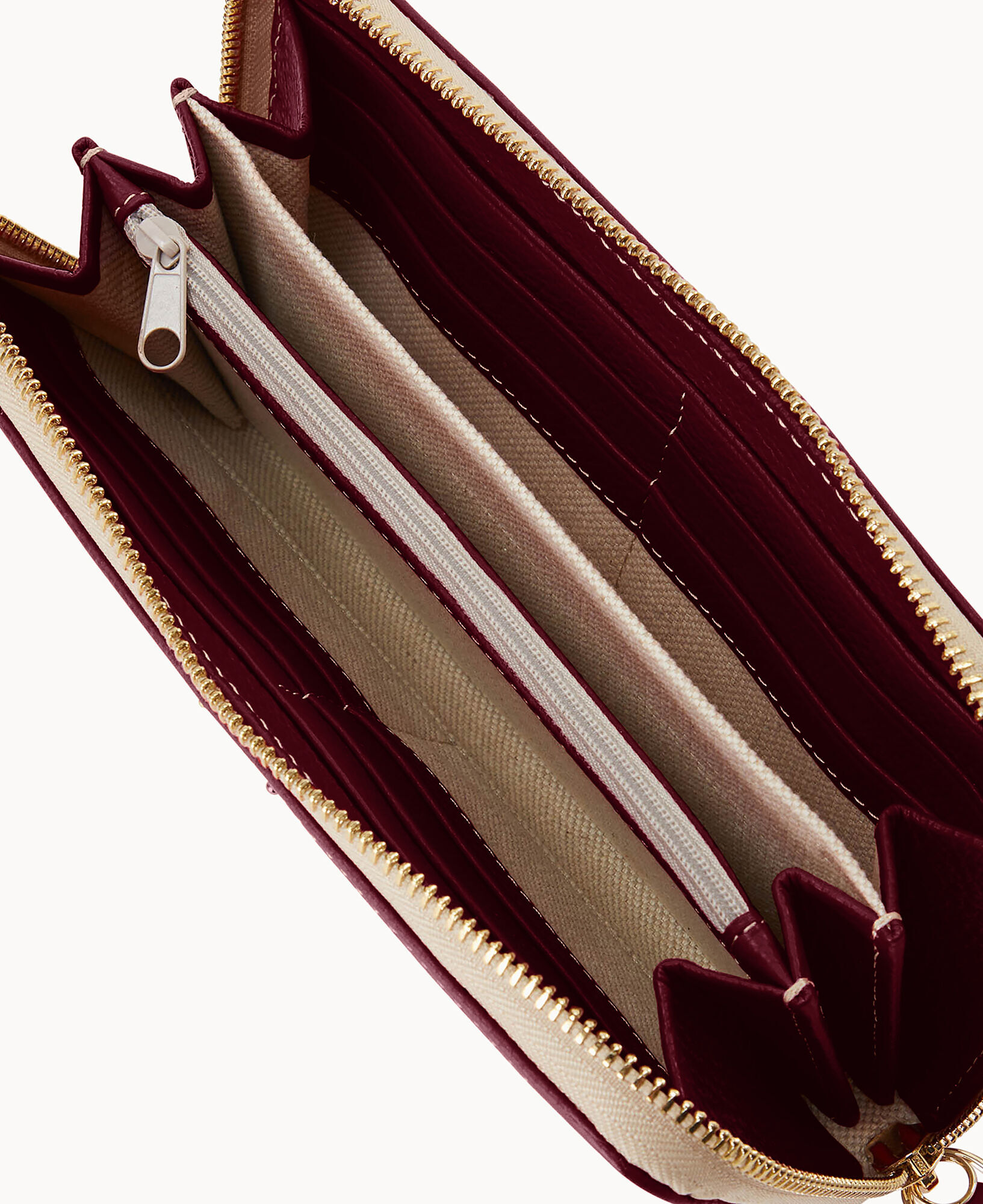 Two compartments. One zip compartment. Twelve credit card slots. Detachable wrist strap. Strap length 7″. Lined. Zipper closure.