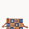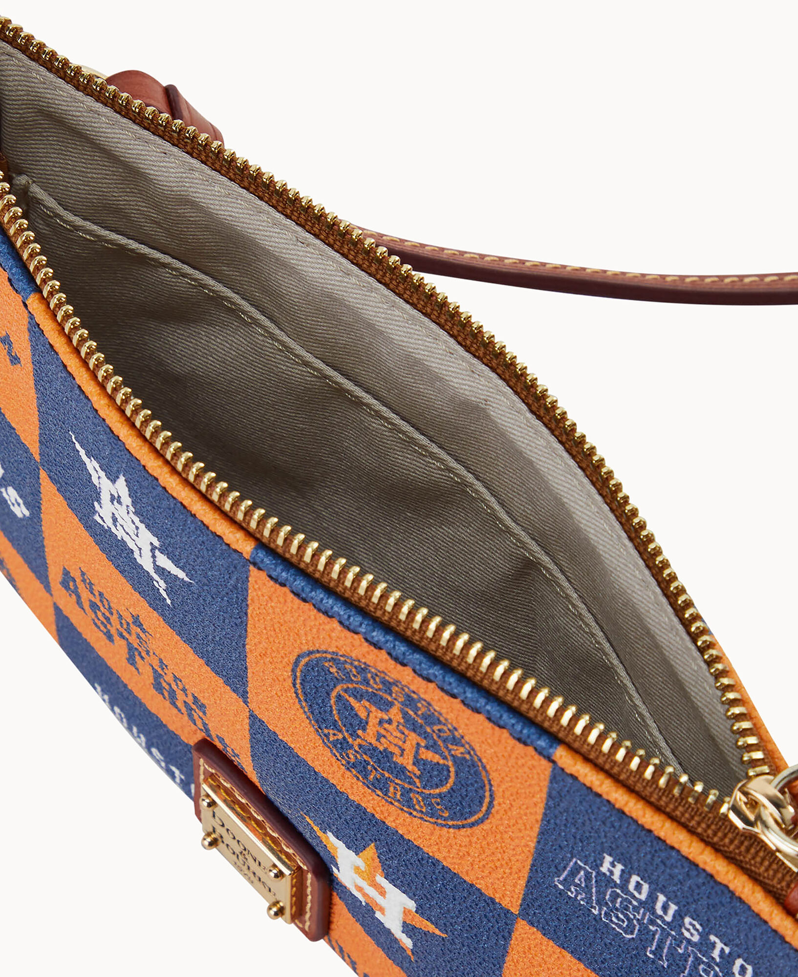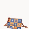 One inside zip pocket. Two inside pockets. Cell phone pocket. Inside key hook. Strap drop length 21″. Lined. Feet. Zipper closure.
