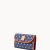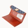 One outside zip pocket. One inside pocket. License pocket with window. Two bill compartments. Seven credit card slots. Lined. Feet. Snap closure.