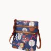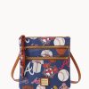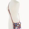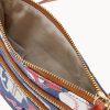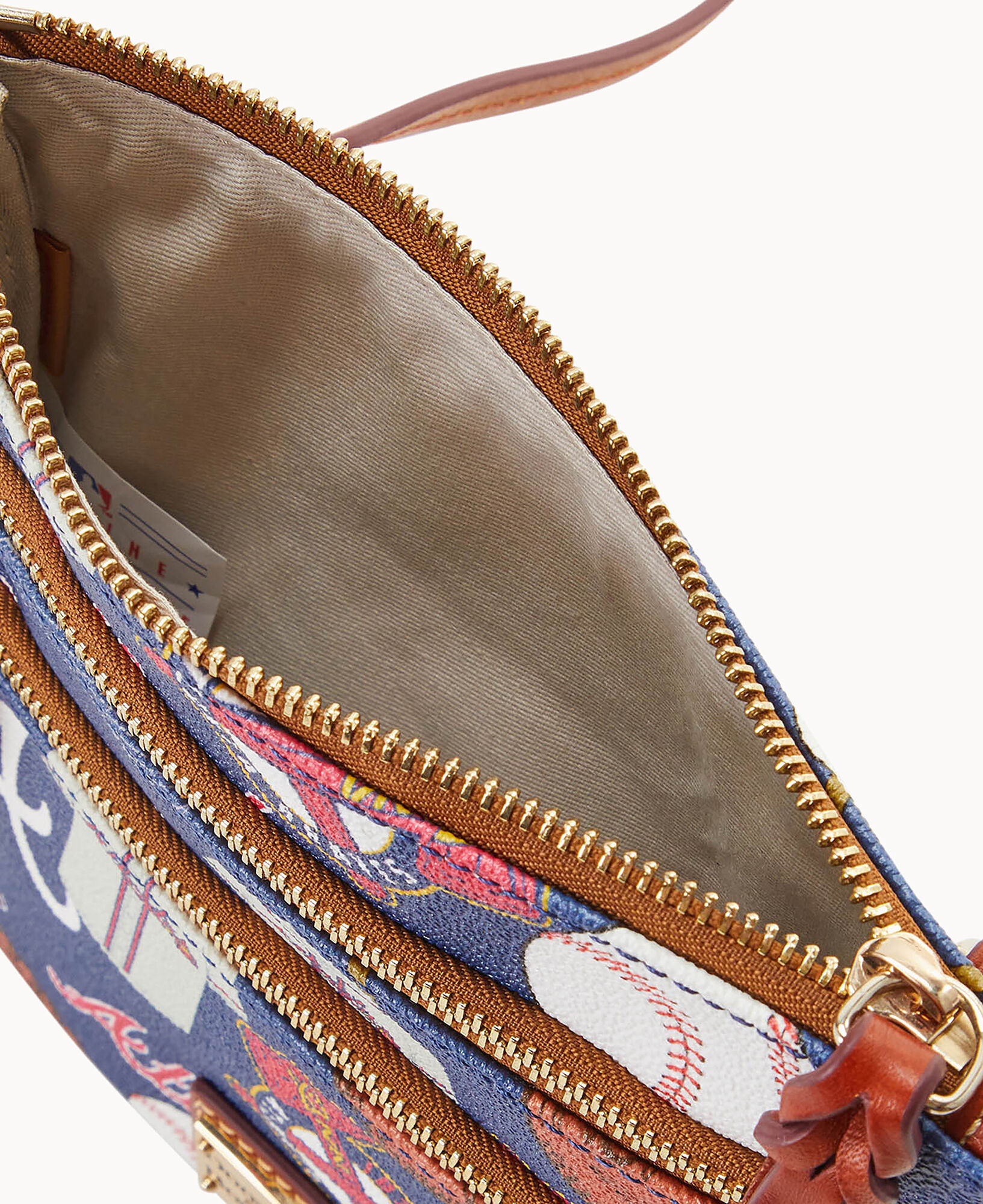 Two outside zip pockets. Cell phone pocket. Adjustable shoulder strap. Strap drop length 24″. Lined. Zipper closure.