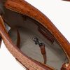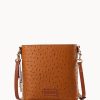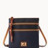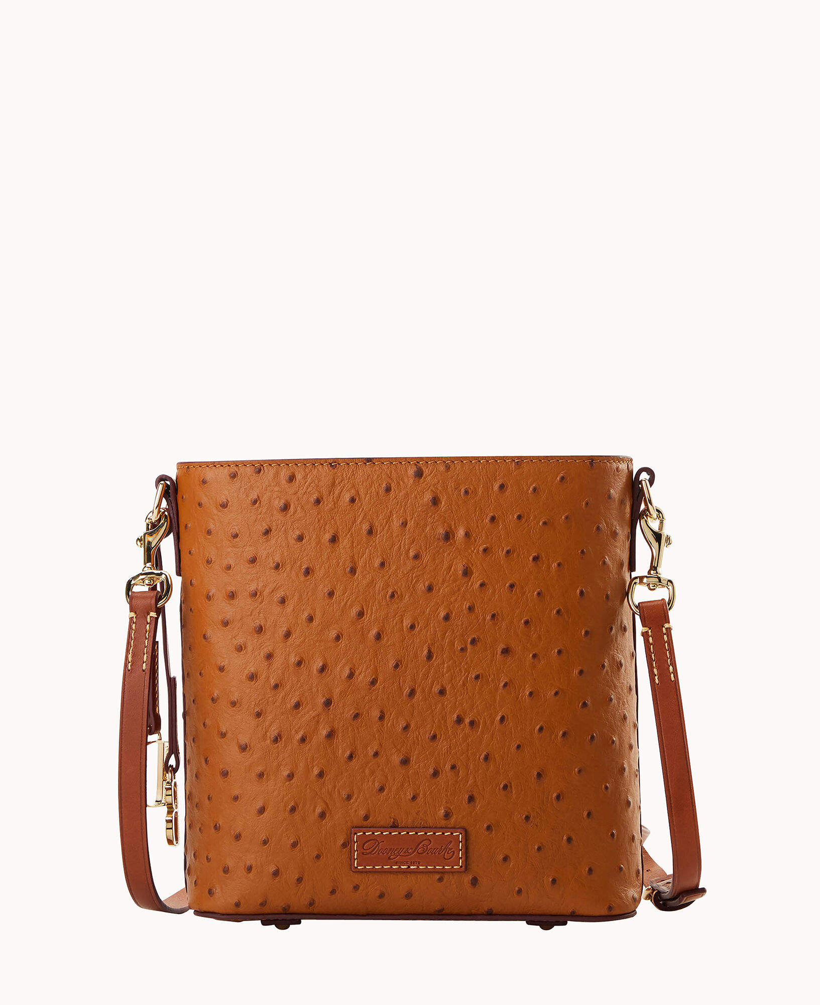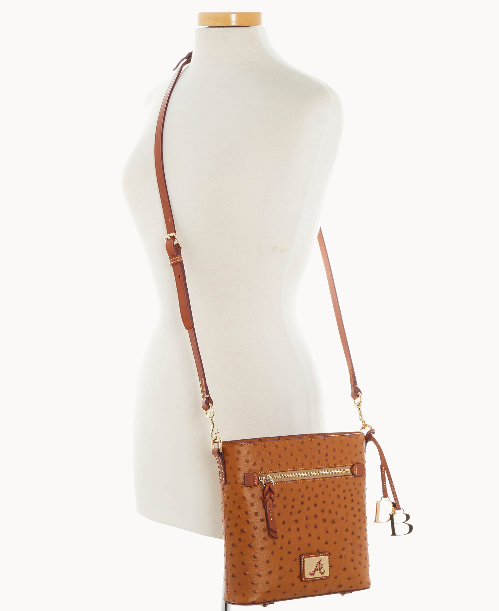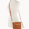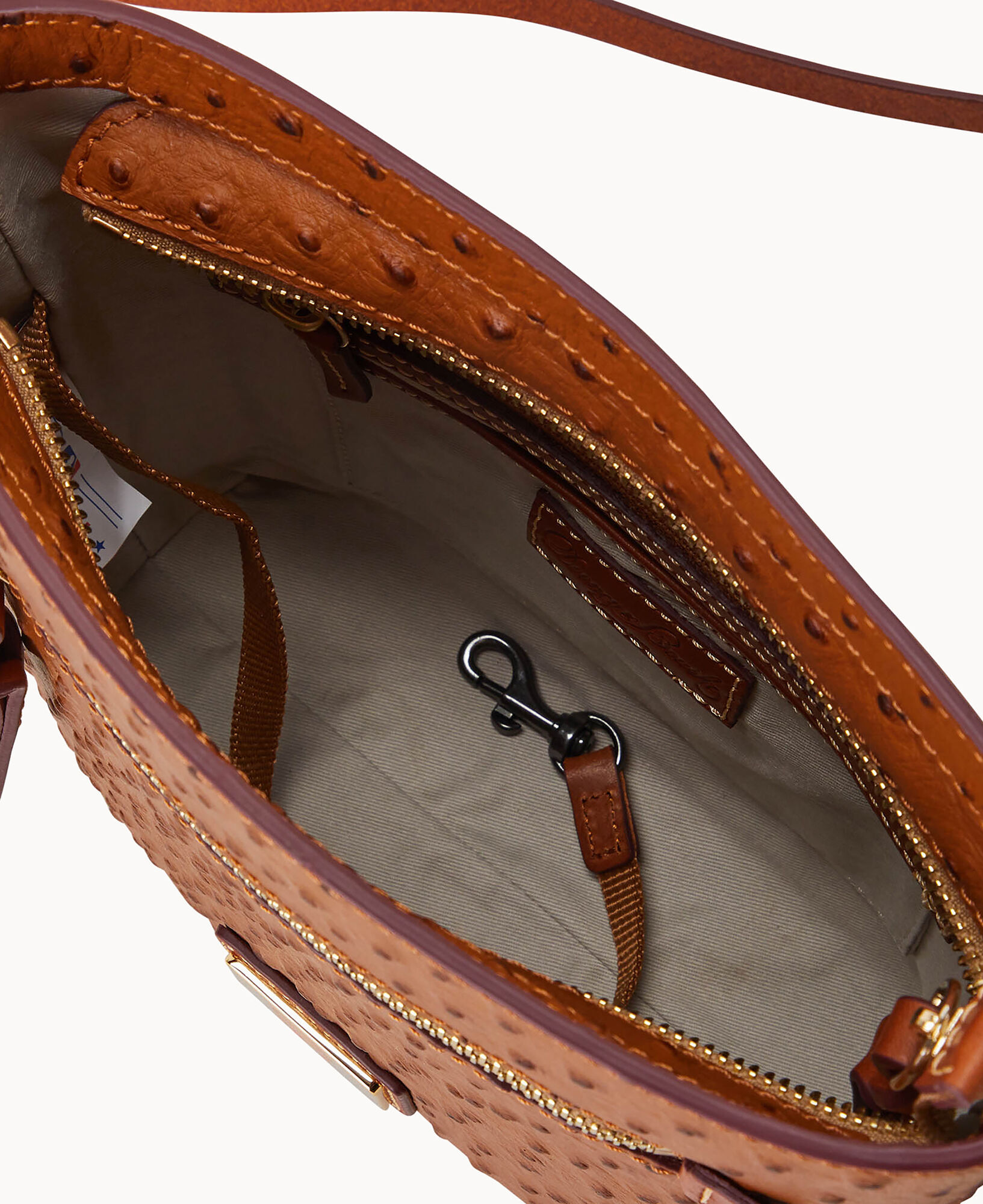 One outside zip pocket. One inside zip pocket. Two inside pockets. Cell phone pocket. Inside key hook. Adjustable shoulder strap. Strap drop length 26″. Feet. Zipper closure.