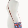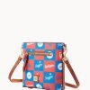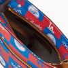 One outside zip pocket. One inside zip pocket. Two inside pockets. Inside key hook. Adjustable, detachable shoulder strap. Strap drop length 26″. Lined. Feet. Zipper closure.