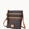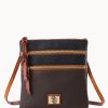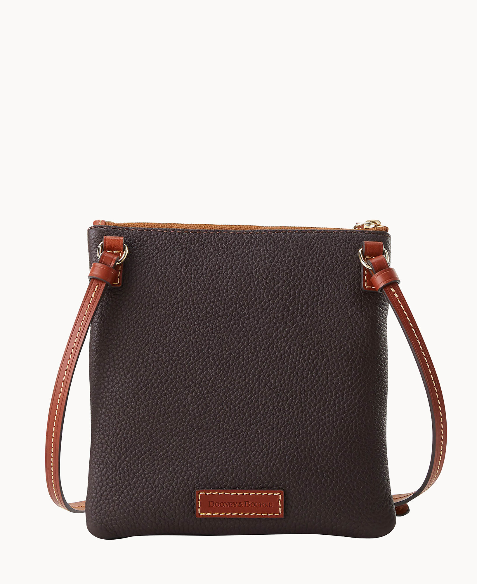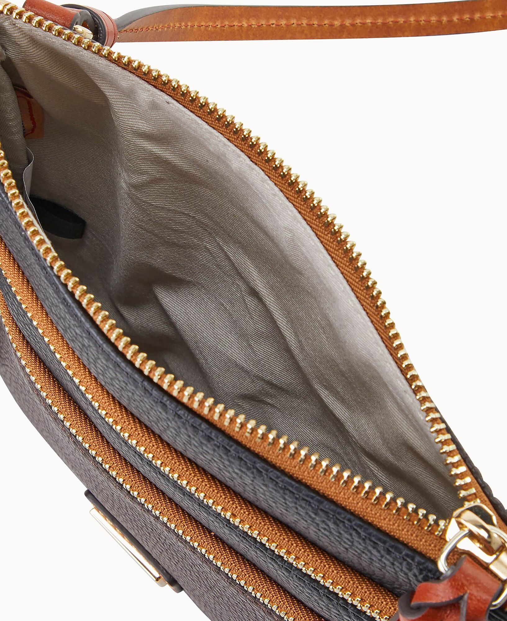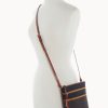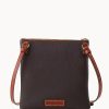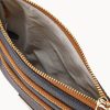 Two outside zip pockets. Cell phone pocket. Adjustable shoulder strap. Strap drop length 24″. Lined. Zipper closure.