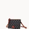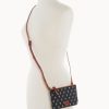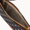 One inside zip pocket. Two inside pockets. Cell phone pocket. Inside key hook. Strap drop length 21″. Lined. Feet. Zipper closure.