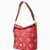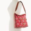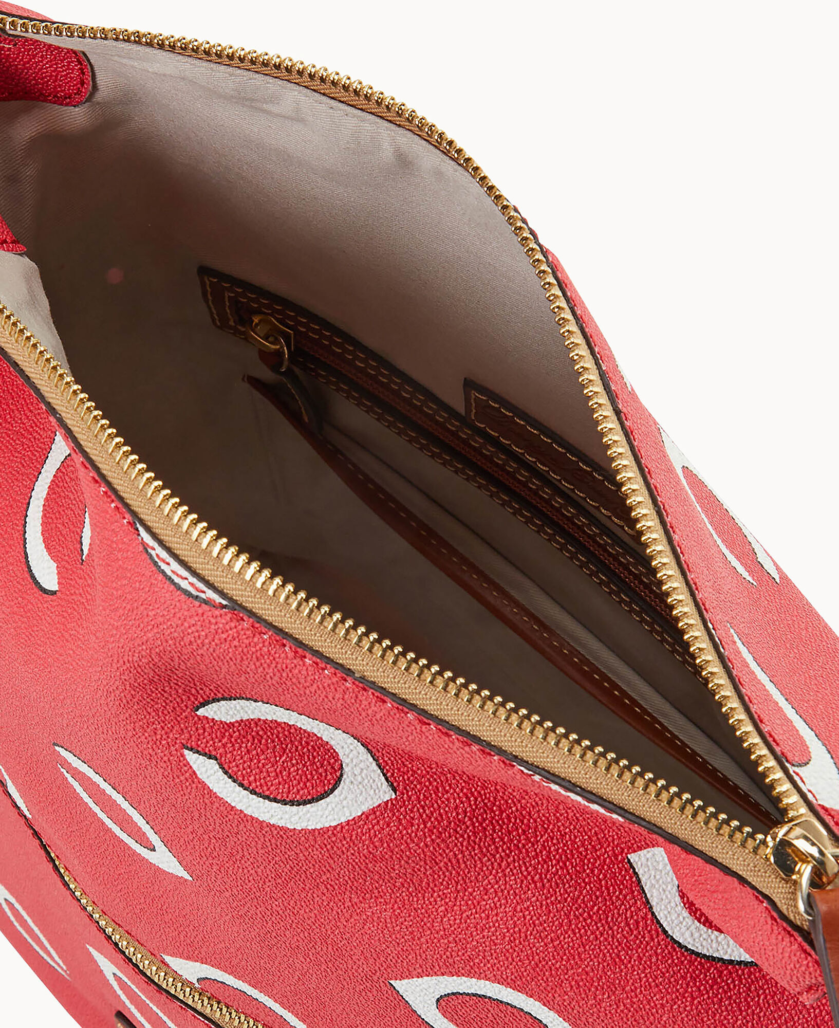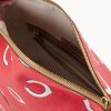 One outside zip pocket. One inside zip pocket. Two inside pockets. Cell phone pocket. Inside key hook. Handle drop length 13″. Lined. Zipper closure.