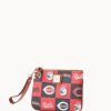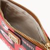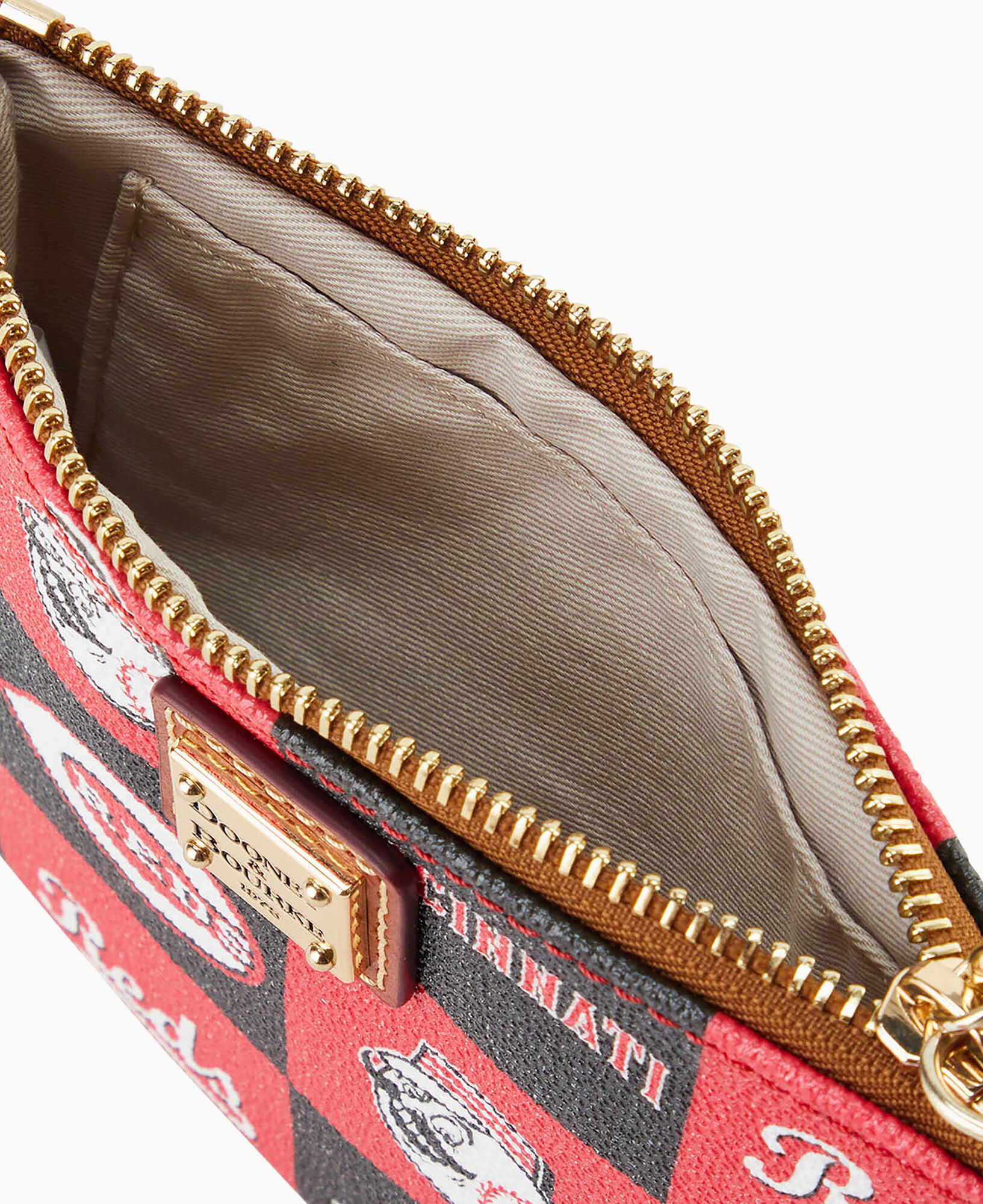 One inside pocket. Four credit card slots. Detachable wrist strap. Lined. Zipper closure.