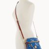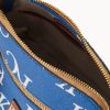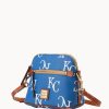 One outside zip pocket. Two inside pockets. Inside key hook. Adjustable, detachable shoulder strap. Strap drop length 24.5″. Lined. Feet. Zipper closure.