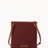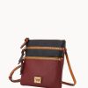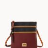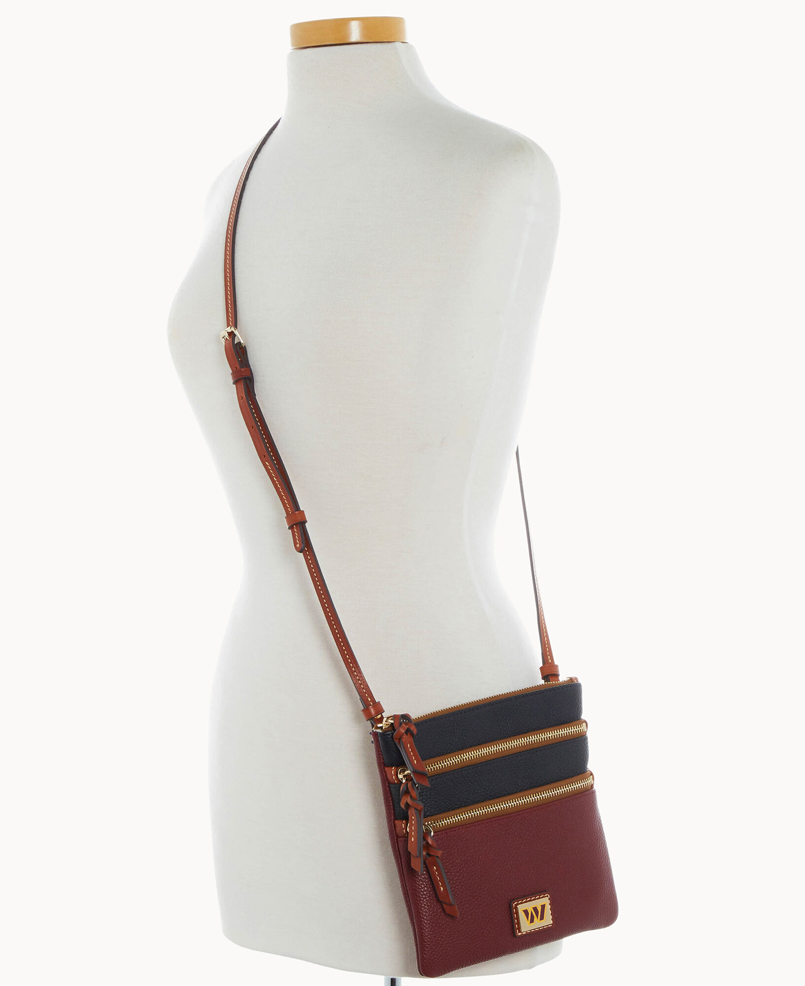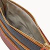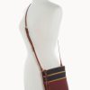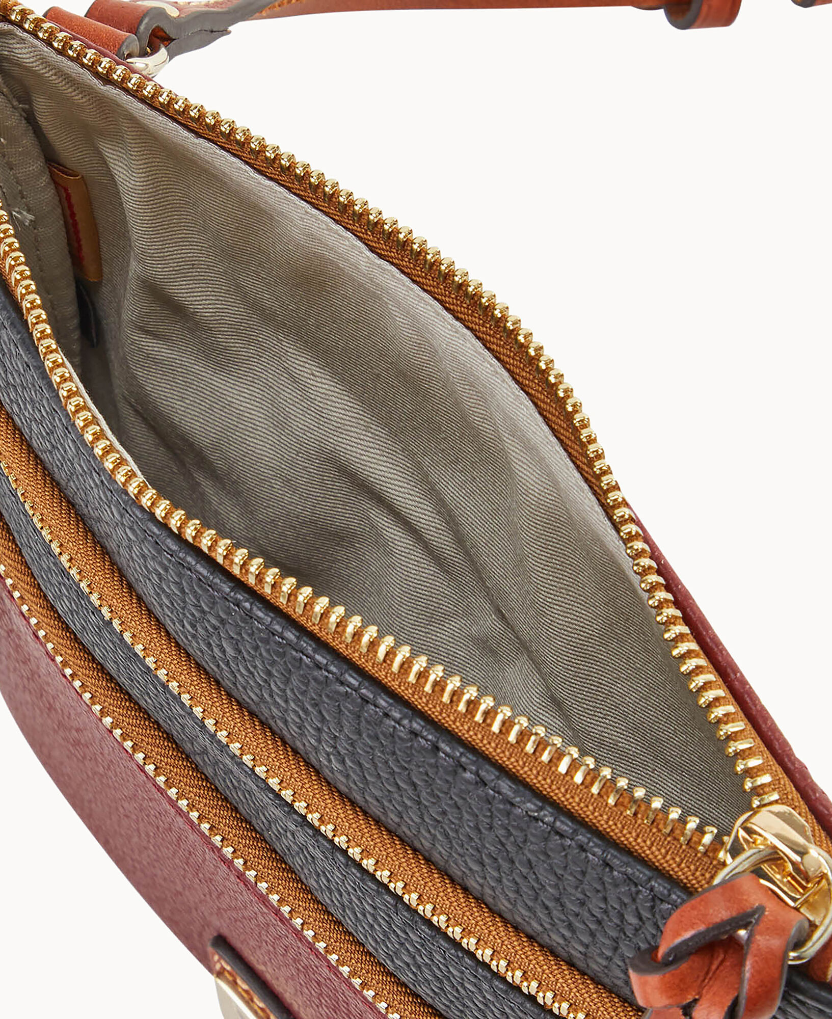 Two outside zip pockets. Cell phone pocket. Adjustable shoulder strap. Strap drop length 24″. Lined. Zipper closure.