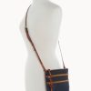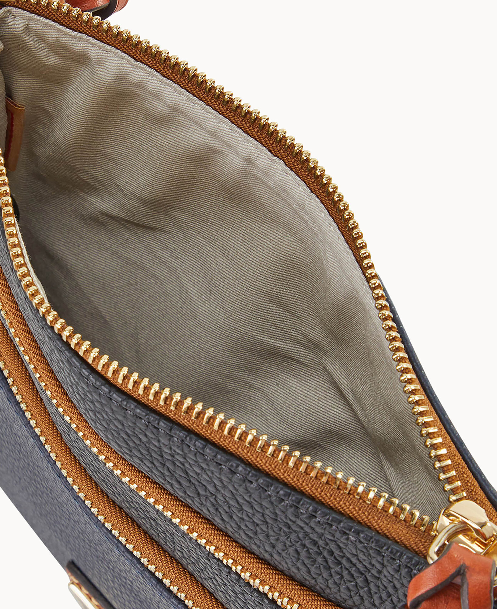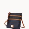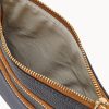 Two outside zip pockets. Cell phone pocket. Adjustable shoulder strap. Strap drop length 24″. Lined. Zipper closure.