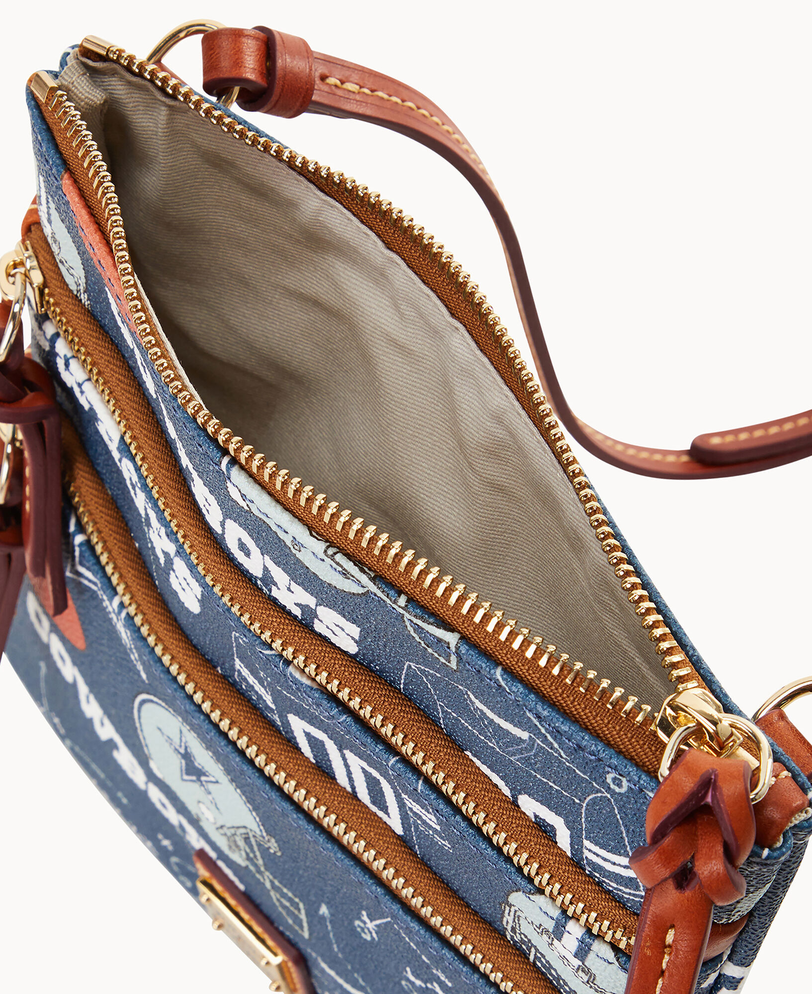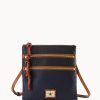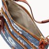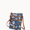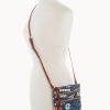 Two outside zip pockets. Cell phone pocket. Adjustable shoulder strap. Strap drop length 24″. Lined. Zipper closure.
