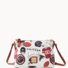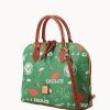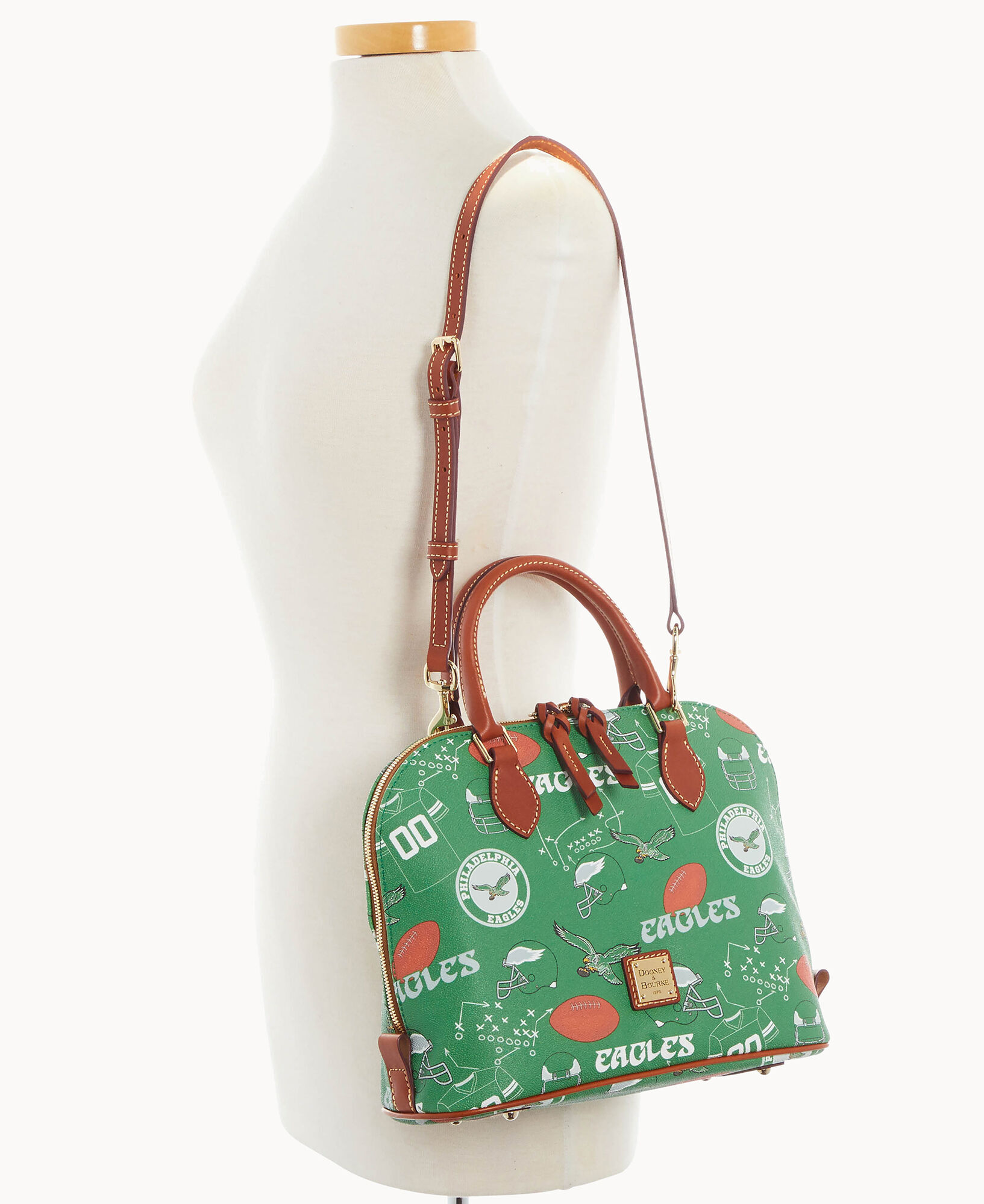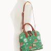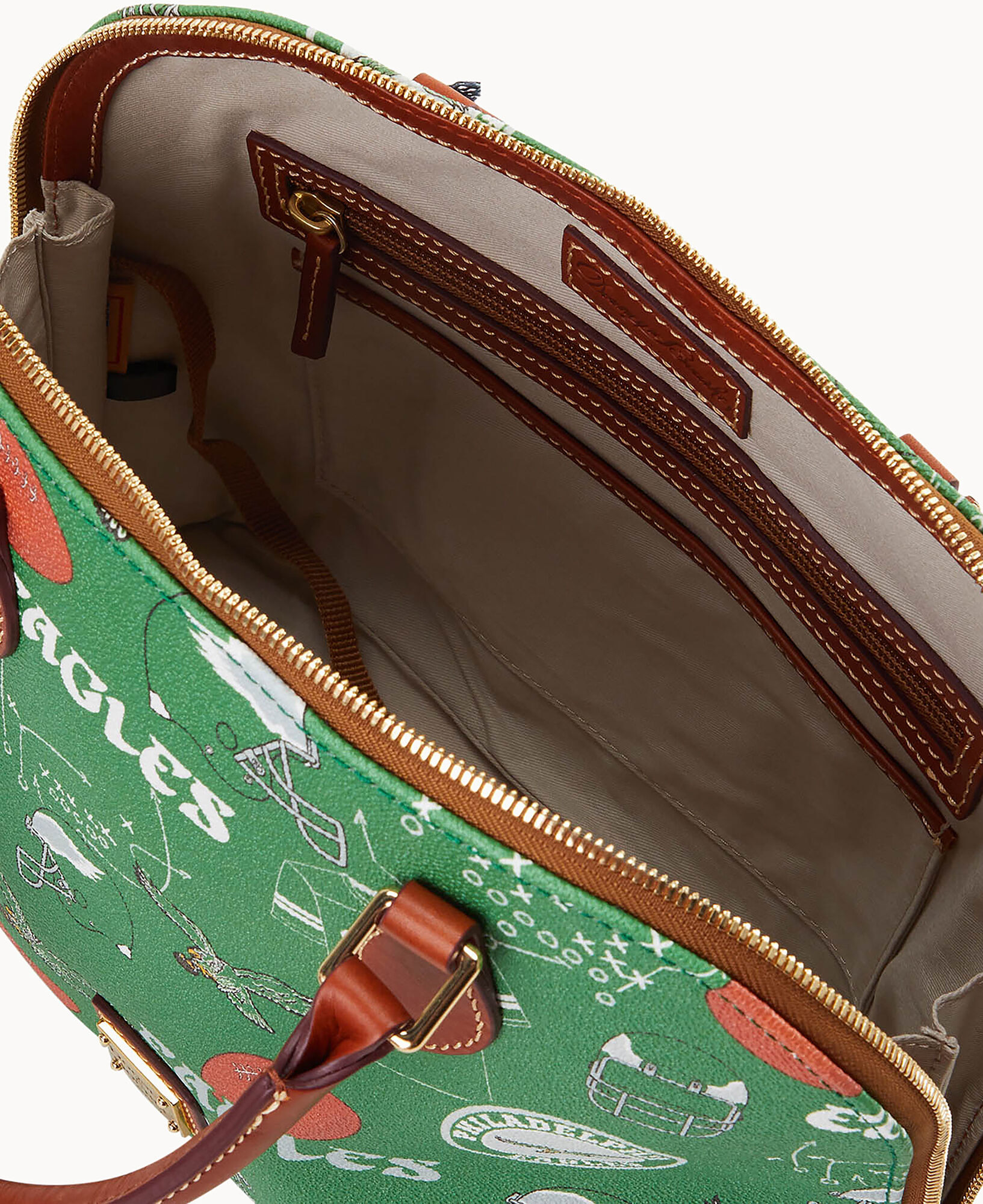 One inside zip pocket. Two inside pockets. Cell phone pocket. Inside key hook. Handle drop length 4″. Adjustable, detachable shoulder strap. Strap drop length 15.5″. Lined. Feet. Zipper closure.