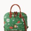 One inside zip pocket. Two inside pockets. Cell phone pocket. Inside key hook. Handle drop length 4″. Adjustable, detachable shoulder strap. Strap drop length 15.5″. Lined. Feet. Zipper closure.