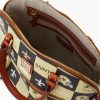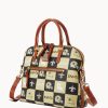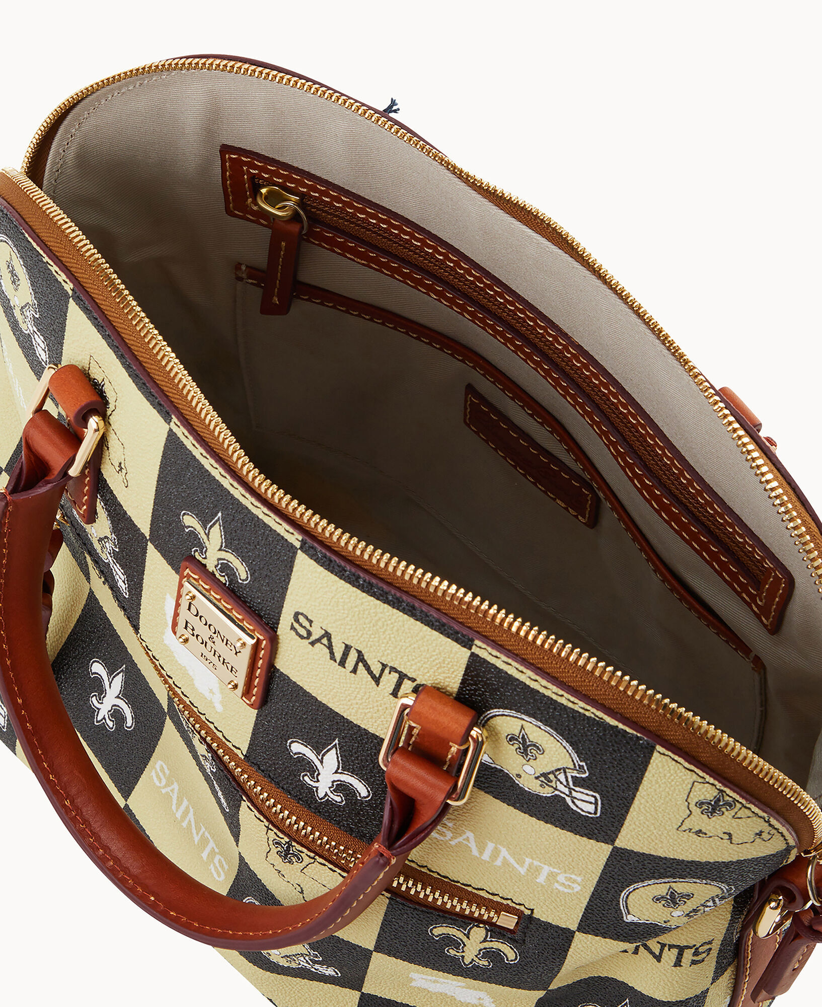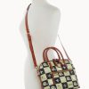 One outside zip pocket. One inside zip pocket. Two inside pockets. Cell phone pocket. Inside key hook. Handle drop length 5″. Adjustable, detachable shoulder strap. Strap drop length 21″. Lined. Feet. Zipper closure.