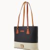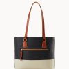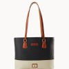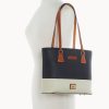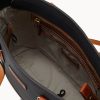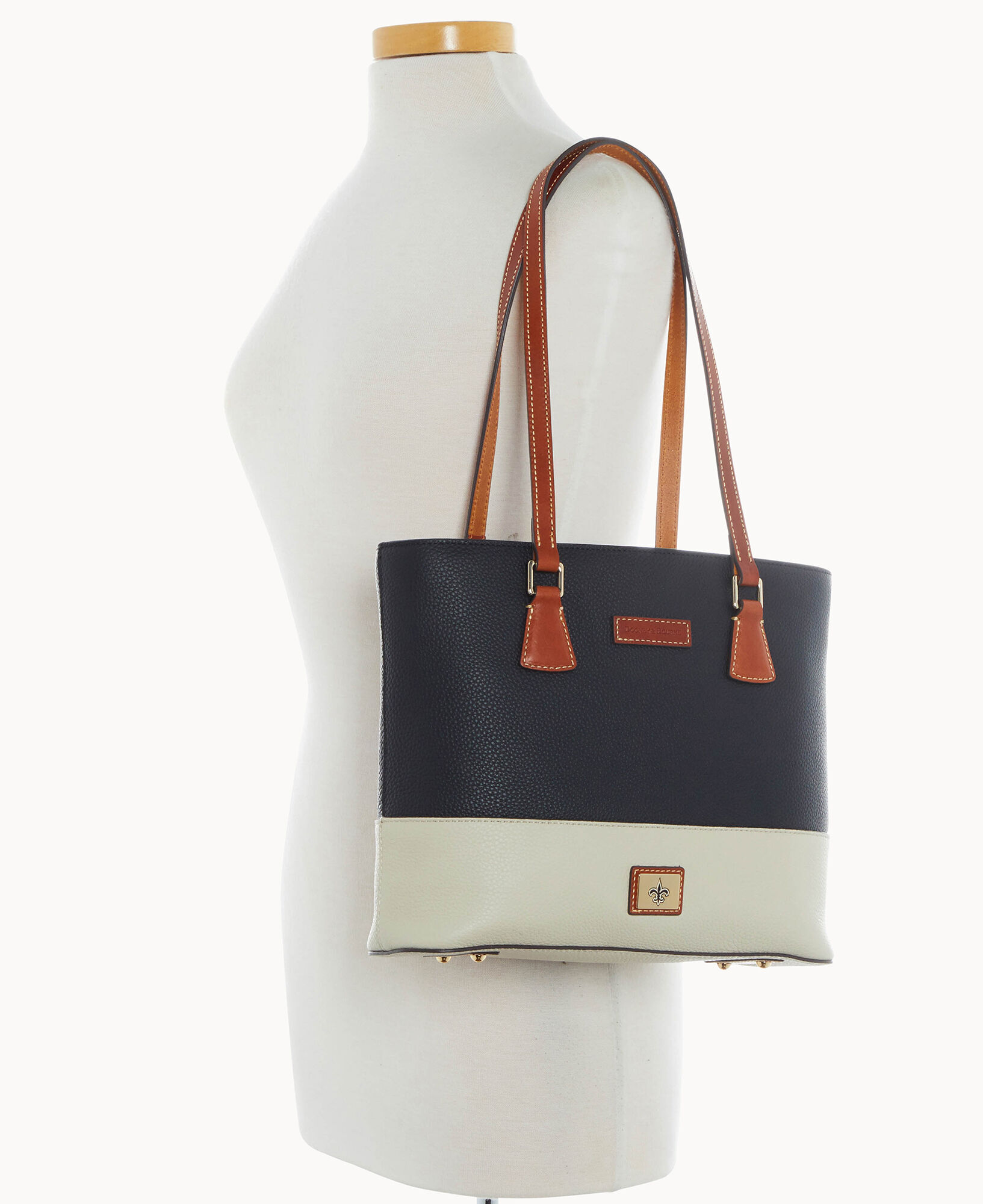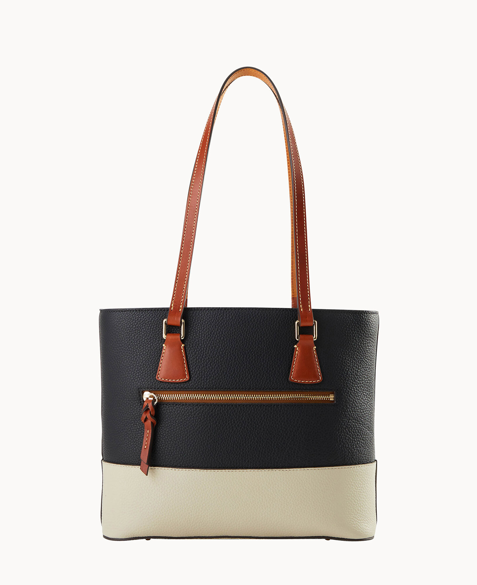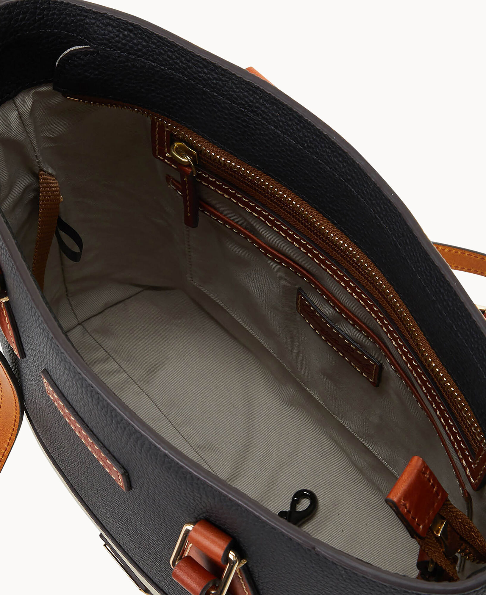 One outside zip pocket. Three inside pockets. One inside zip pocket. One inside key hook. Handle drop length 12″. Zipper closure. Feet. Lined.