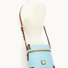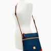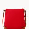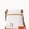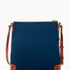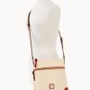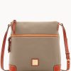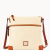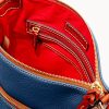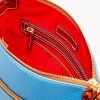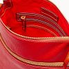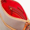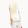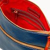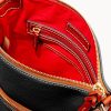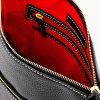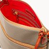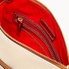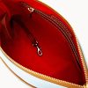 One outside zip pocket. One inside zip pocket. Two inside pockets. Cell phone pocket. Inside key hook. Adjustable shoulder strap. Strap drop length 25″. Lined. Zipper closure.