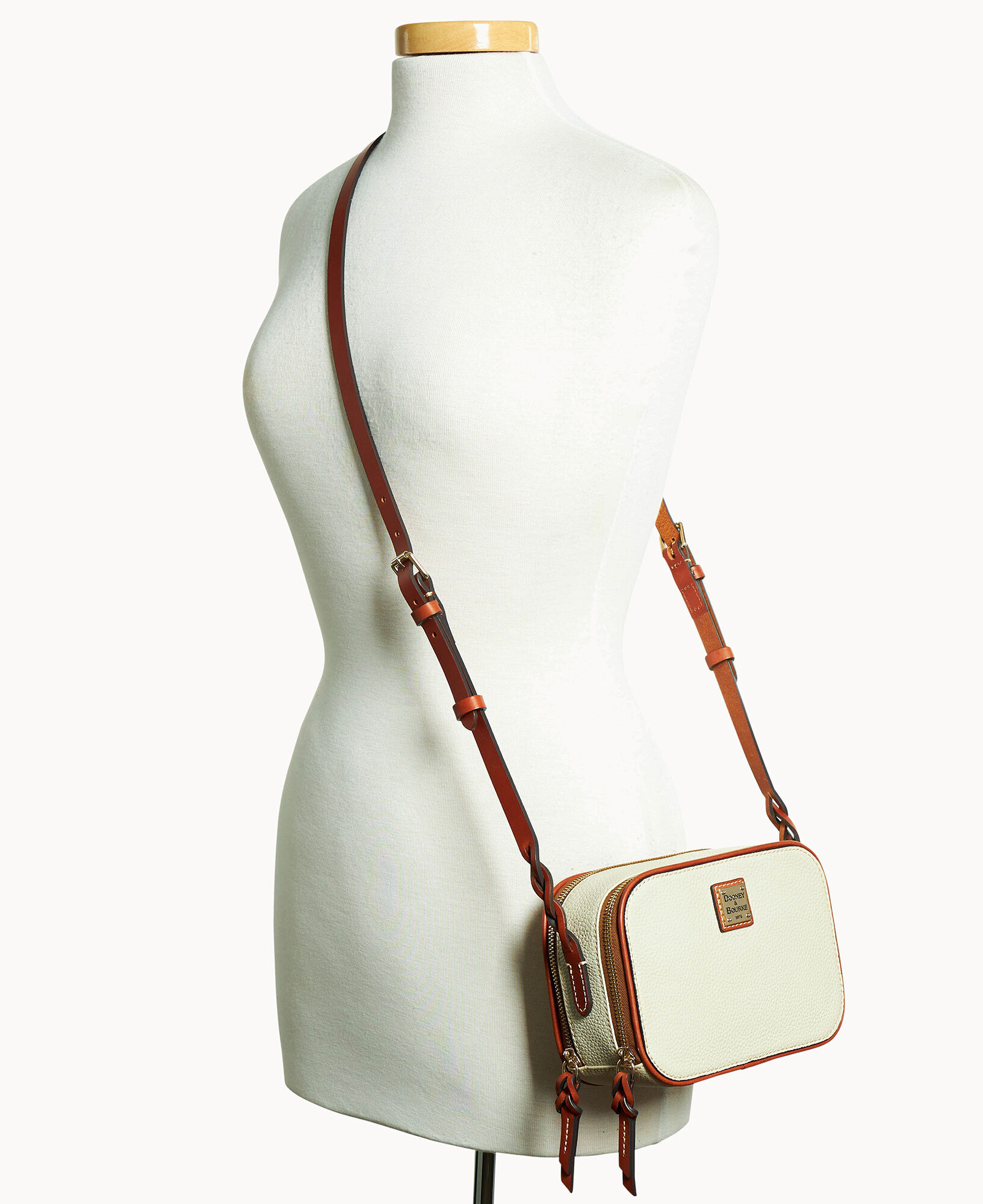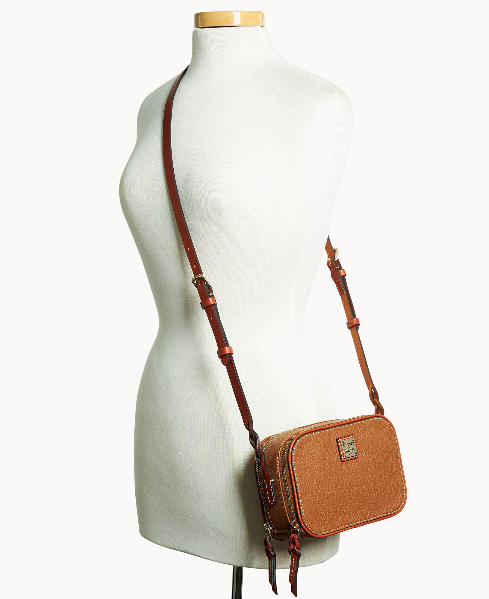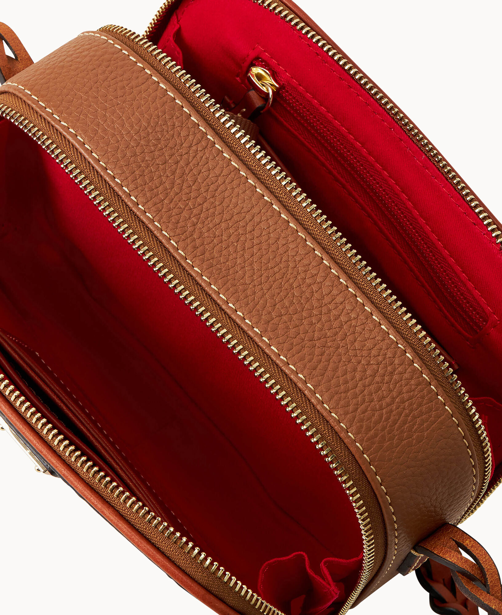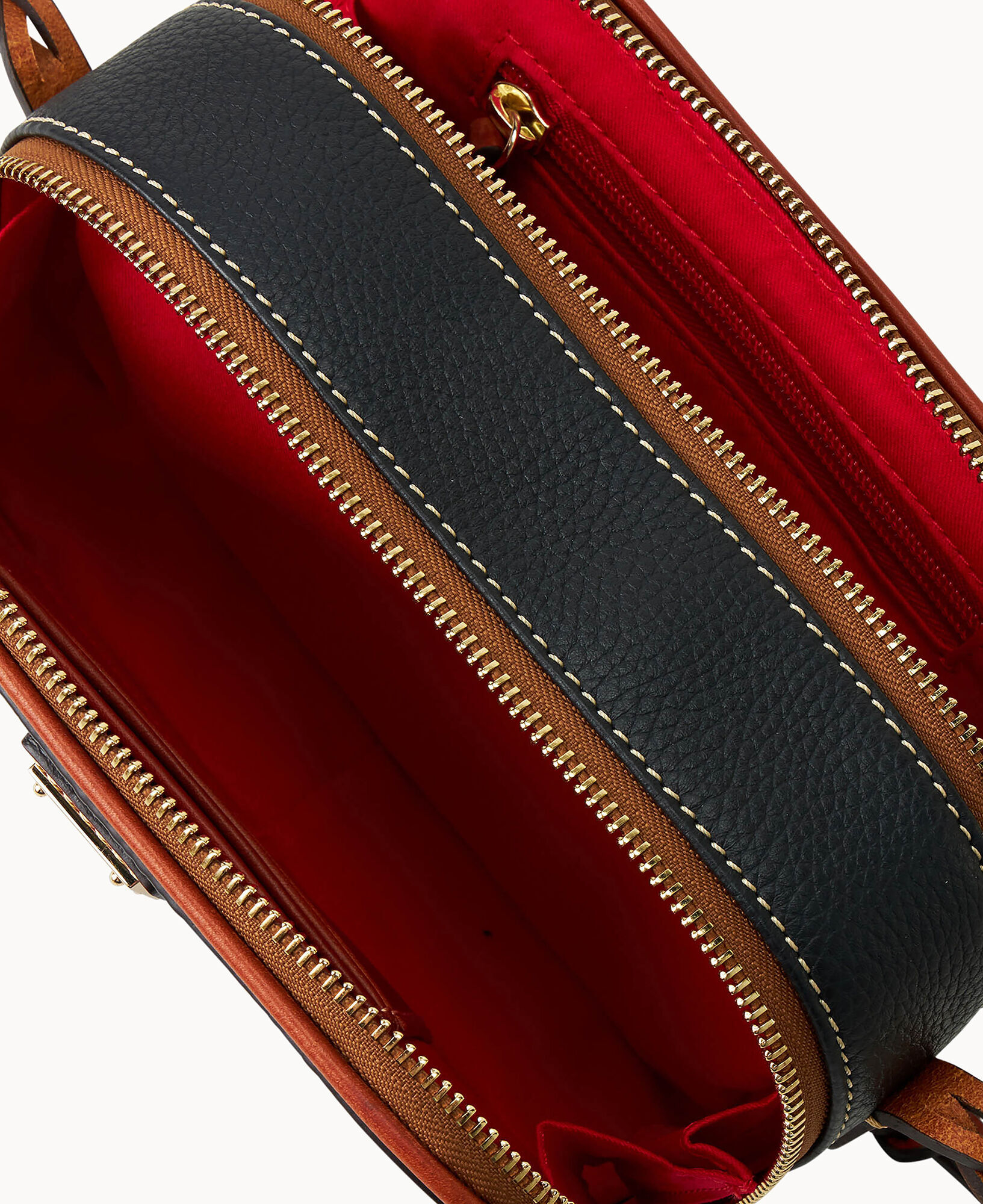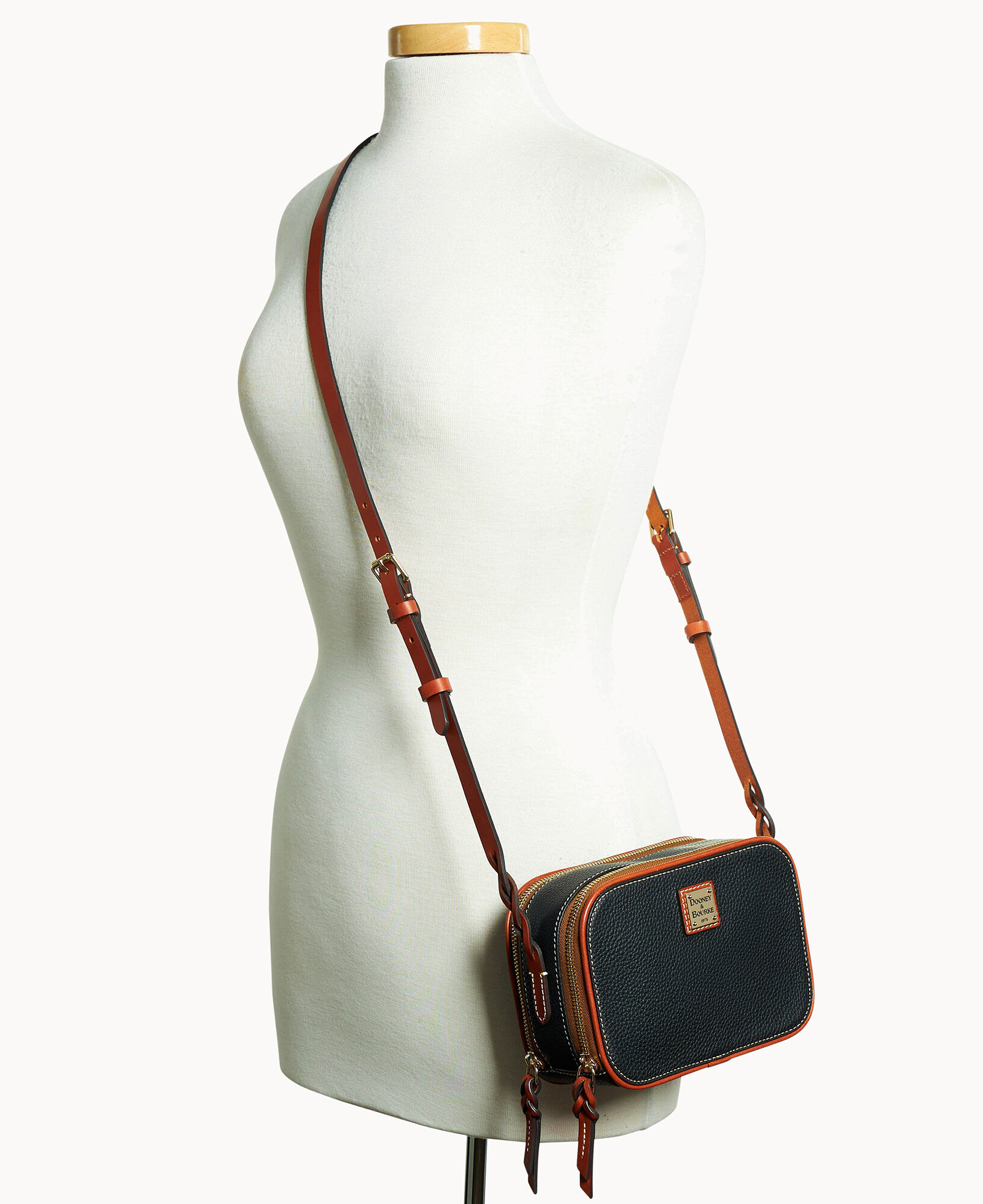 One outside pocket. Two zipper compartments. Four inside credit card slots. One inside zipper pocket. One inside pocket. Inside key hook. Adjustable shoulder strap. Shoulder strap drop length 23.5″. Lined. Zipper closure.