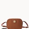 One outside pocket. Two zipper compartments. Four inside credit card slots. One inside zipper pocket. One inside pocket. Inside key hook. Adjustable shoulder strap. Shoulder strap drop length 23.5″. Lined. Zipper closure.