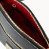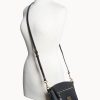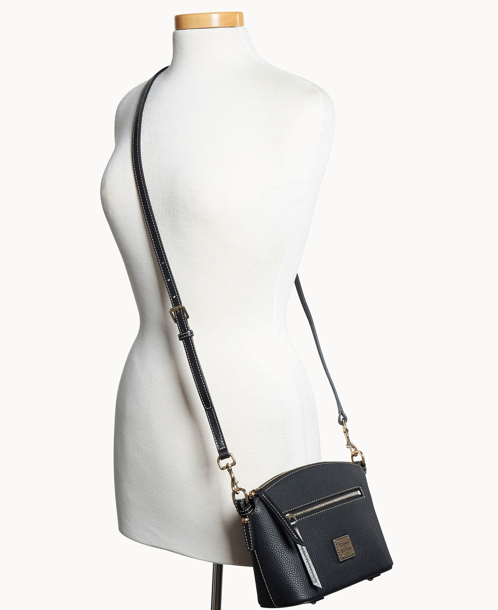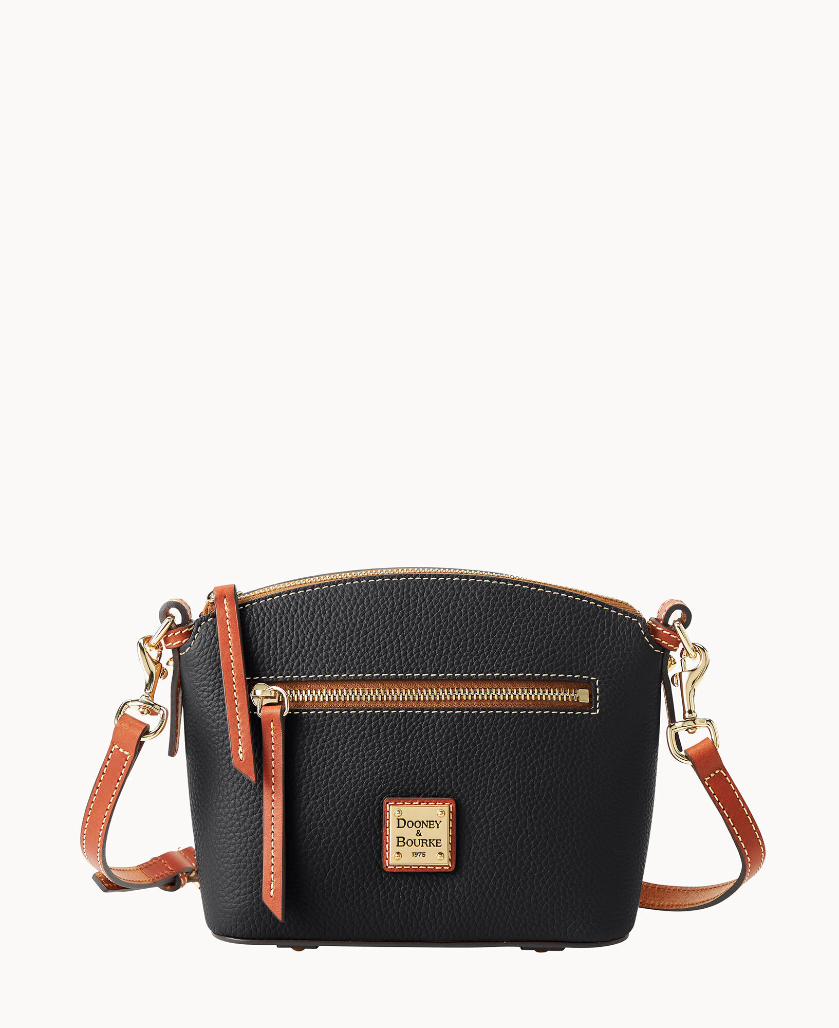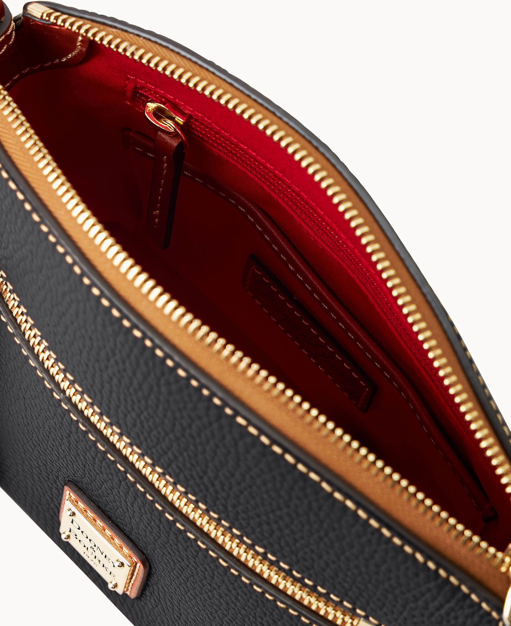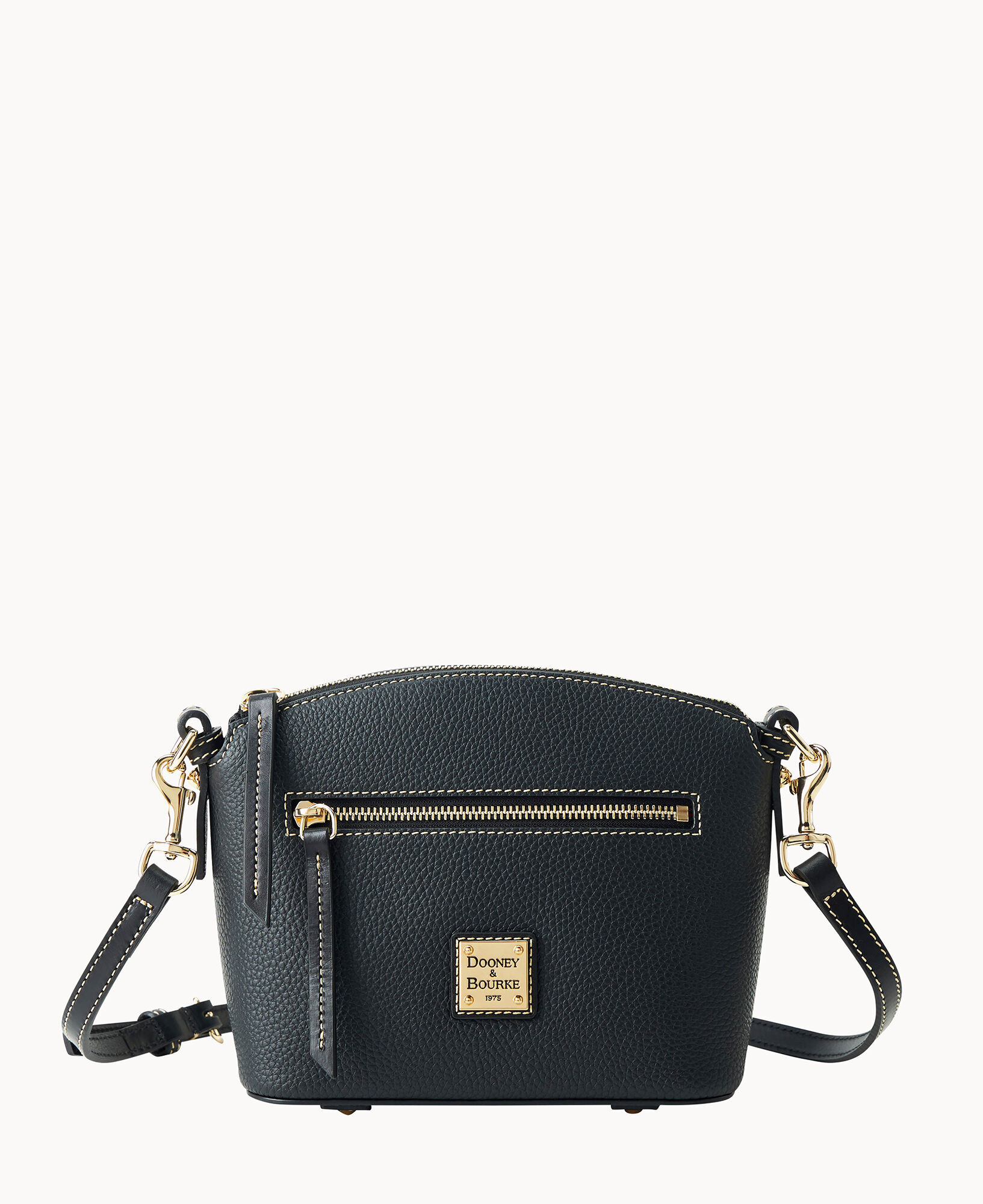 One outside zip pocket. One inside zip pocket. One inside pocket. Inside key hook. Adjustable, detachable shoulder strap. Strap drop length 27″. Lined. Feet. Zipper closure.