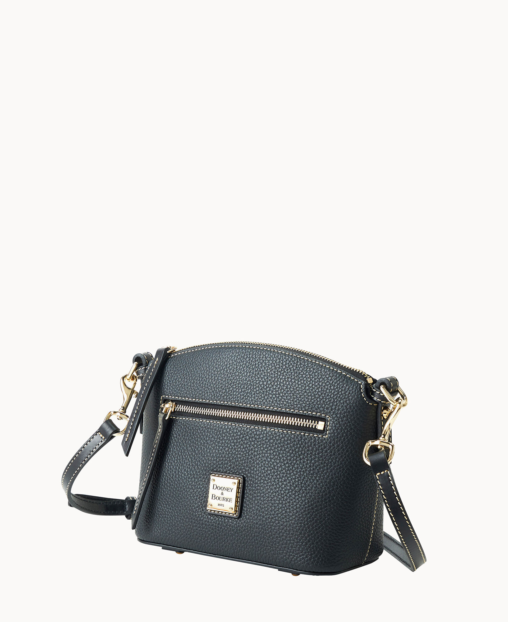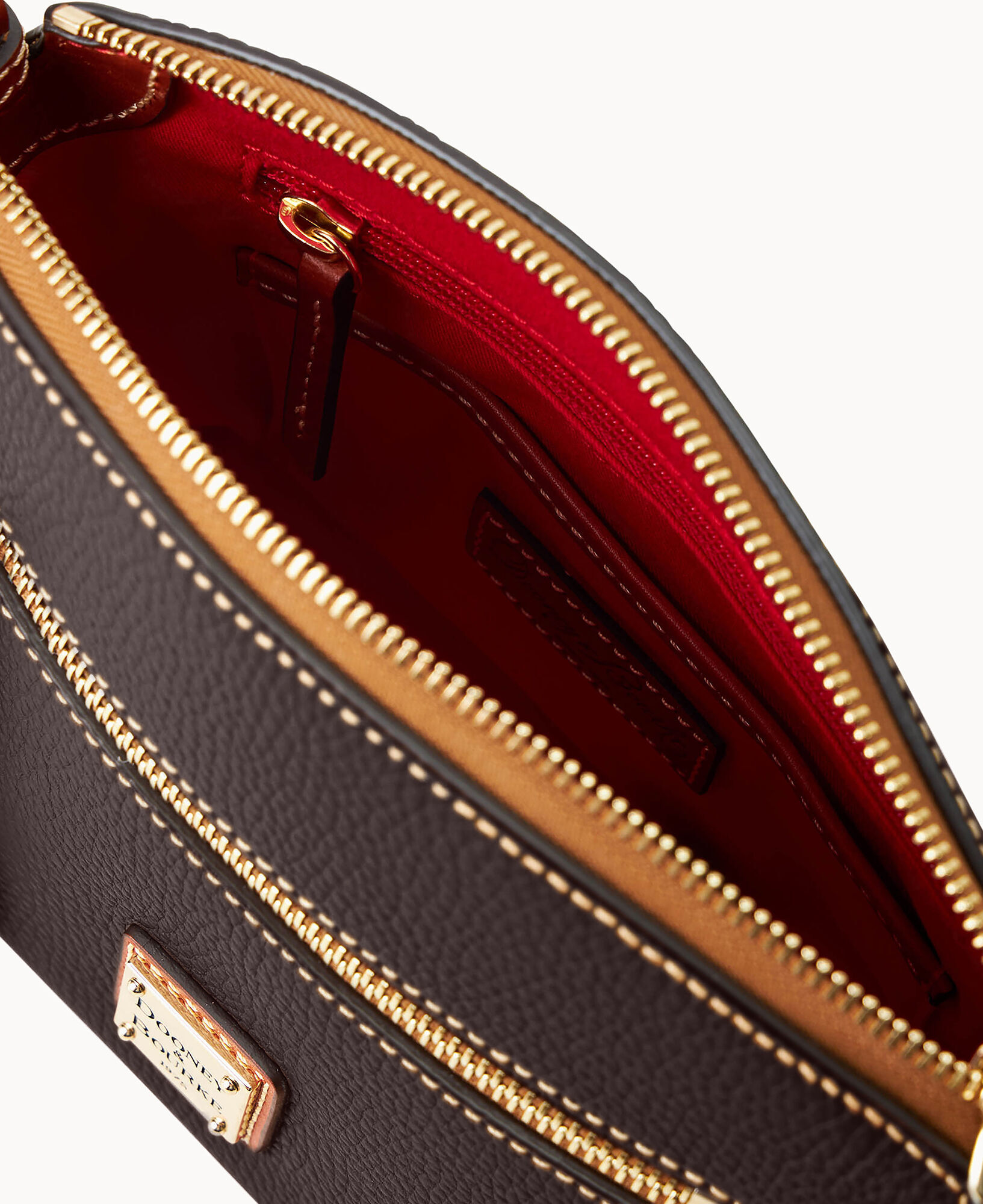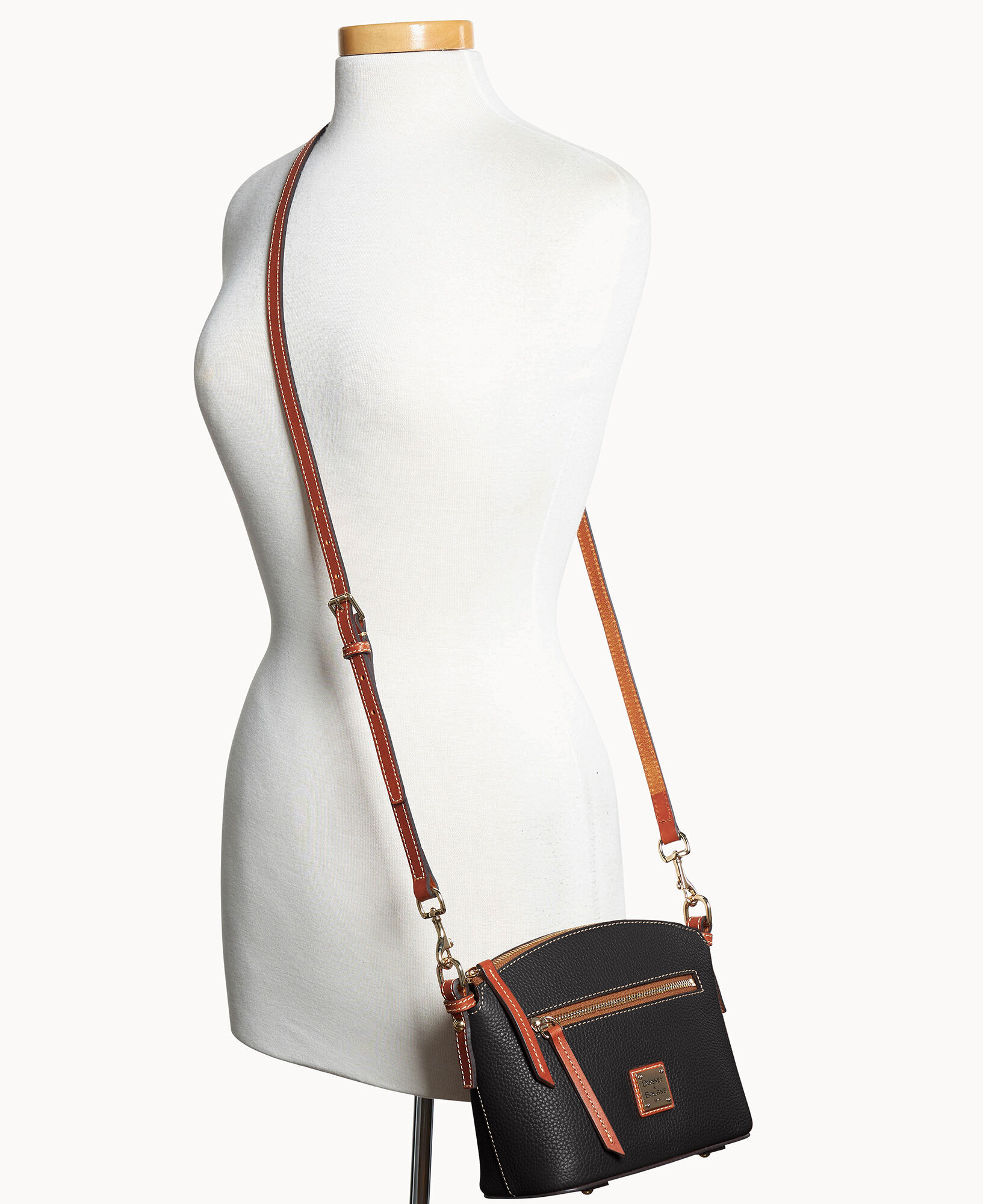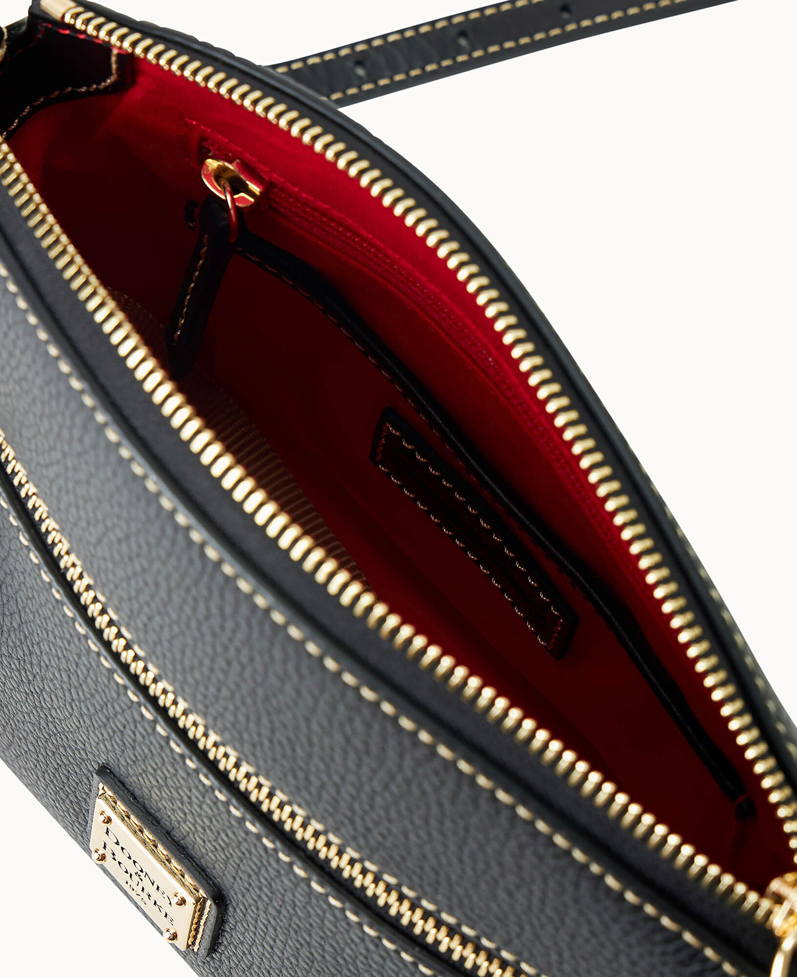 One outside zip pocket. One inside zip pocket. One inside pocket. Inside key hook. Adjustable, detachable shoulder strap. Strap drop length 27″. Lined. Feet. Zipper closure.