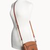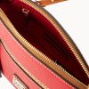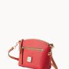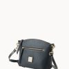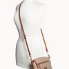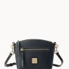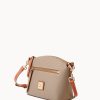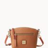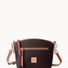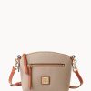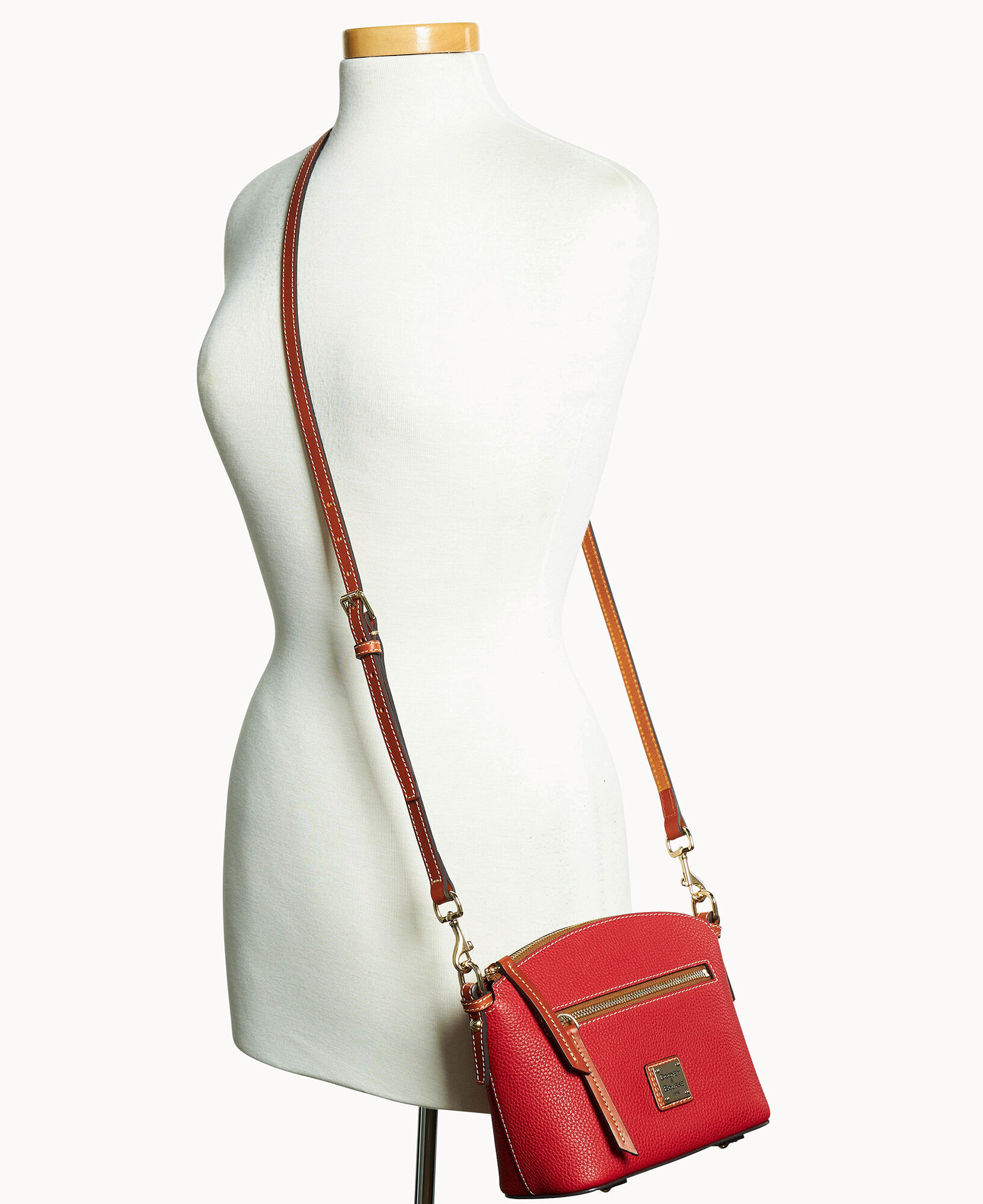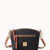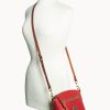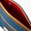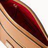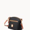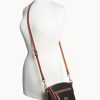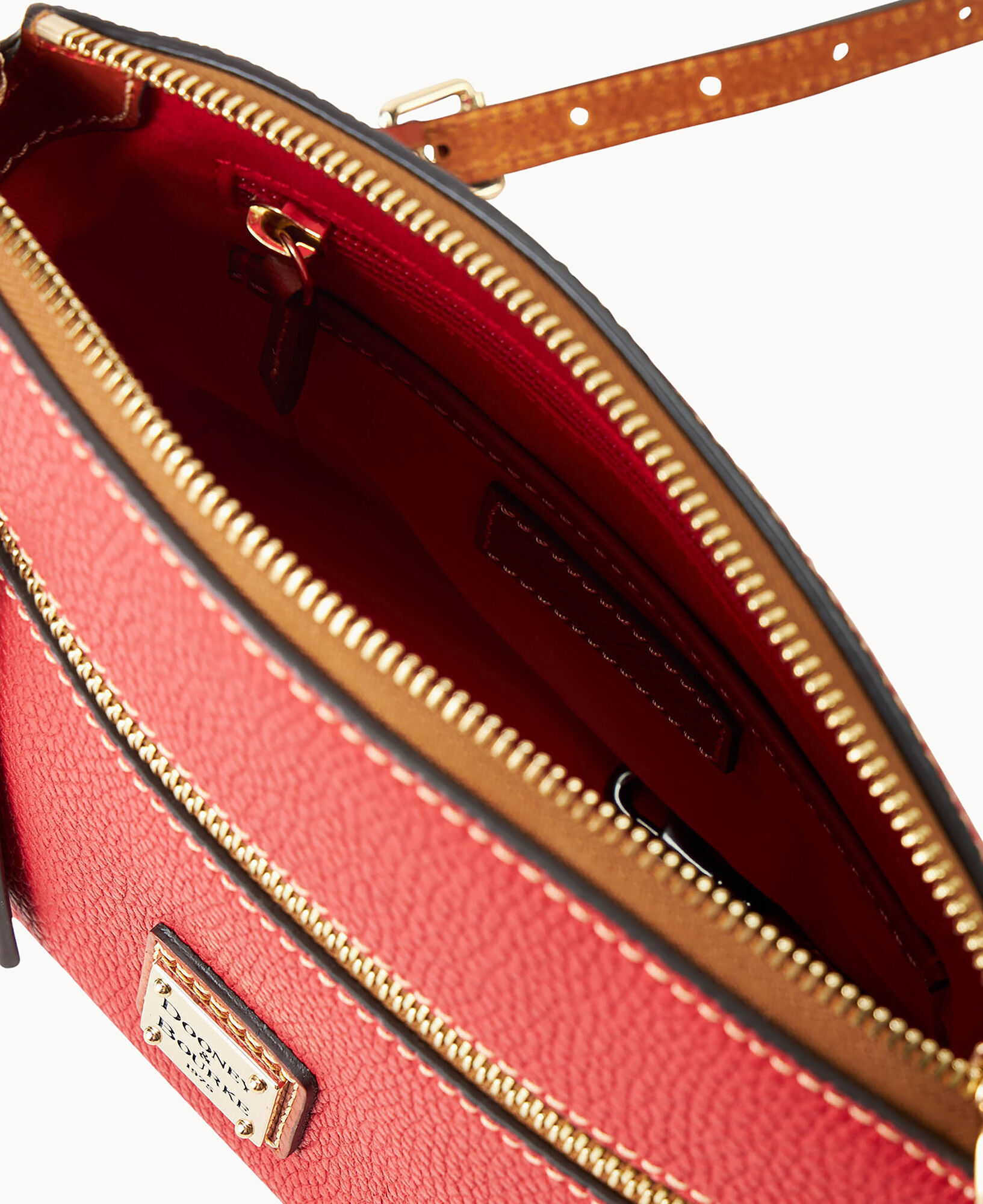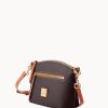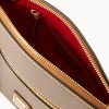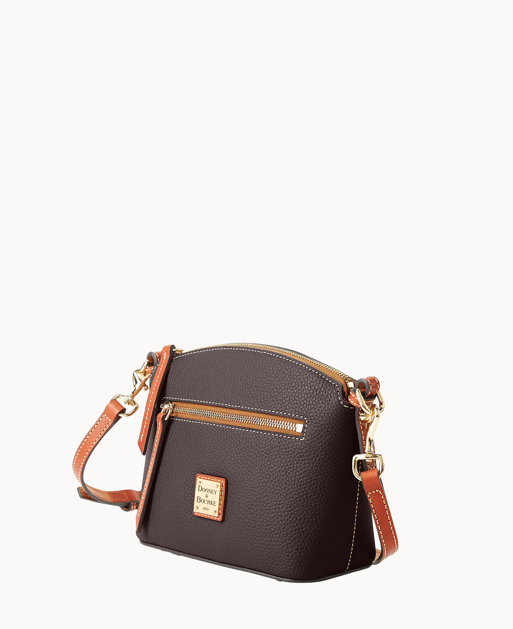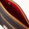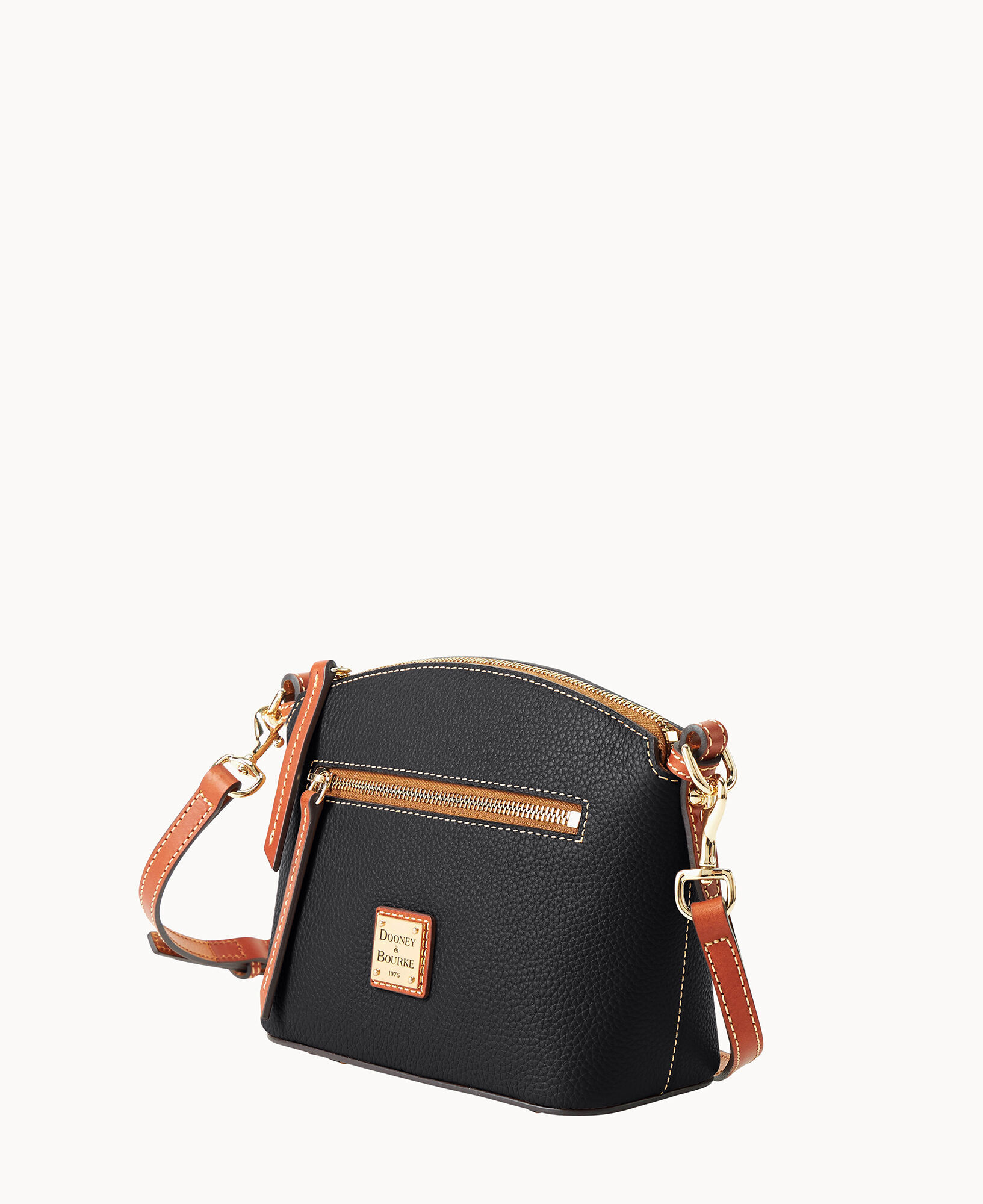 One outside zip pocket. One inside zip pocket. One inside pocket. Inside key hook. Adjustable, detachable shoulder strap. Strap drop length 27″. Lined. Feet. Zipper closure.