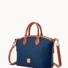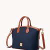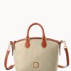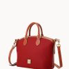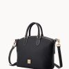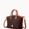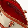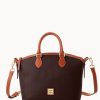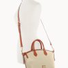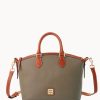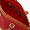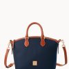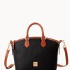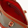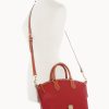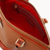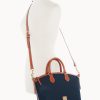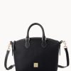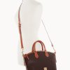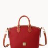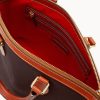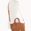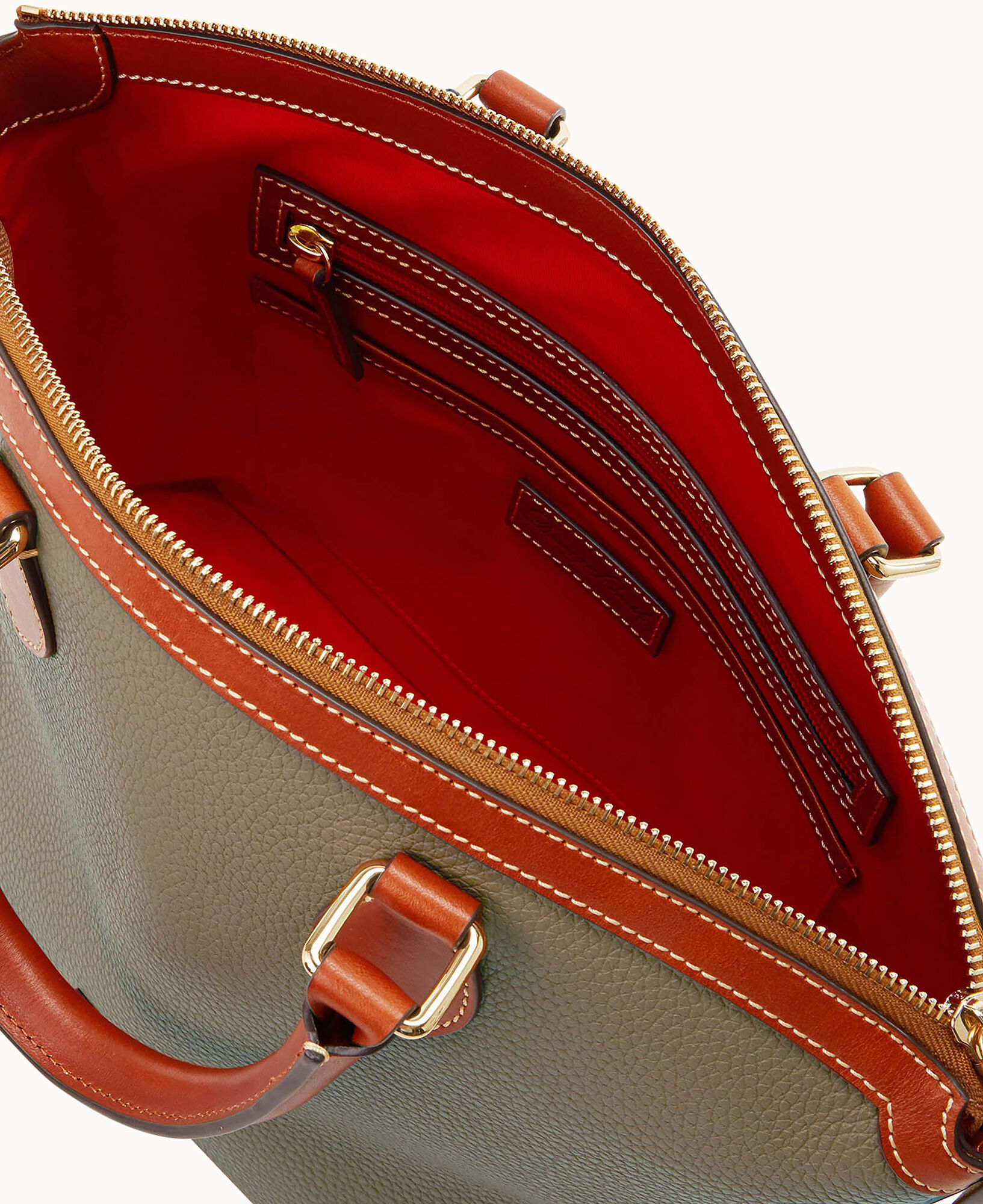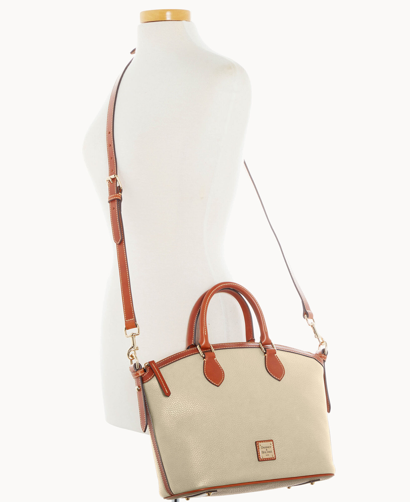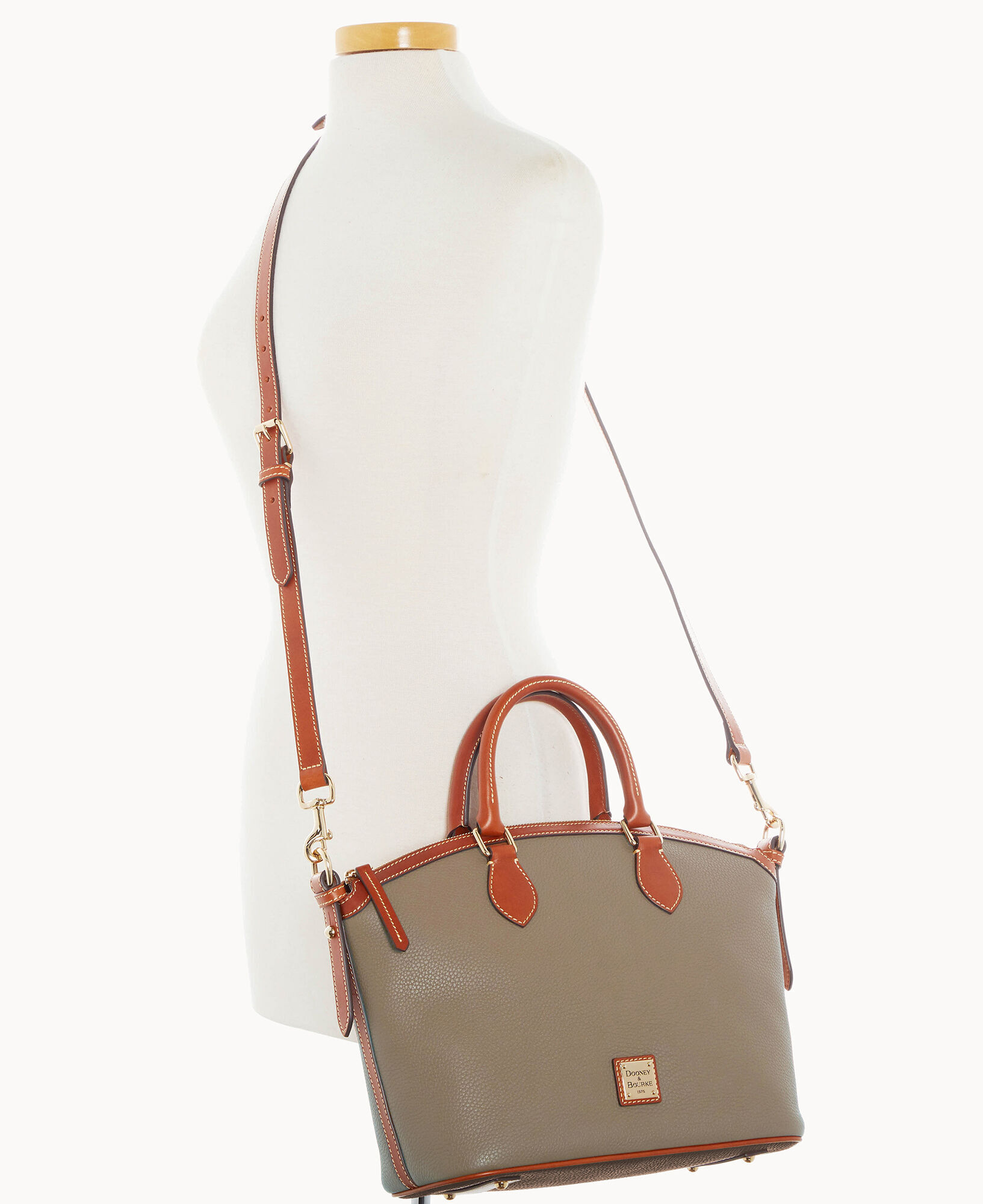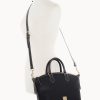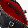 One outside zip pocket. Two inside slip pockets. One inside phone pocket. Inside key hook. Adjustable strap. Detachable strap. Strap drop length 23″. Handle drop length 4.5″. Feet. Lined. Zipper closure.