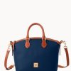 One outside zip pocket. Two inside slip pockets. One inside phone pocket. Inside key hook. Adjustable strap. Detachable strap. Strap drop length 23″. Handle drop length 4.5″. Feet. Lined. Zipper closure.