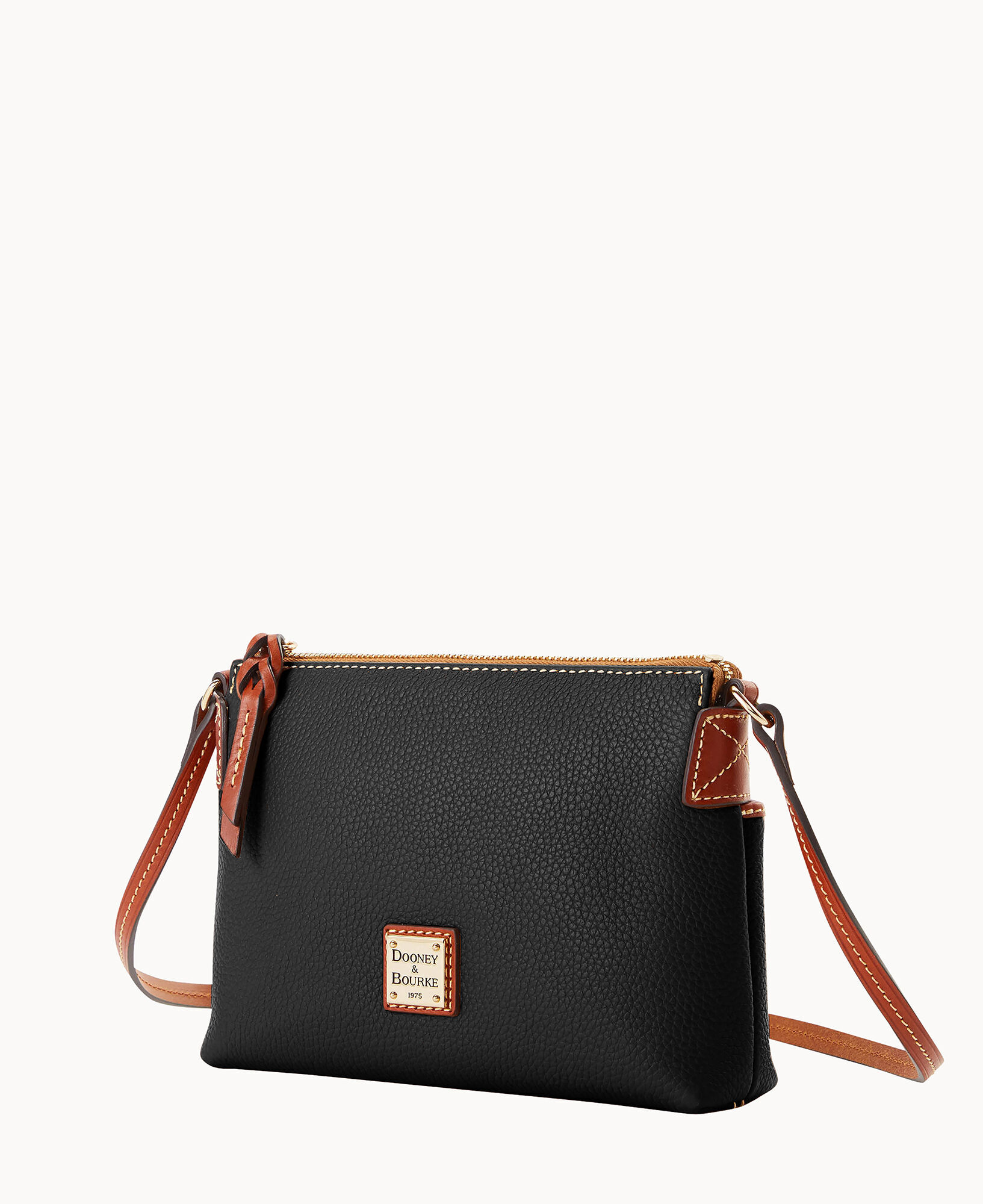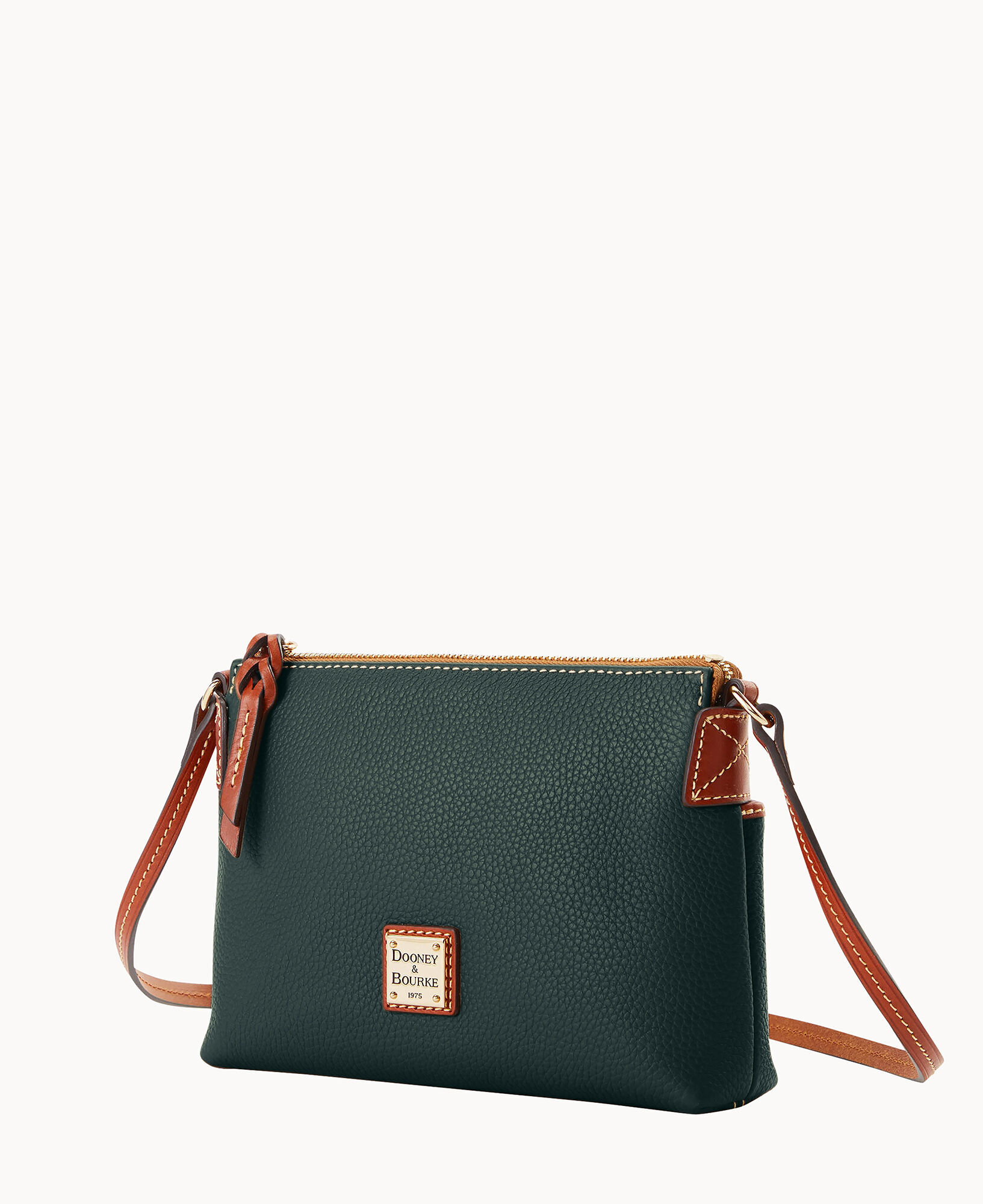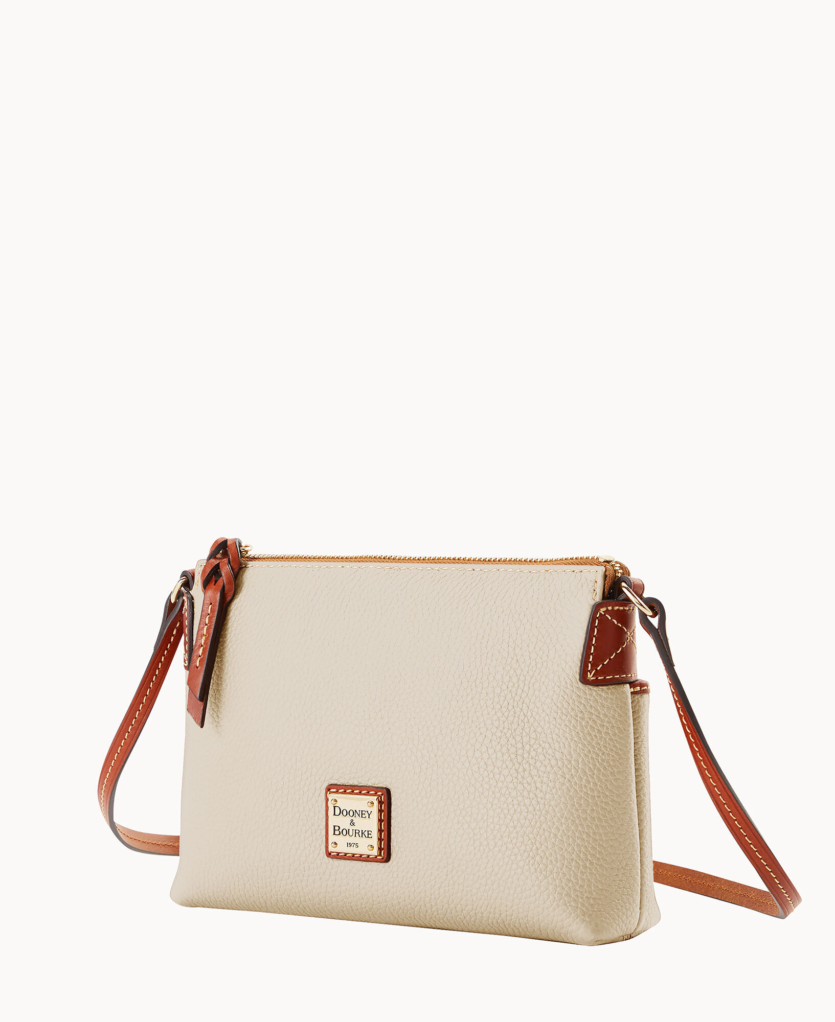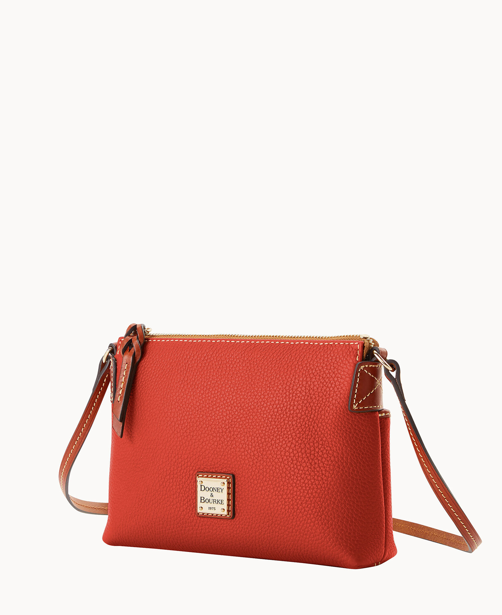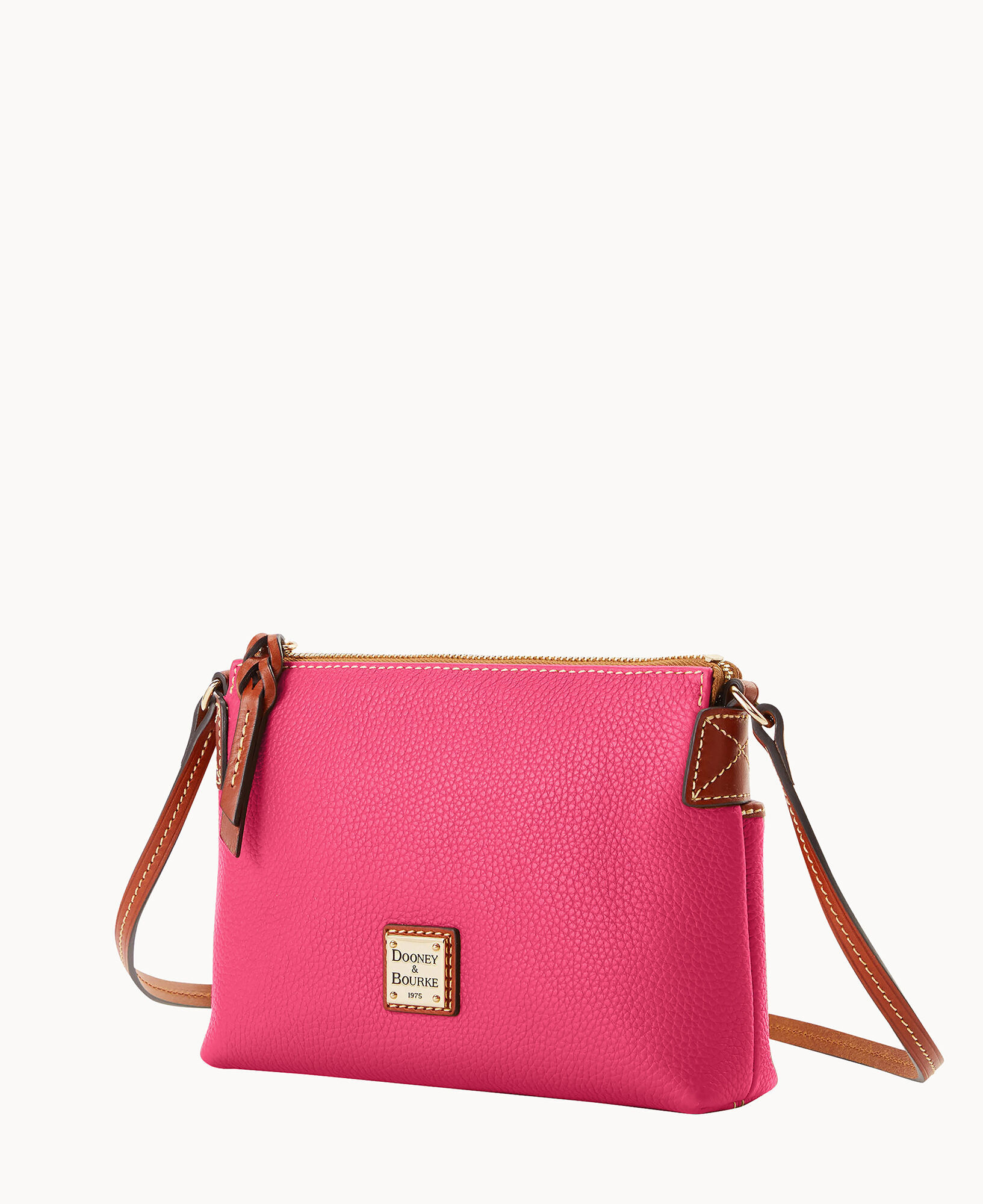 One outside slip pocket. One inside zip pocket. One inside slip pocket. Inside key hook. Adjustable strap.Strap drop length 28″. Lined. Zipper closure.