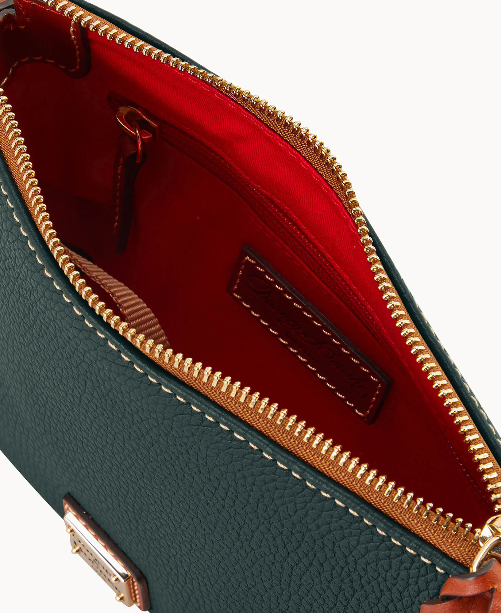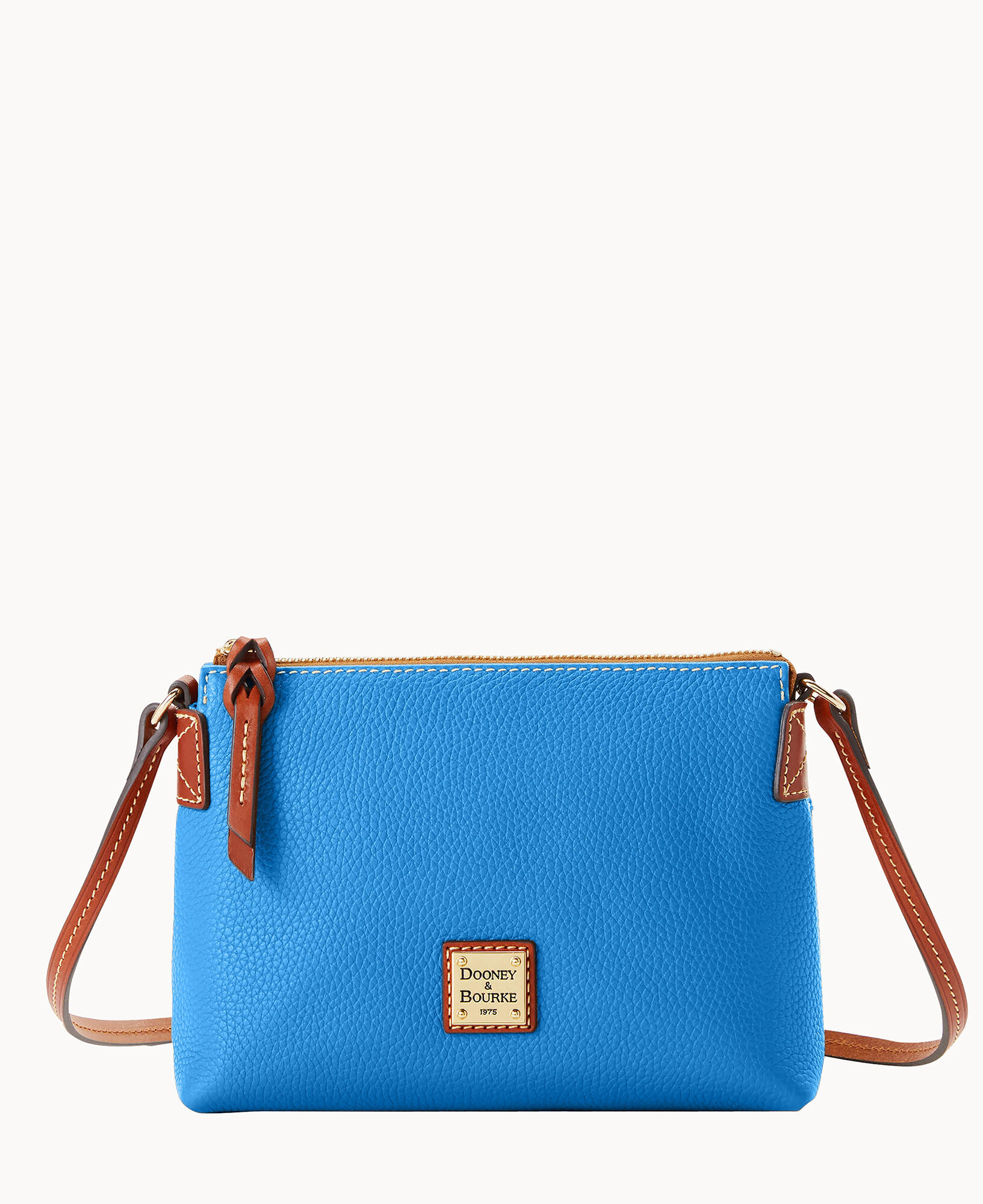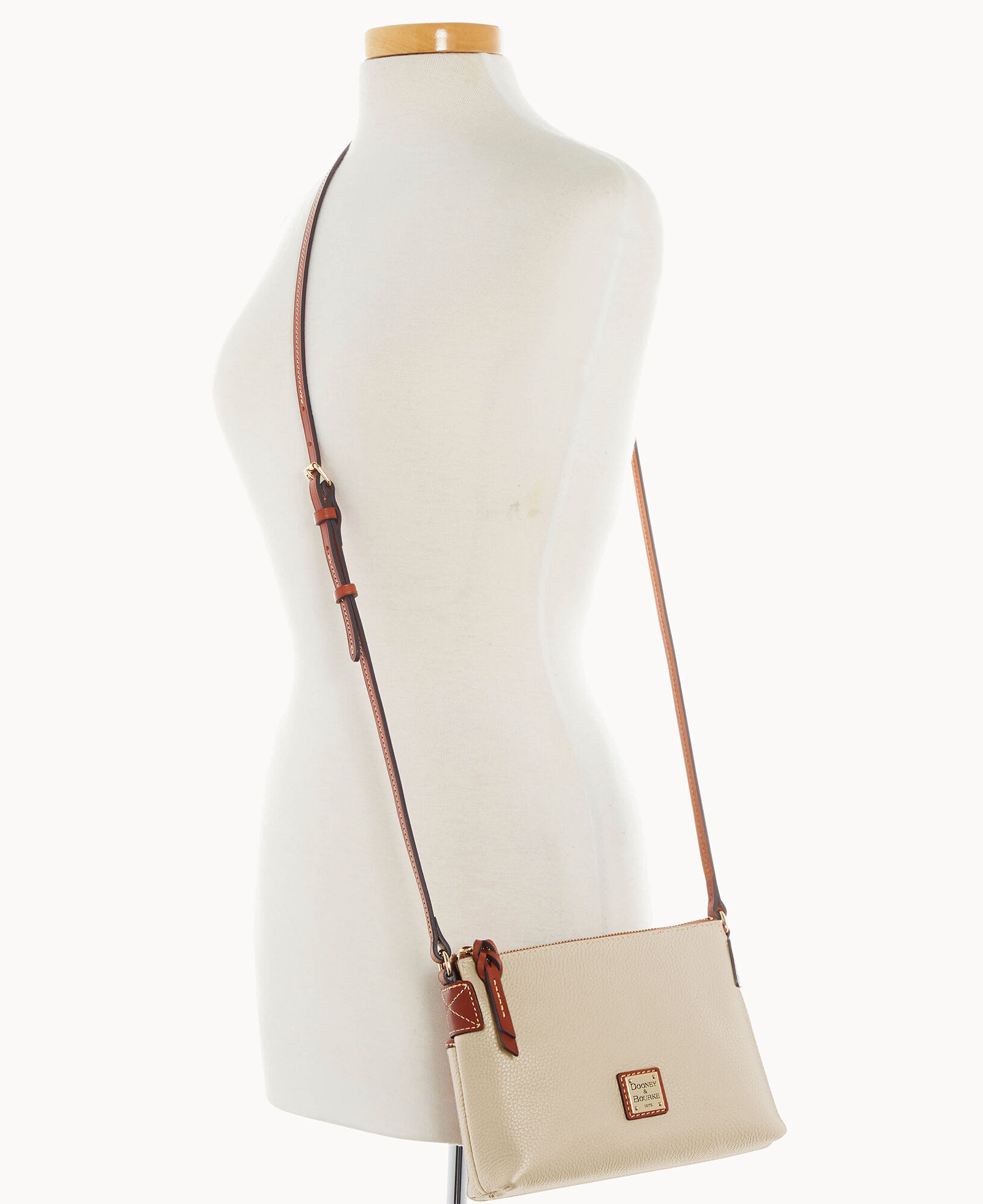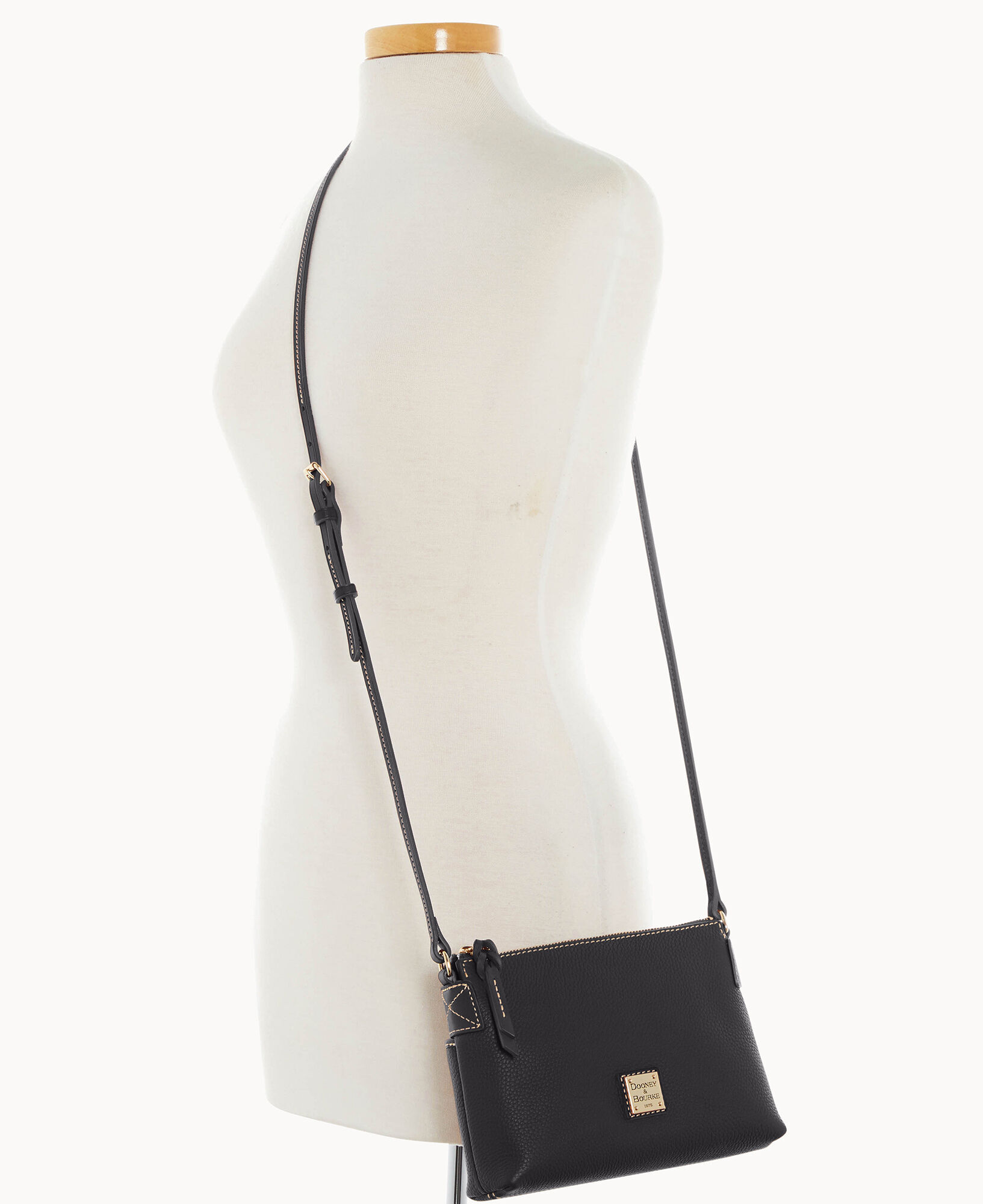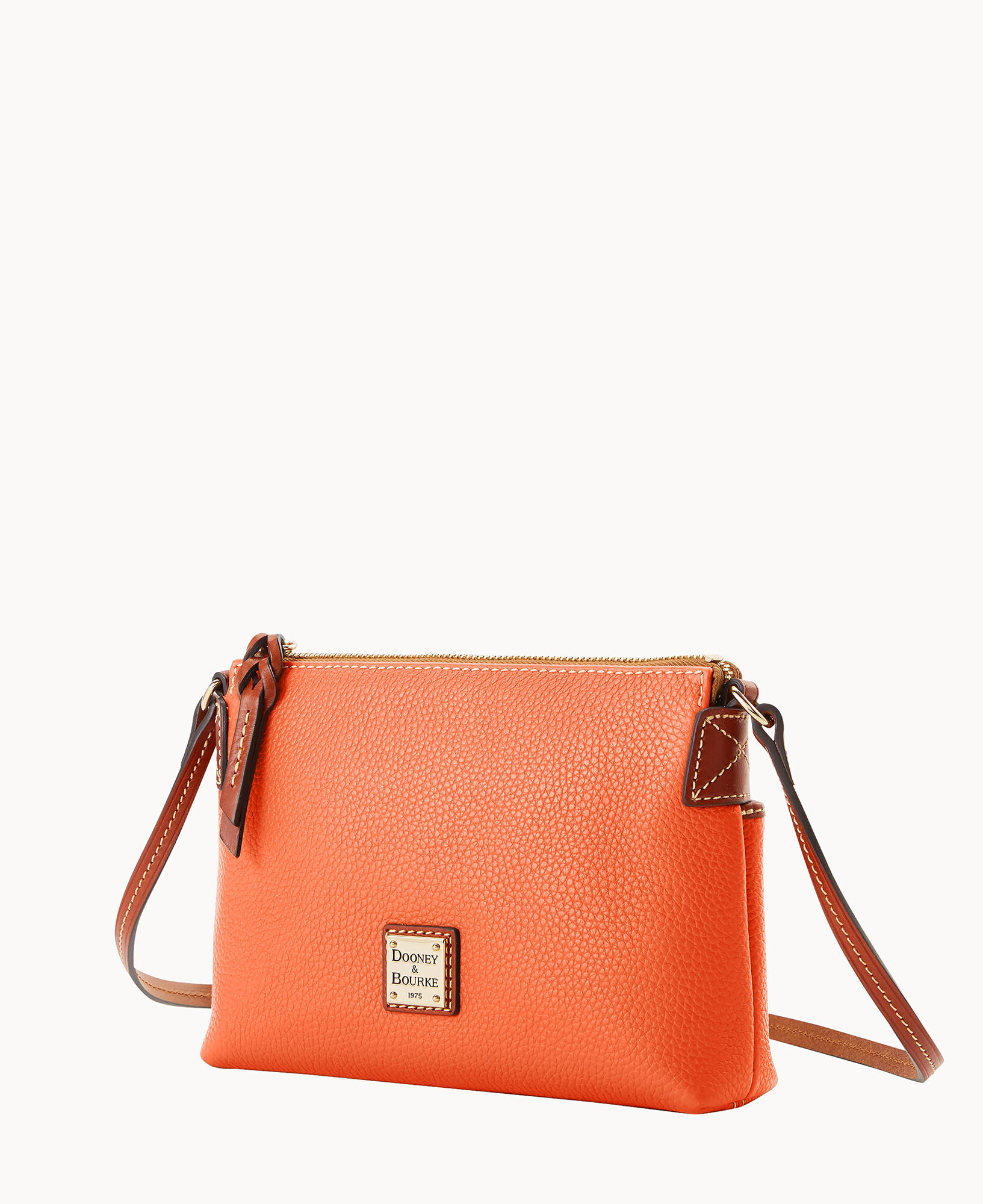 One outside slip pocket. One inside zip pocket. One inside slip pocket. Inside key hook. Adjustable strap.Strap drop length 28″. Lined. Zipper closure.