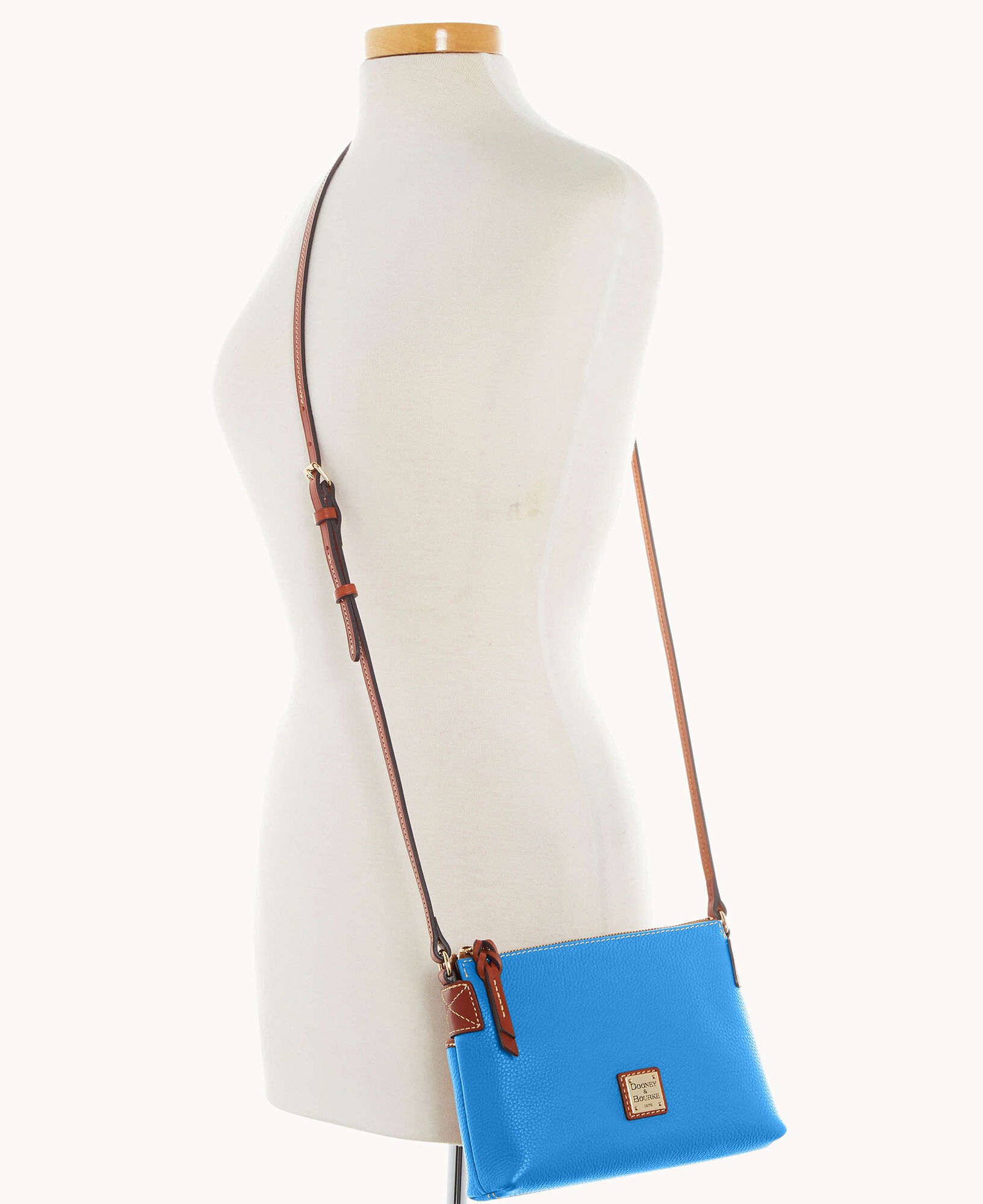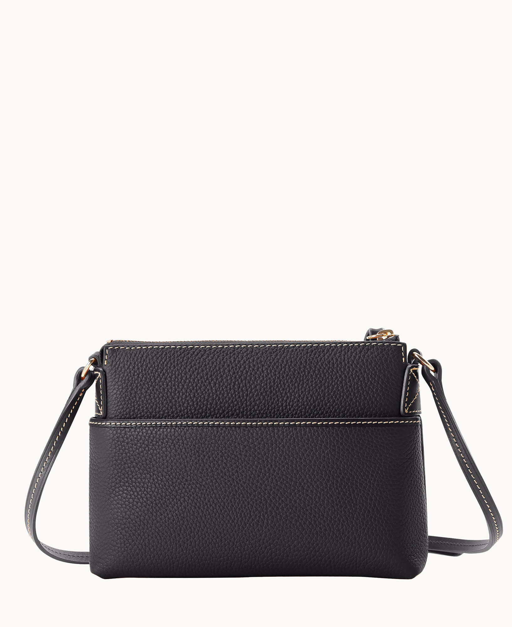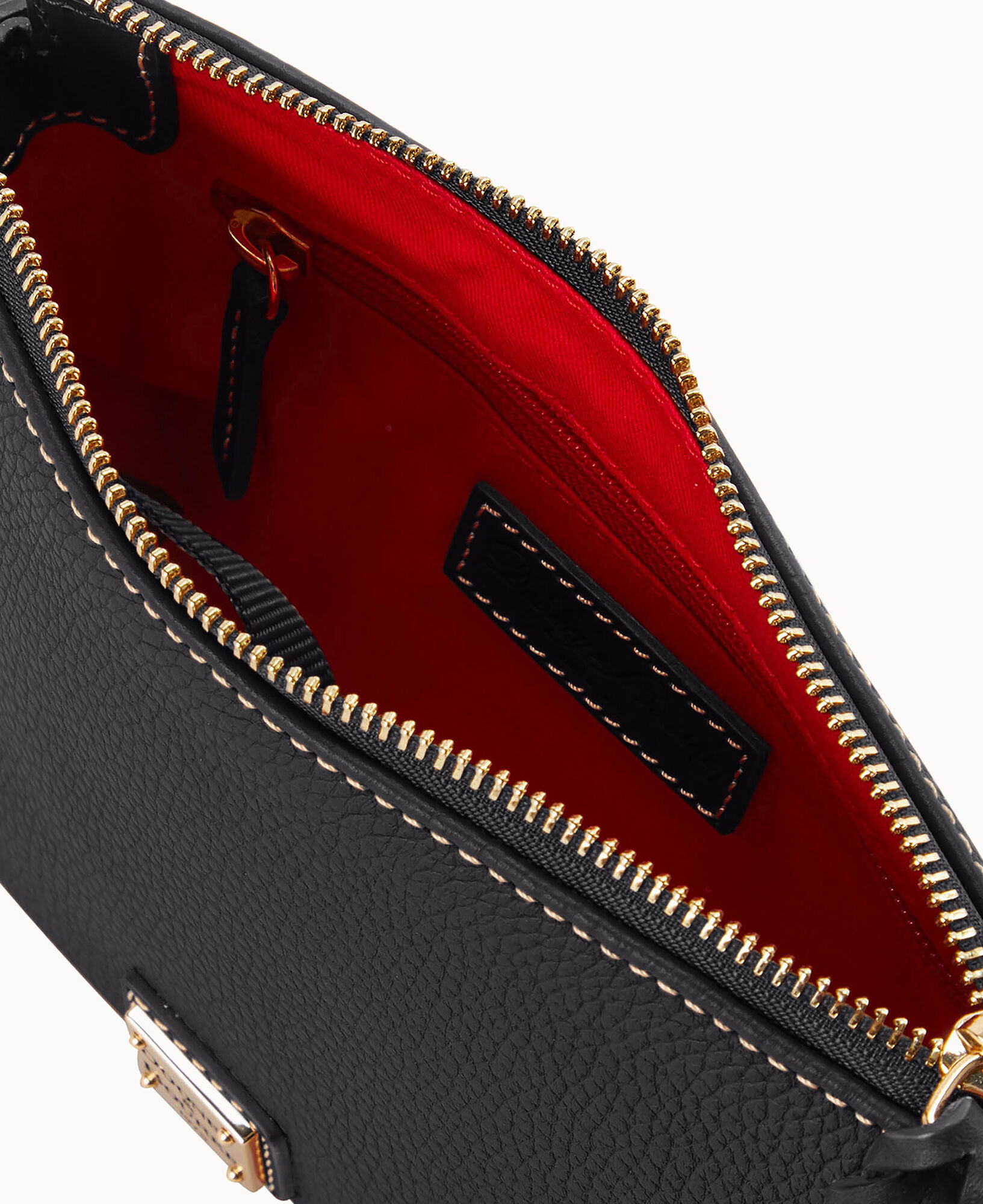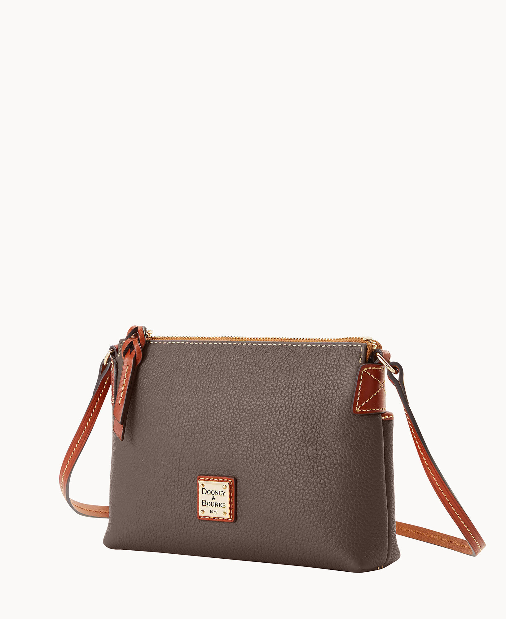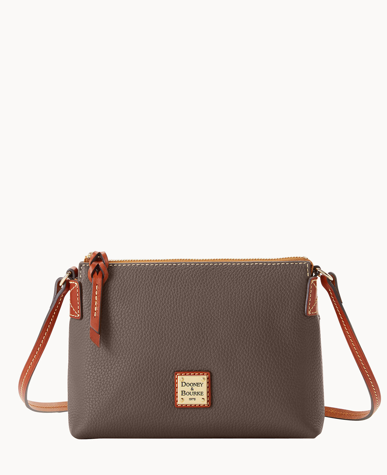 One outside slip pocket. One inside zip pocket. One inside slip pocket. Inside key hook. Adjustable strap.Strap drop length 28″. Lined. Zipper closure.