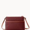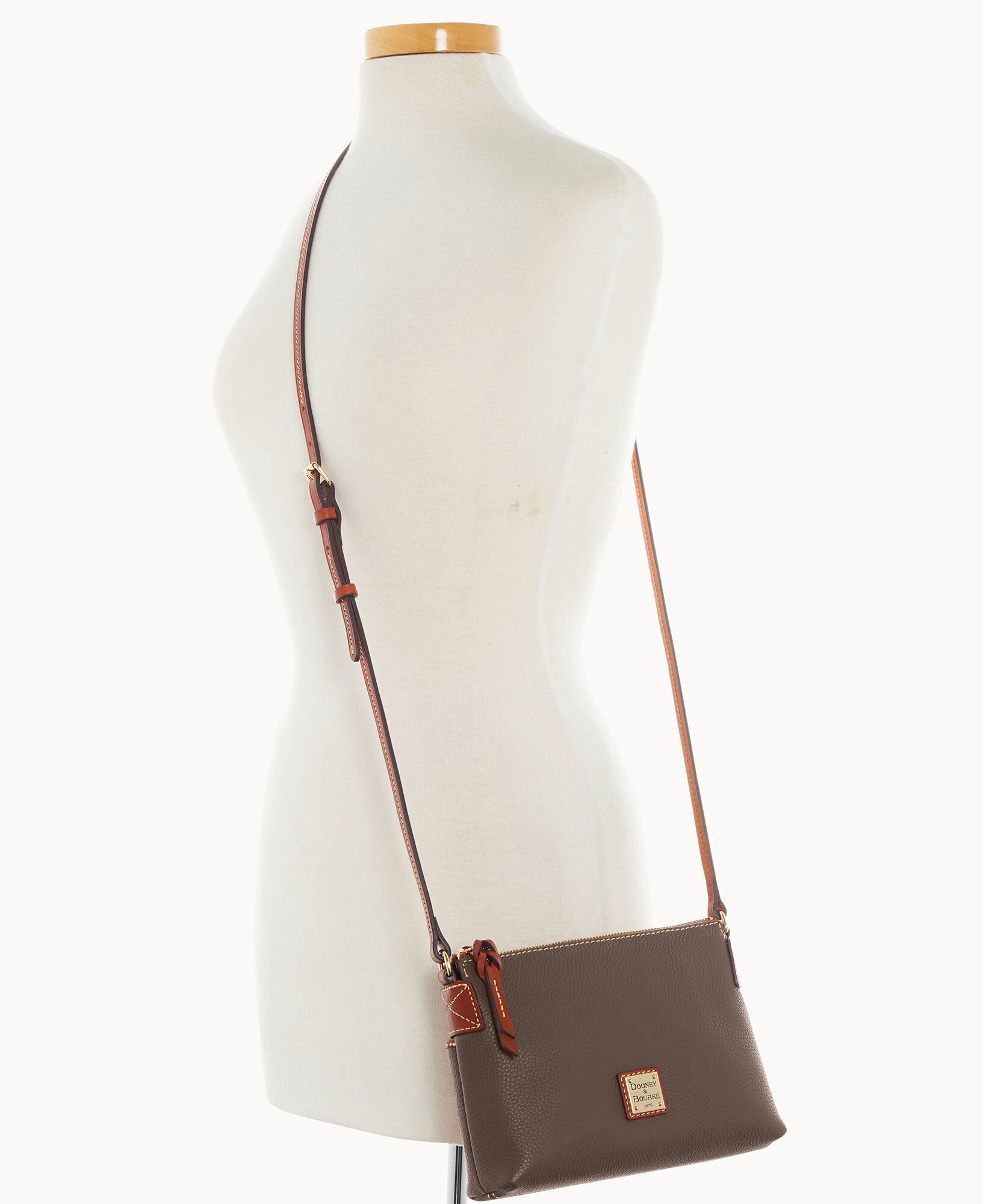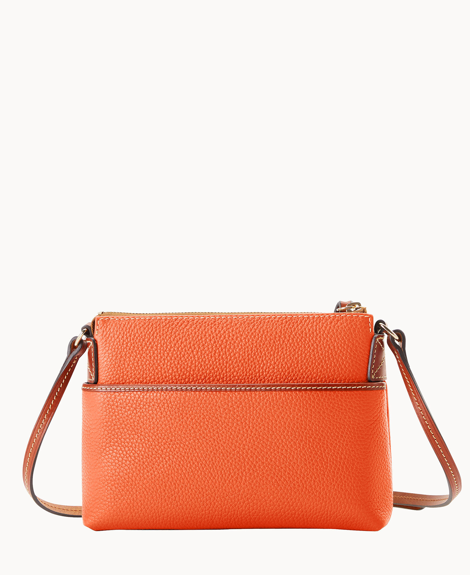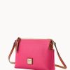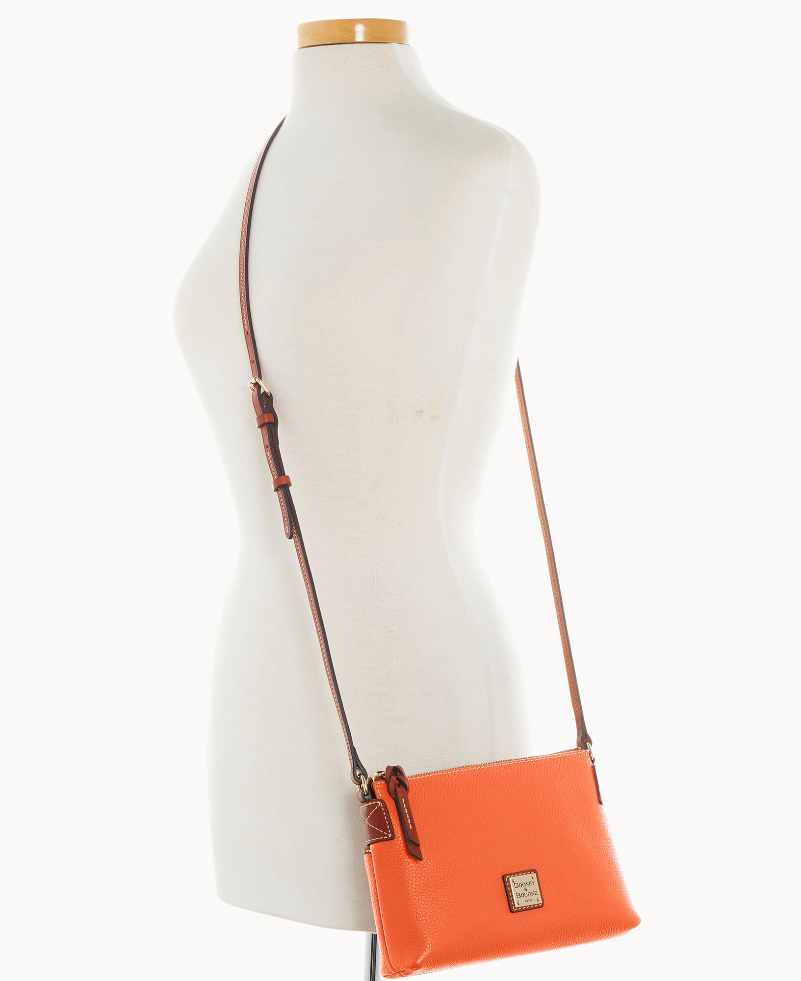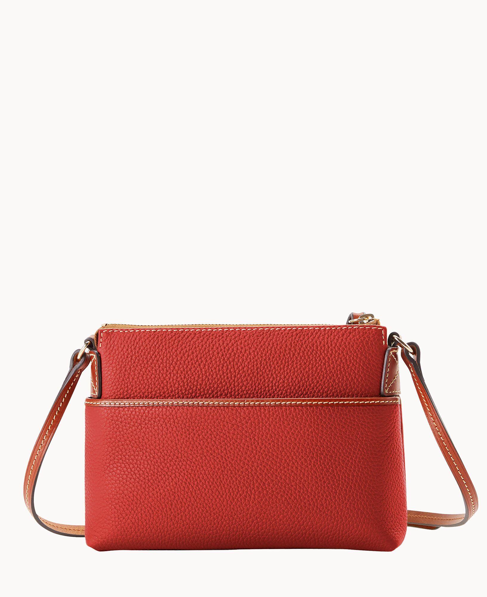 One outside slip pocket. One inside zip pocket. One inside slip pocket. Inside key hook. Adjustable strap.Strap drop length 28″. Lined. Zipper closure.