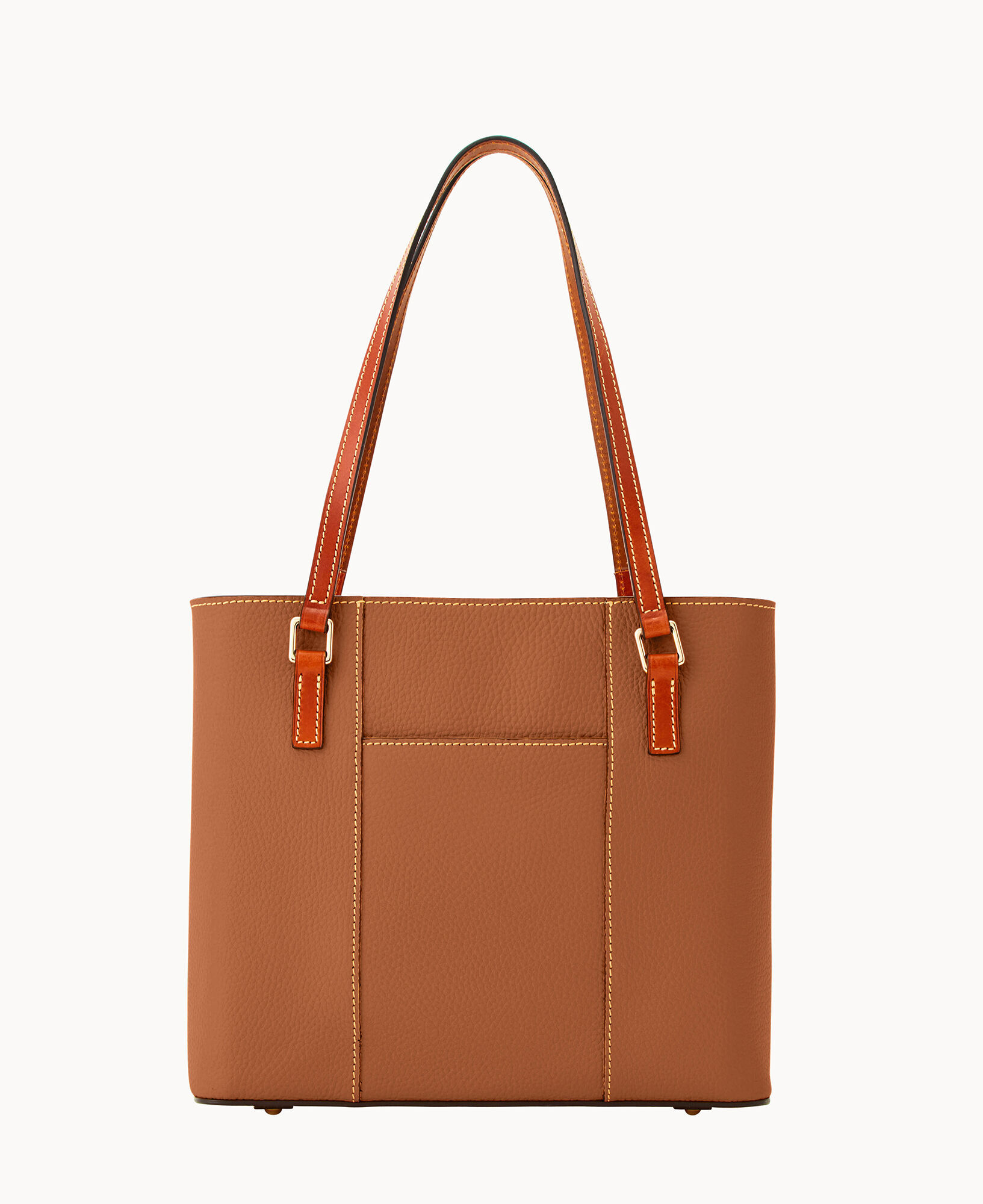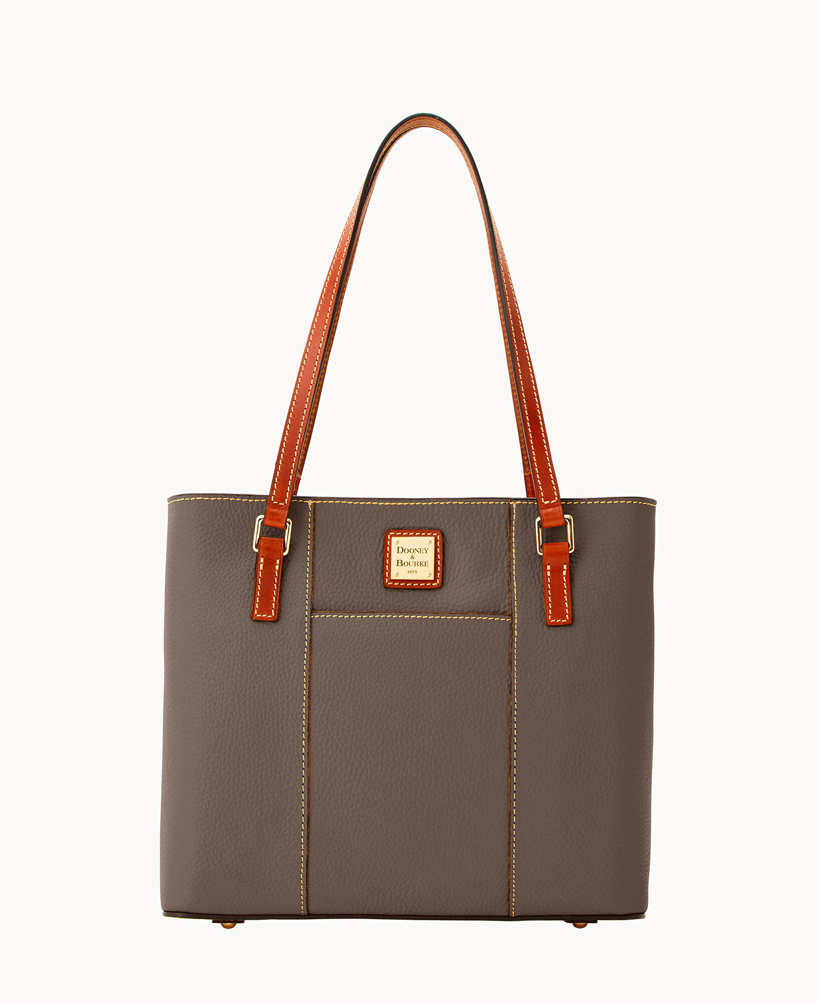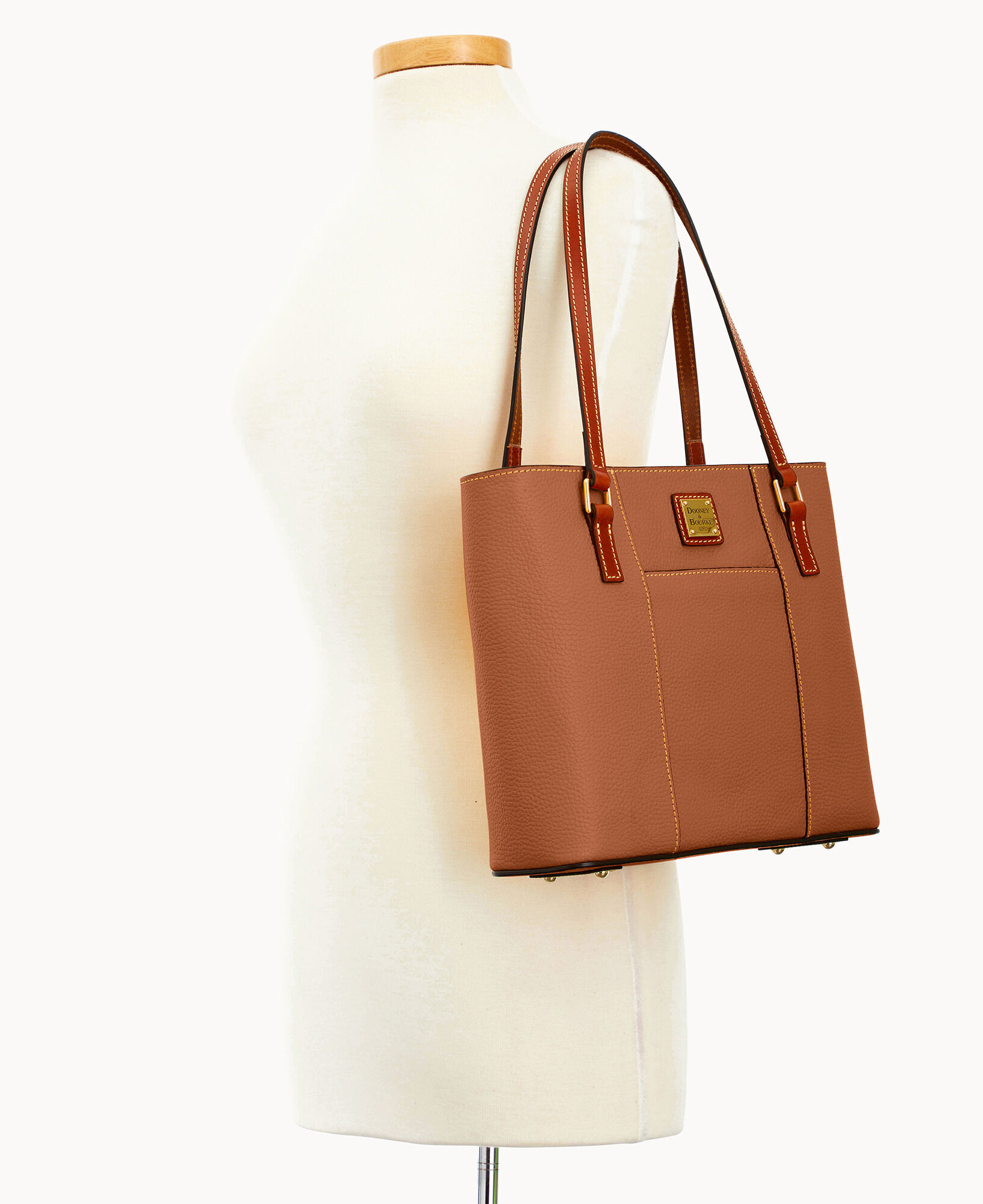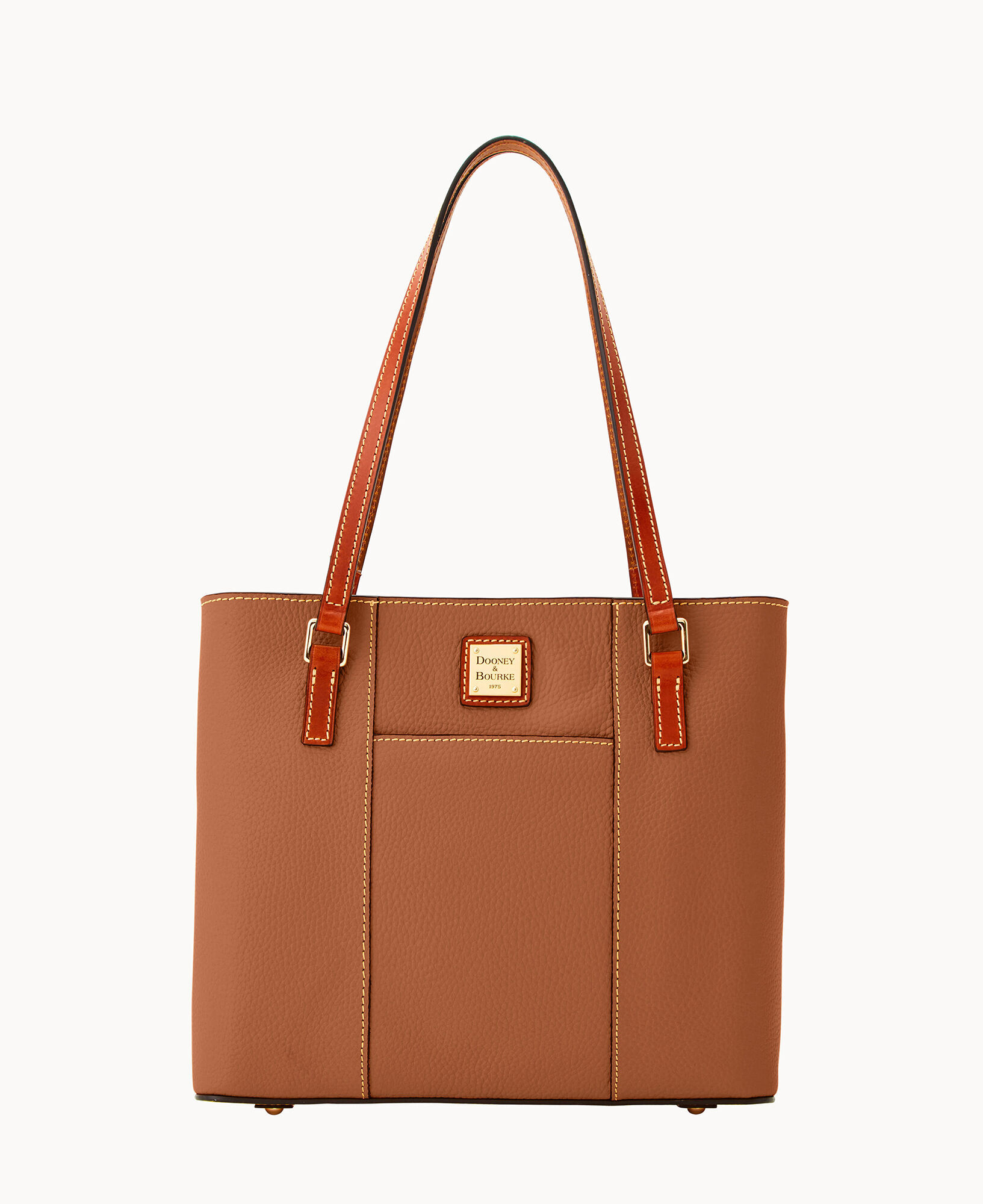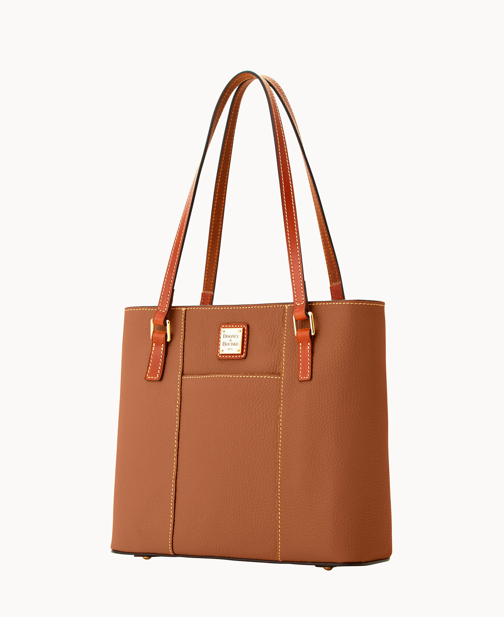 This essential tote, made from long-lasting pebble leather with a rich finish, has all the features you need: protective feet on the bottom, an exterior slip pocket, comfortable leather straps, and a zippered closure for security.