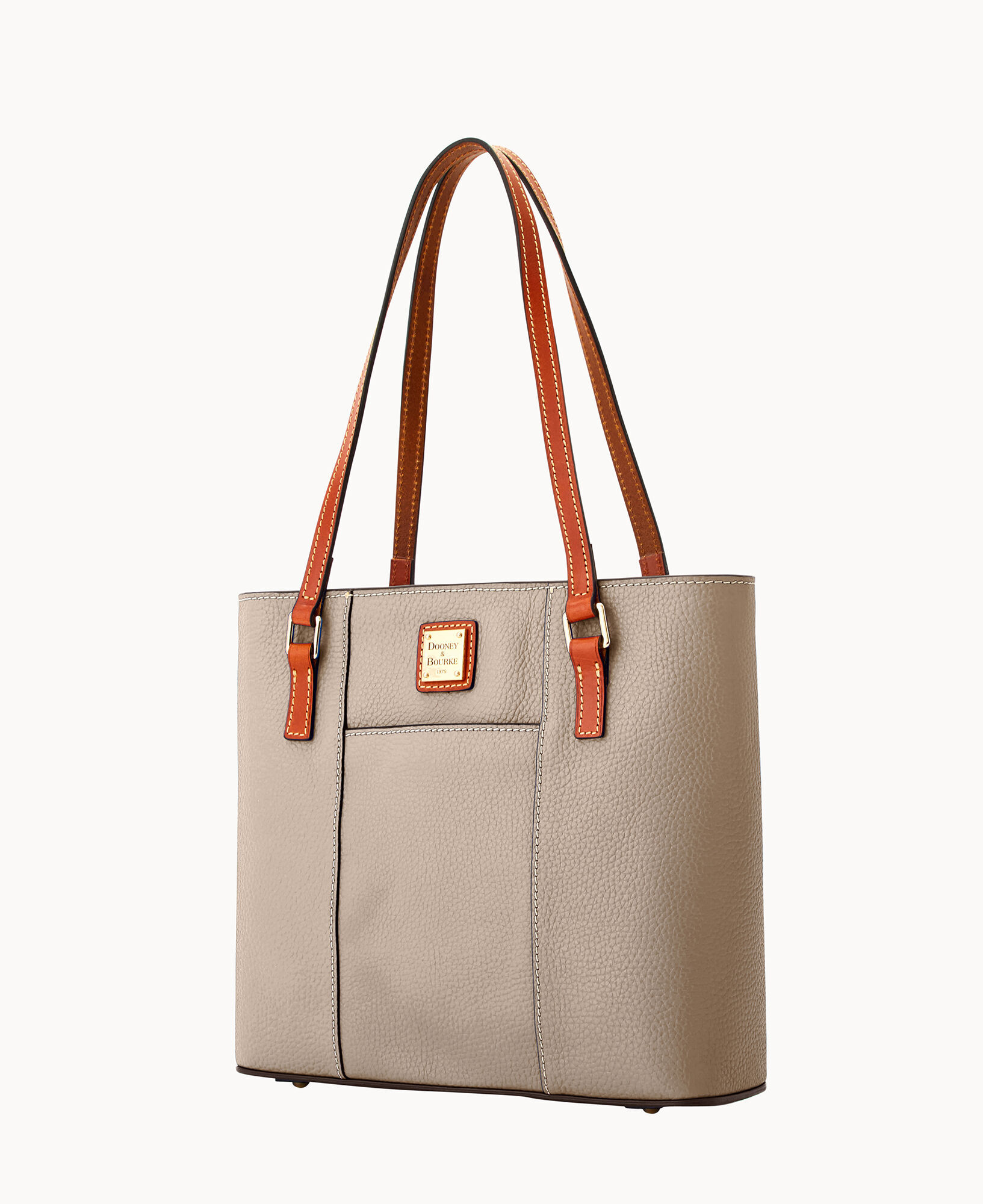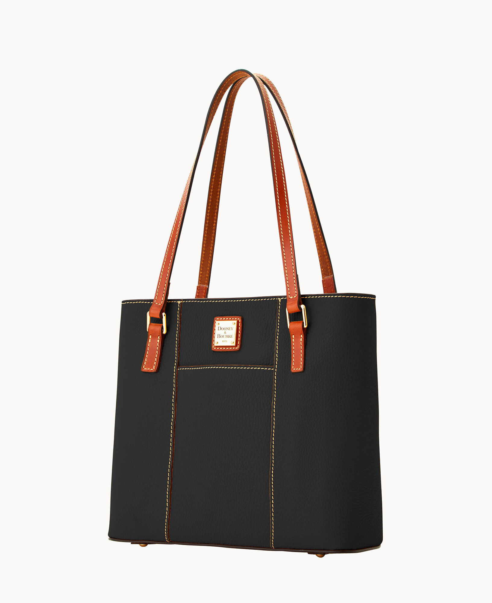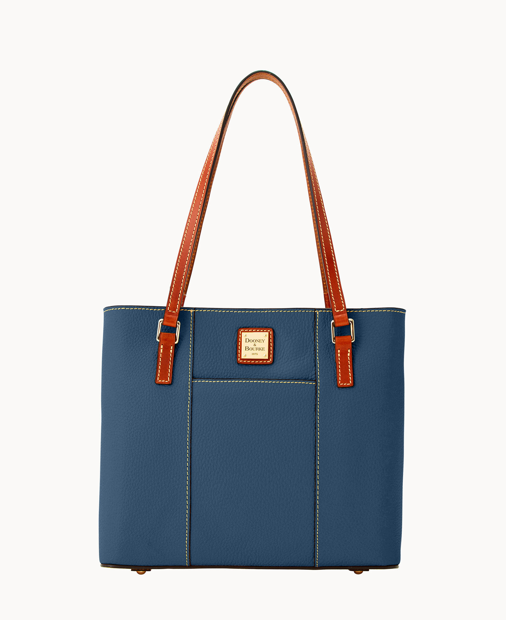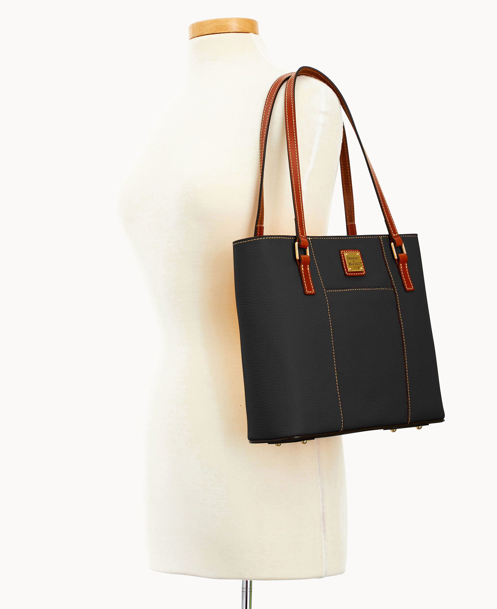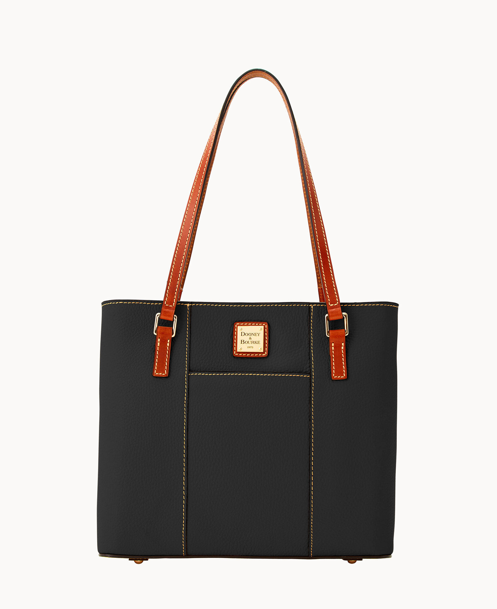 This essential tote, made from long-lasting pebble leather with a rich finish, has all the features you need: protective feet on the bottom, an exterior slip pocket, comfortable leather straps, and a zippered closure for security.