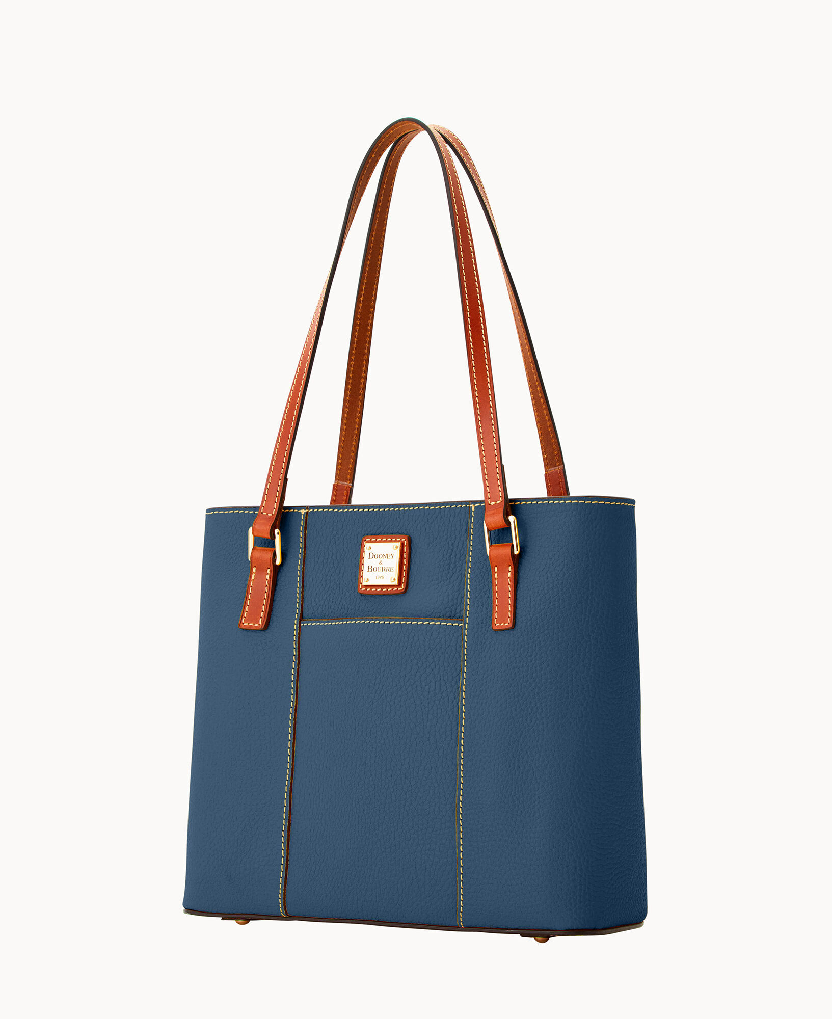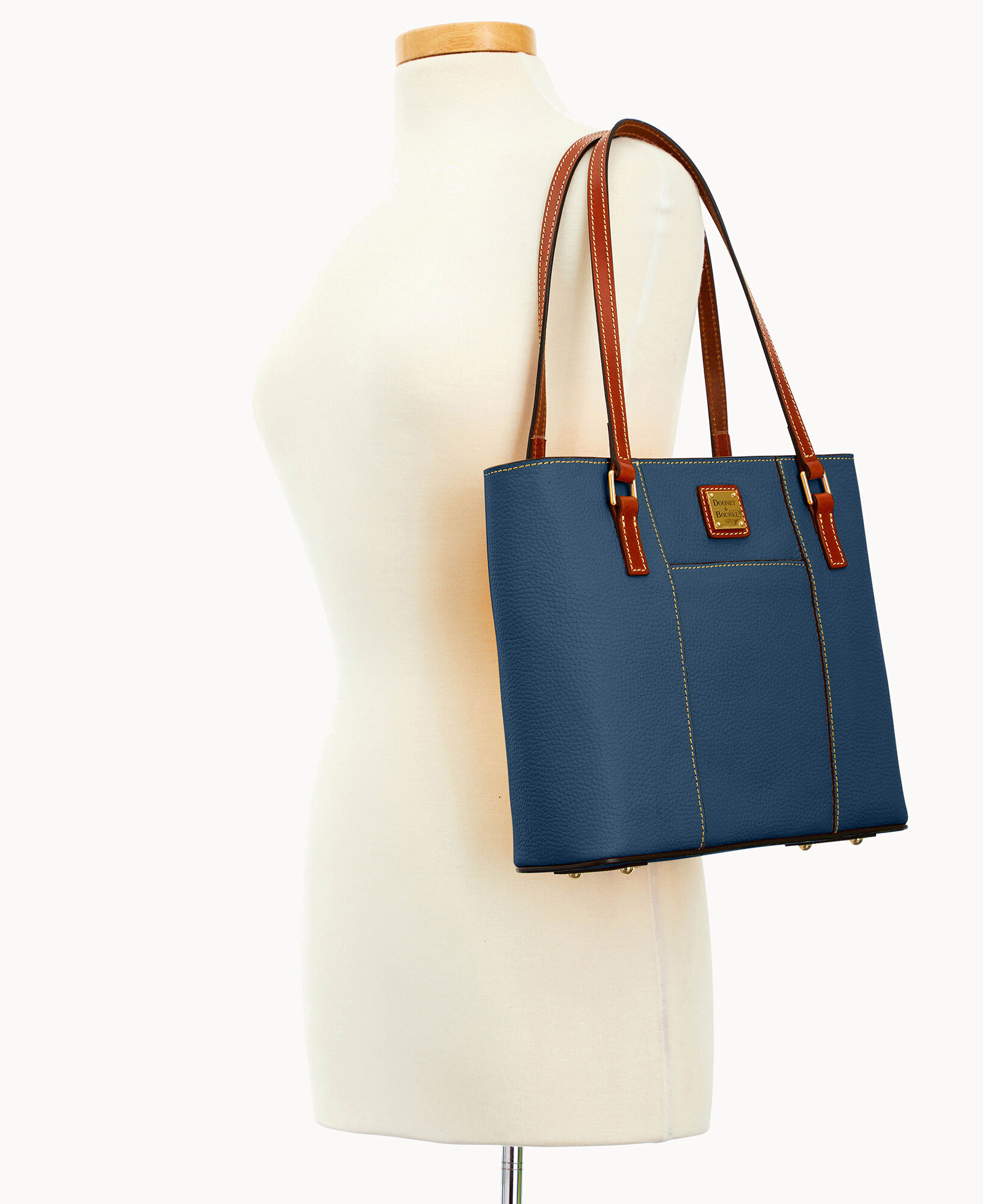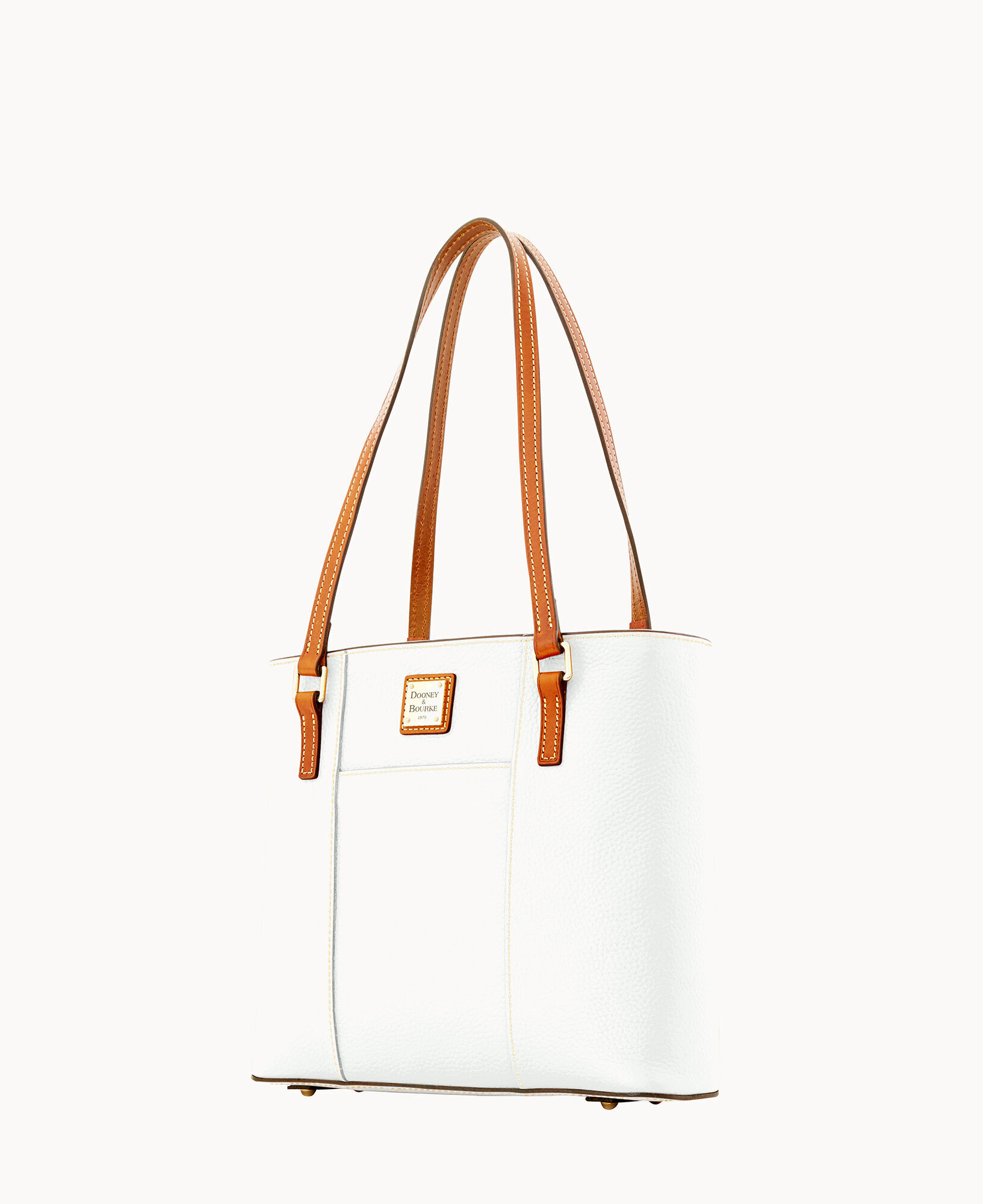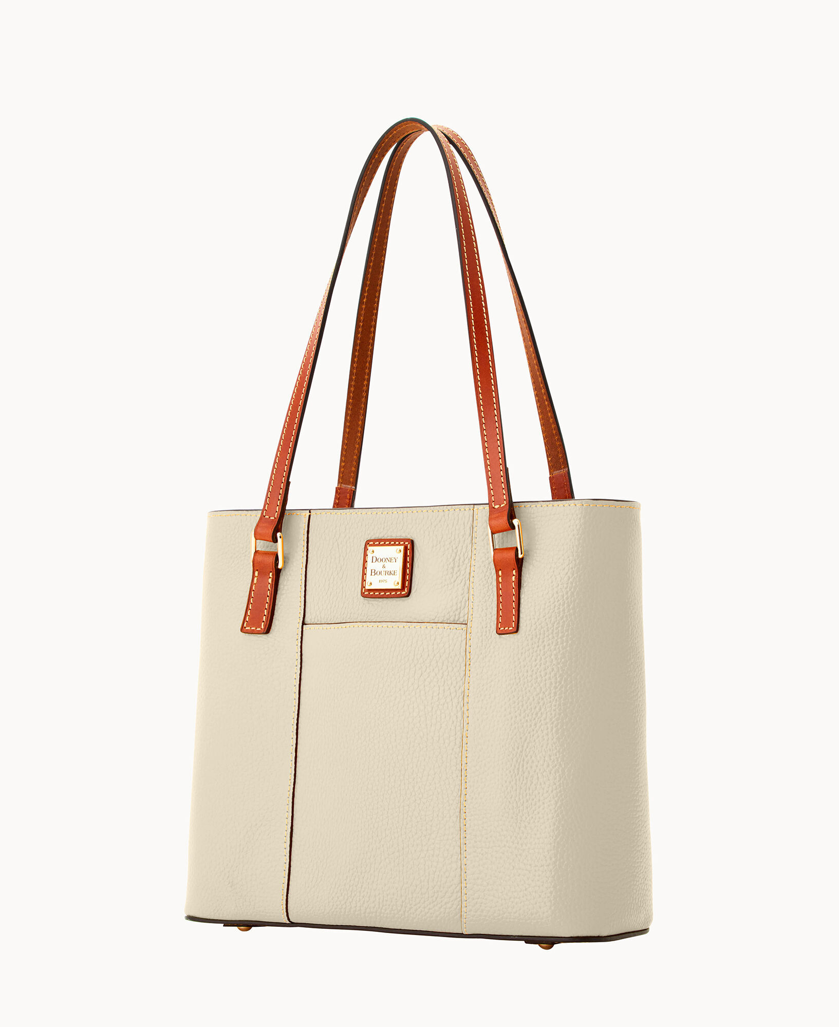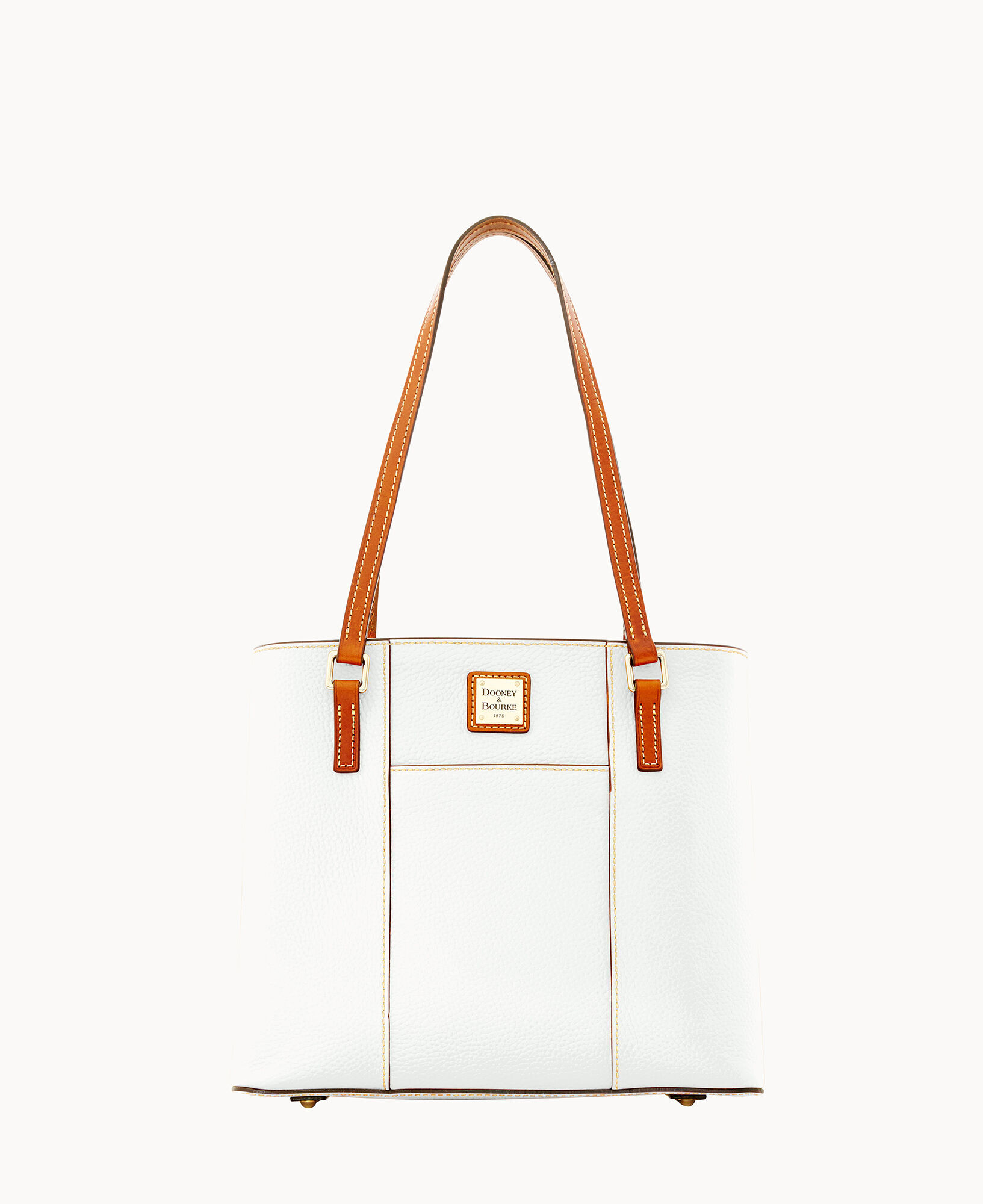 This essential tote, made from long-lasting pebble leather with a rich finish, has all the features you need: protective feet on the bottom, an exterior slip pocket, comfortable leather straps, and a zippered closure for security.