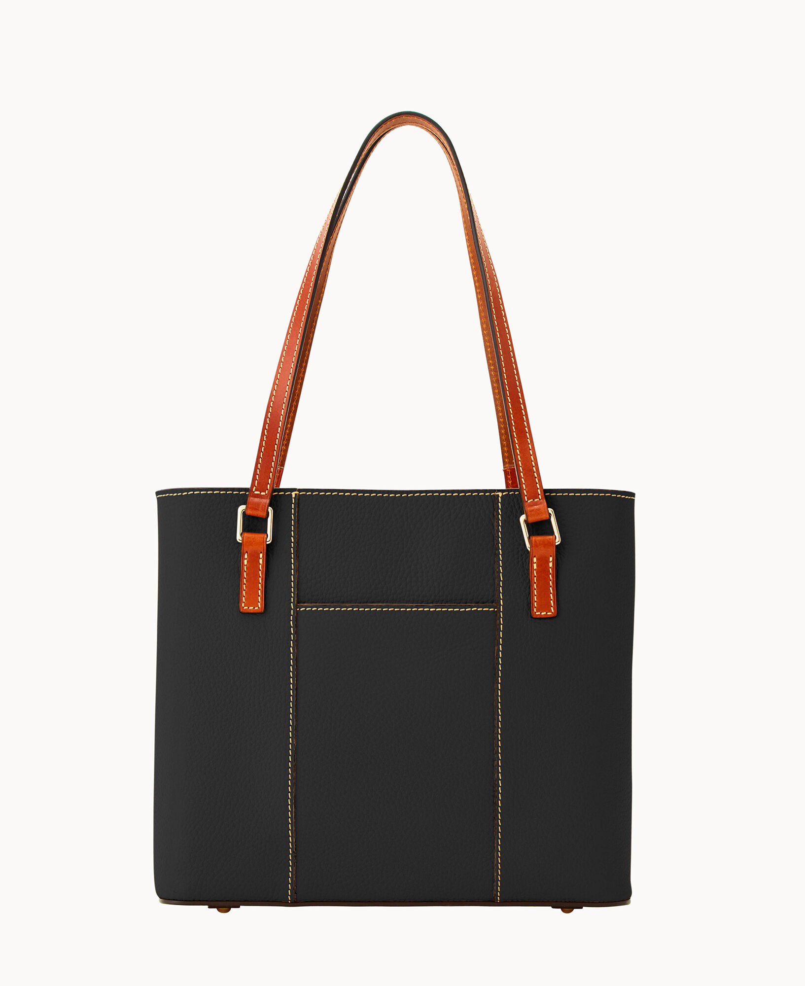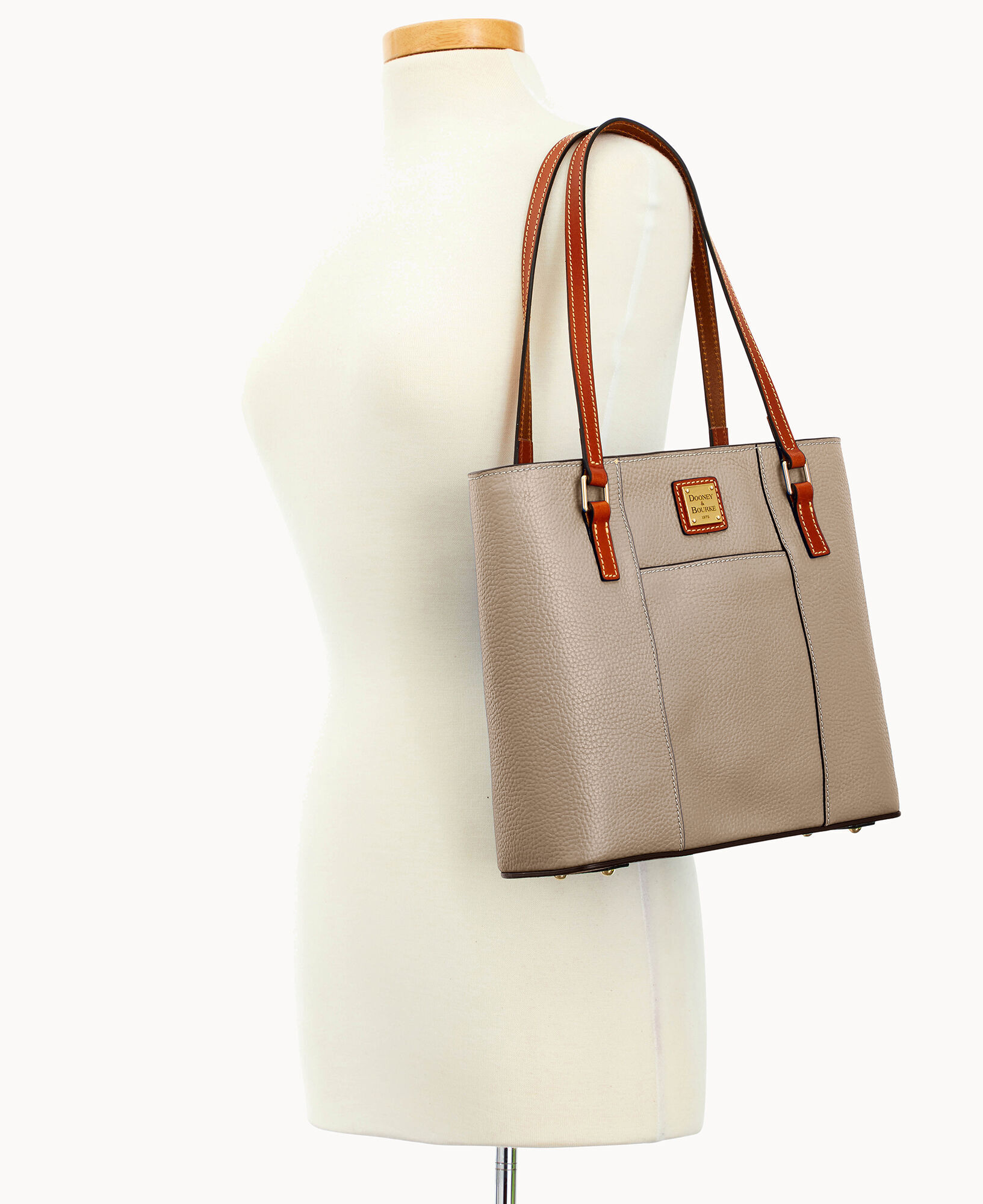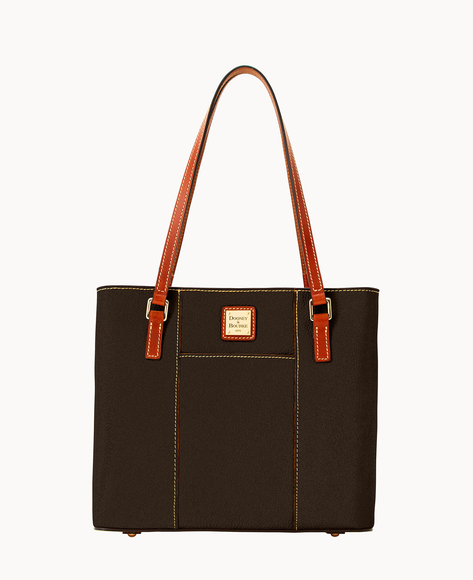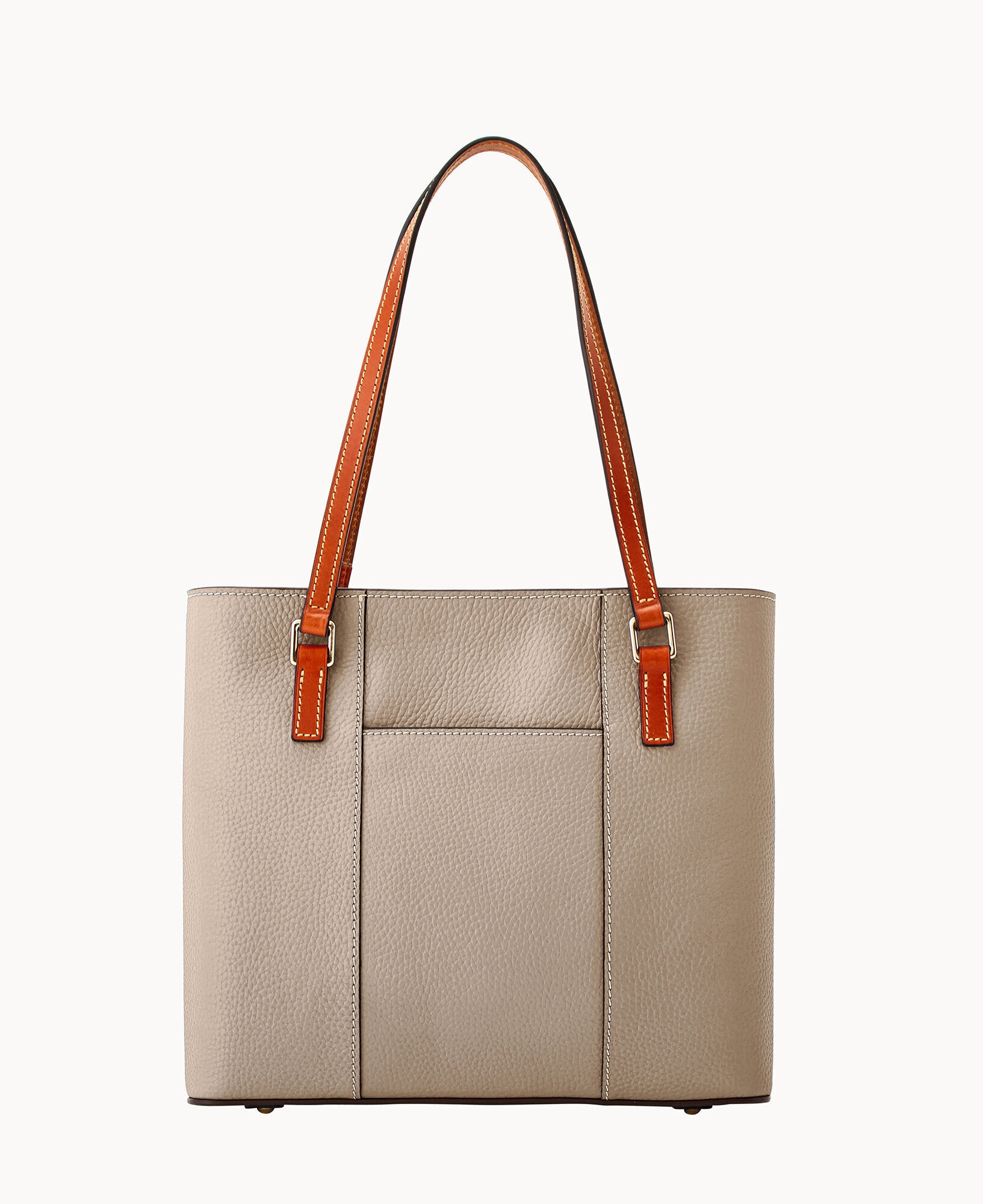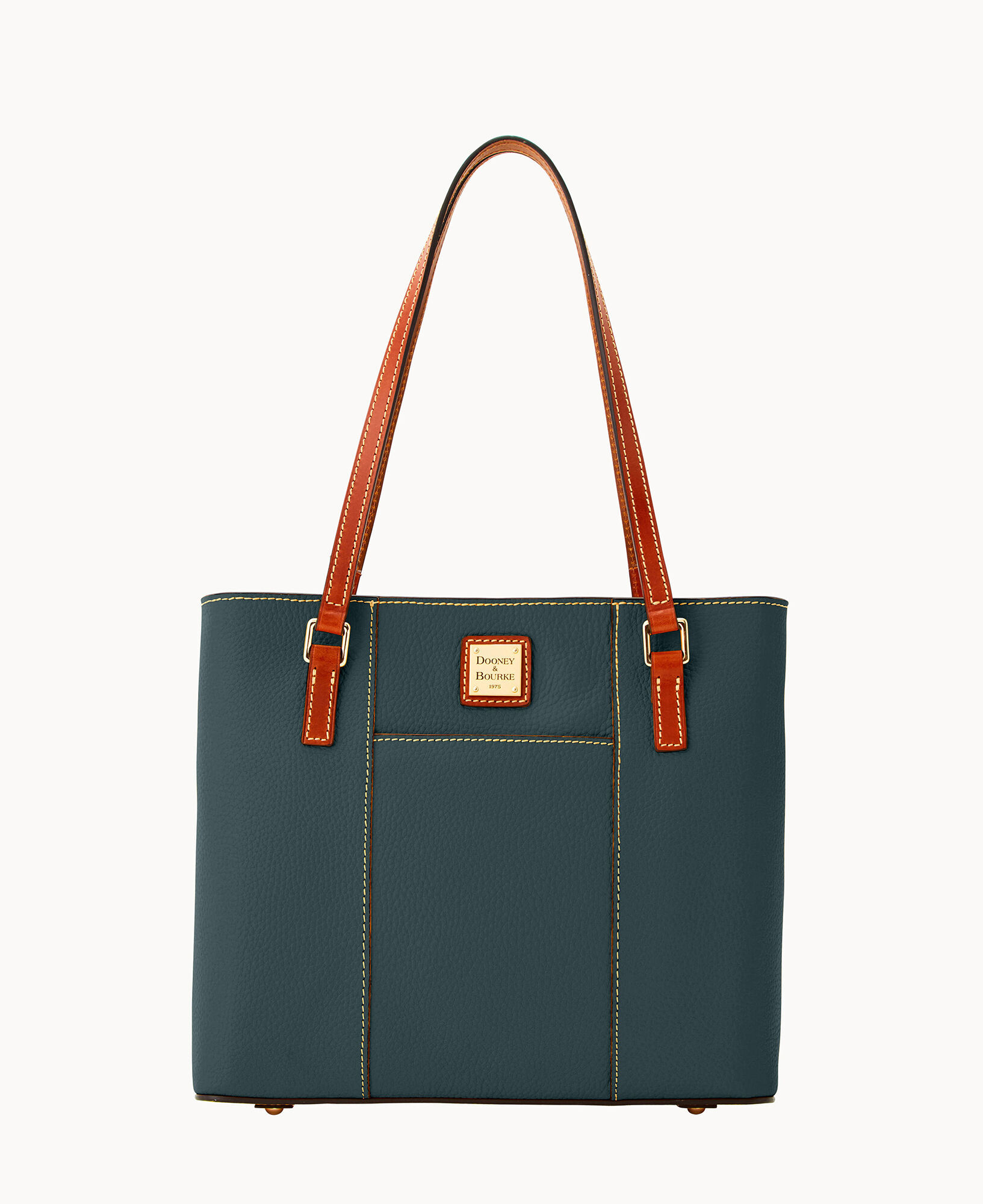 This essential tote, made from long-lasting pebble leather with a rich finish, has all the features you need: protective feet on the bottom, an exterior slip pocket, comfortable leather straps, and a zippered closure for security.