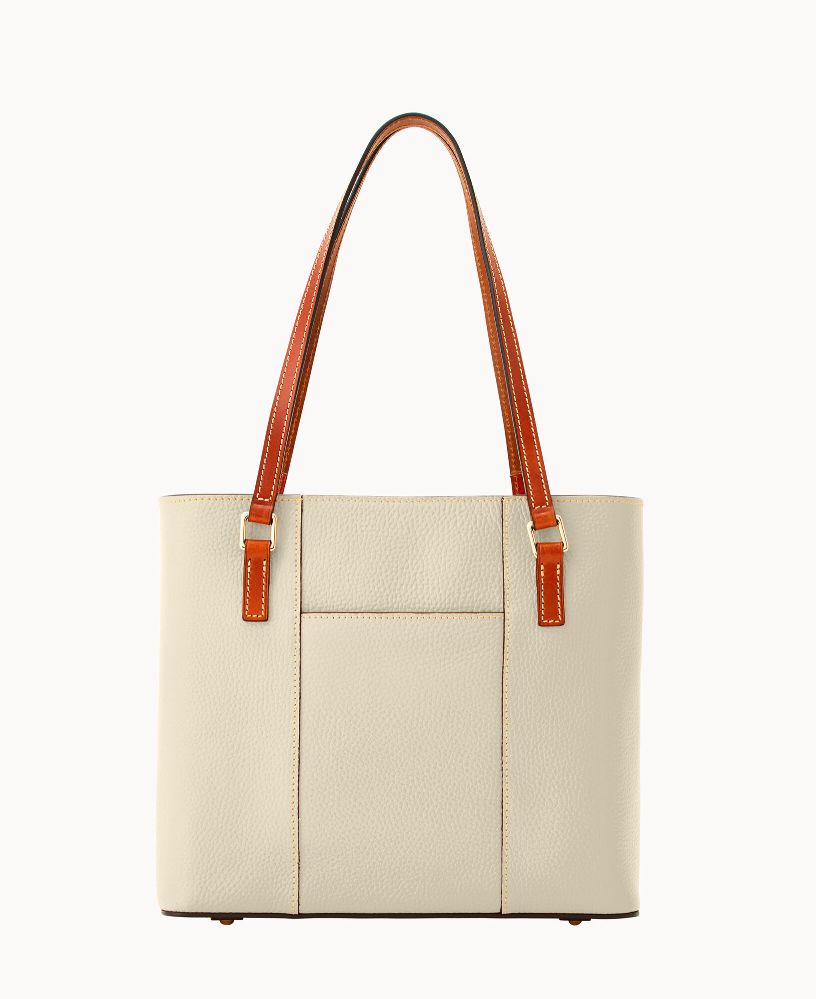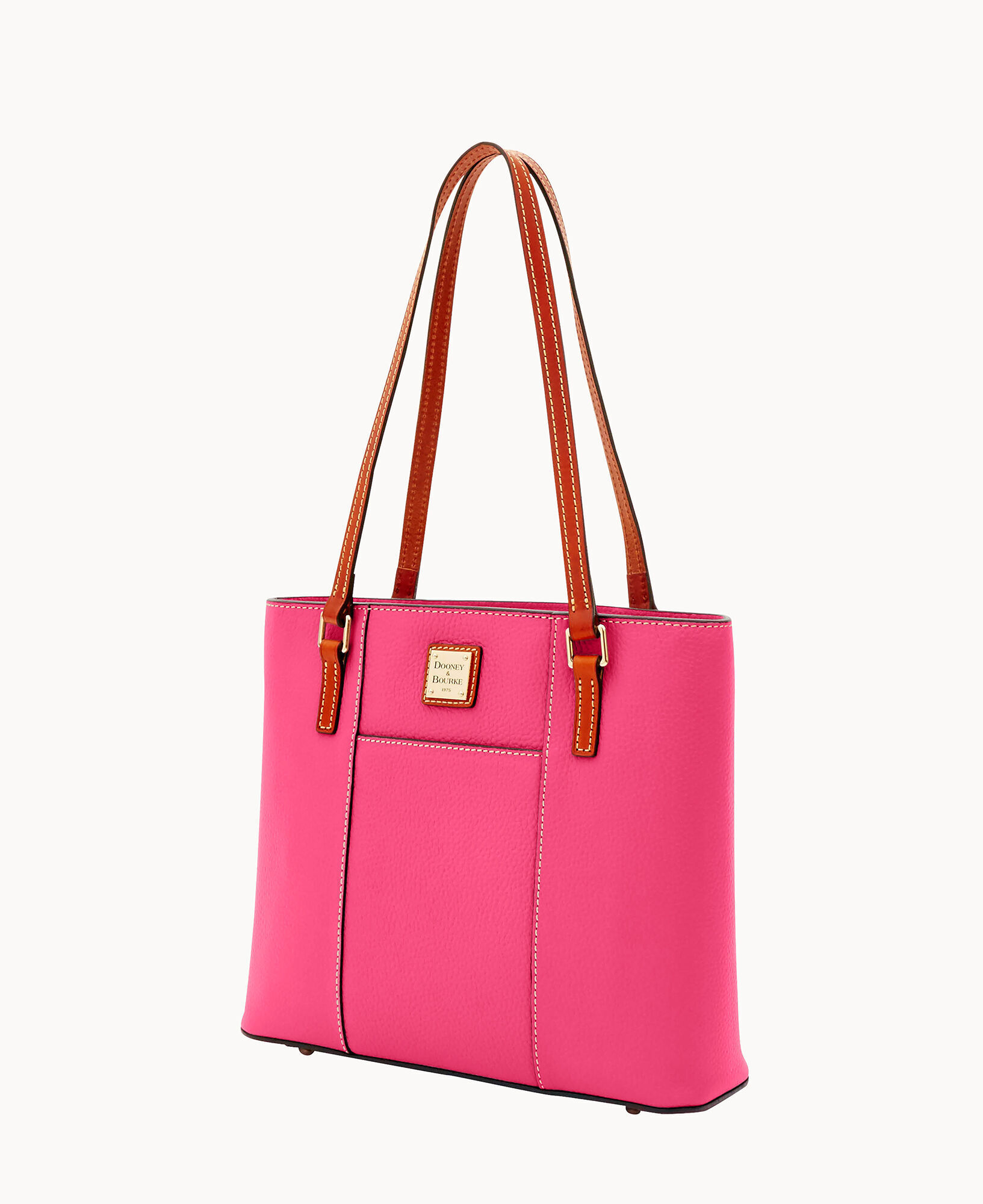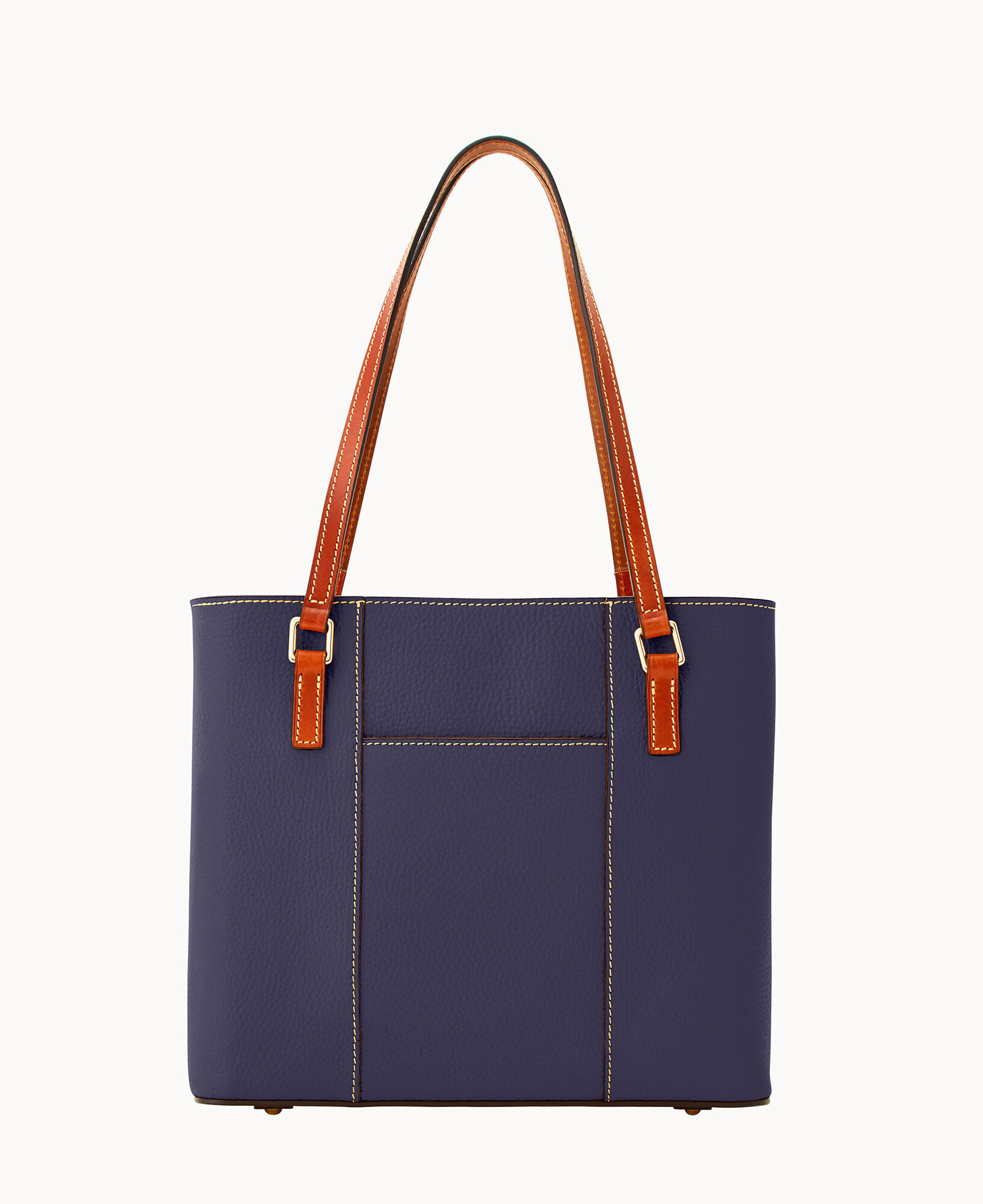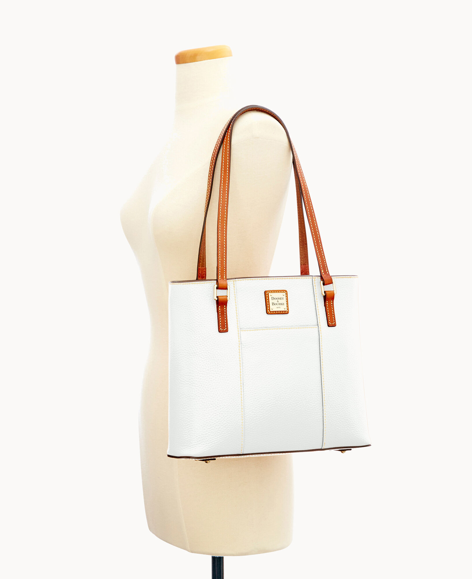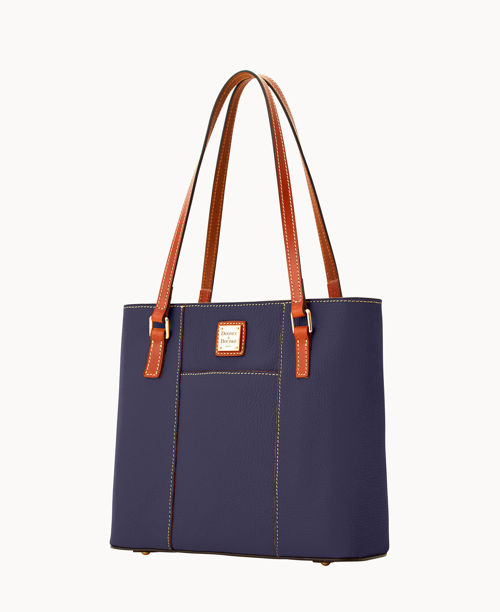 This essential tote, made from long-lasting pebble leather with a rich finish, has all the features you need: protective feet on the bottom, an exterior slip pocket, comfortable leather straps, and a zippered closure for security.
