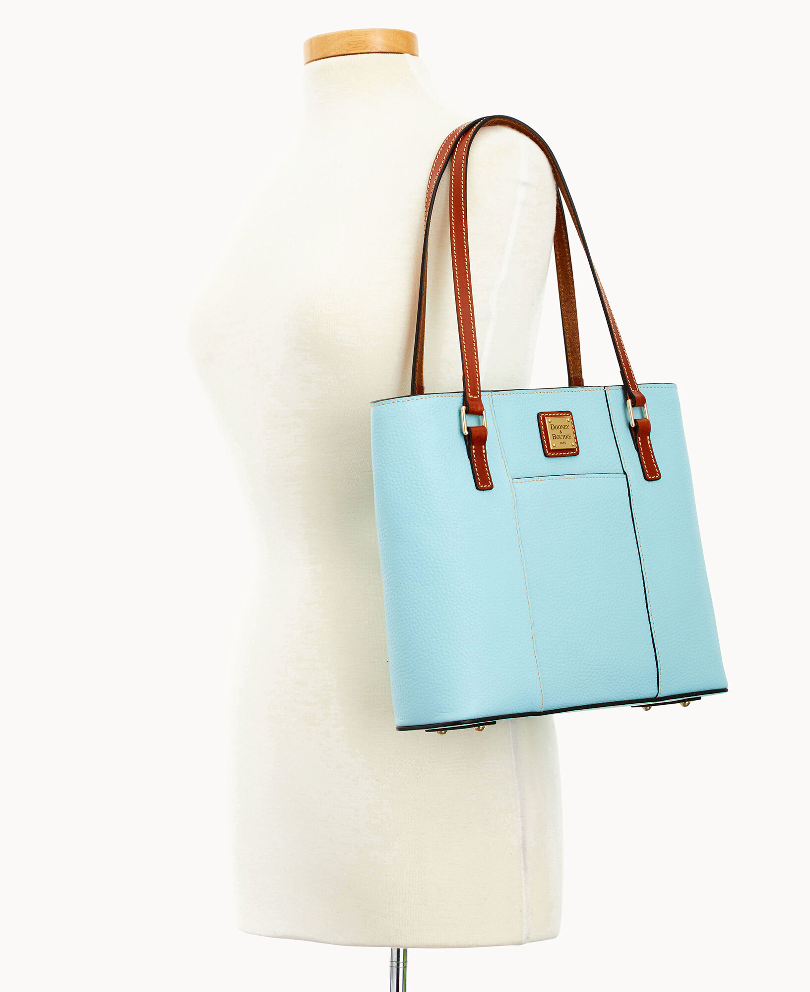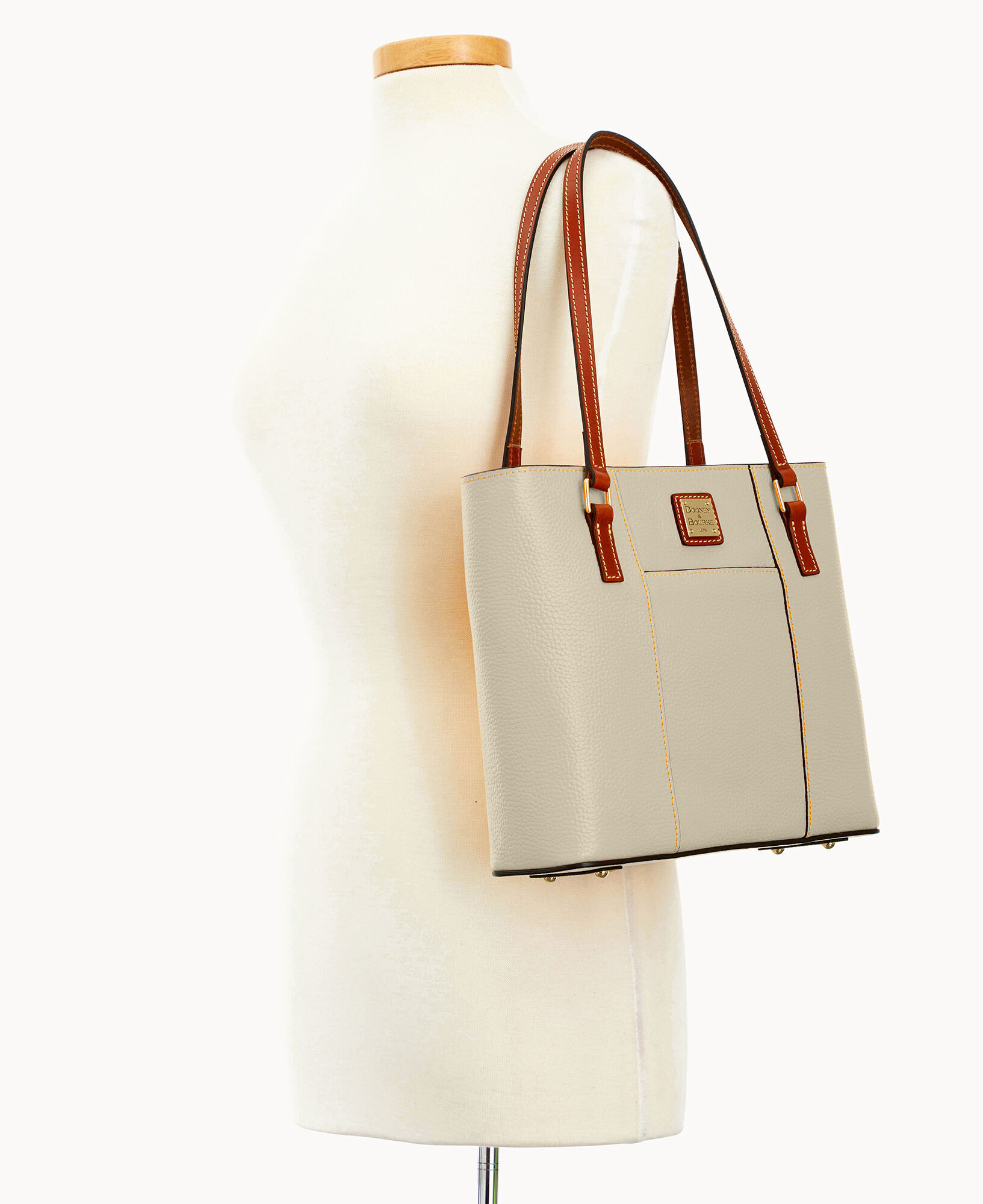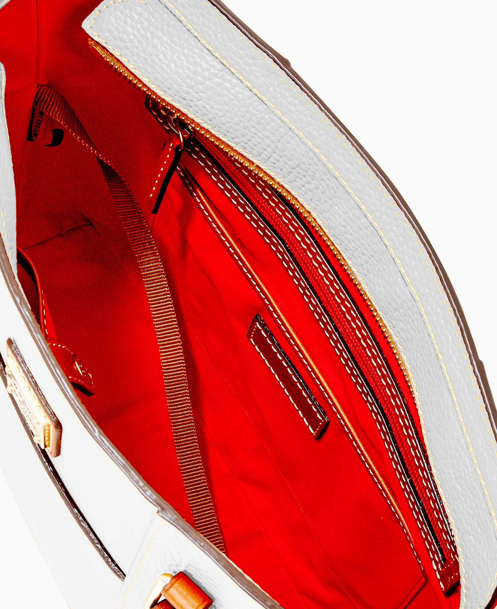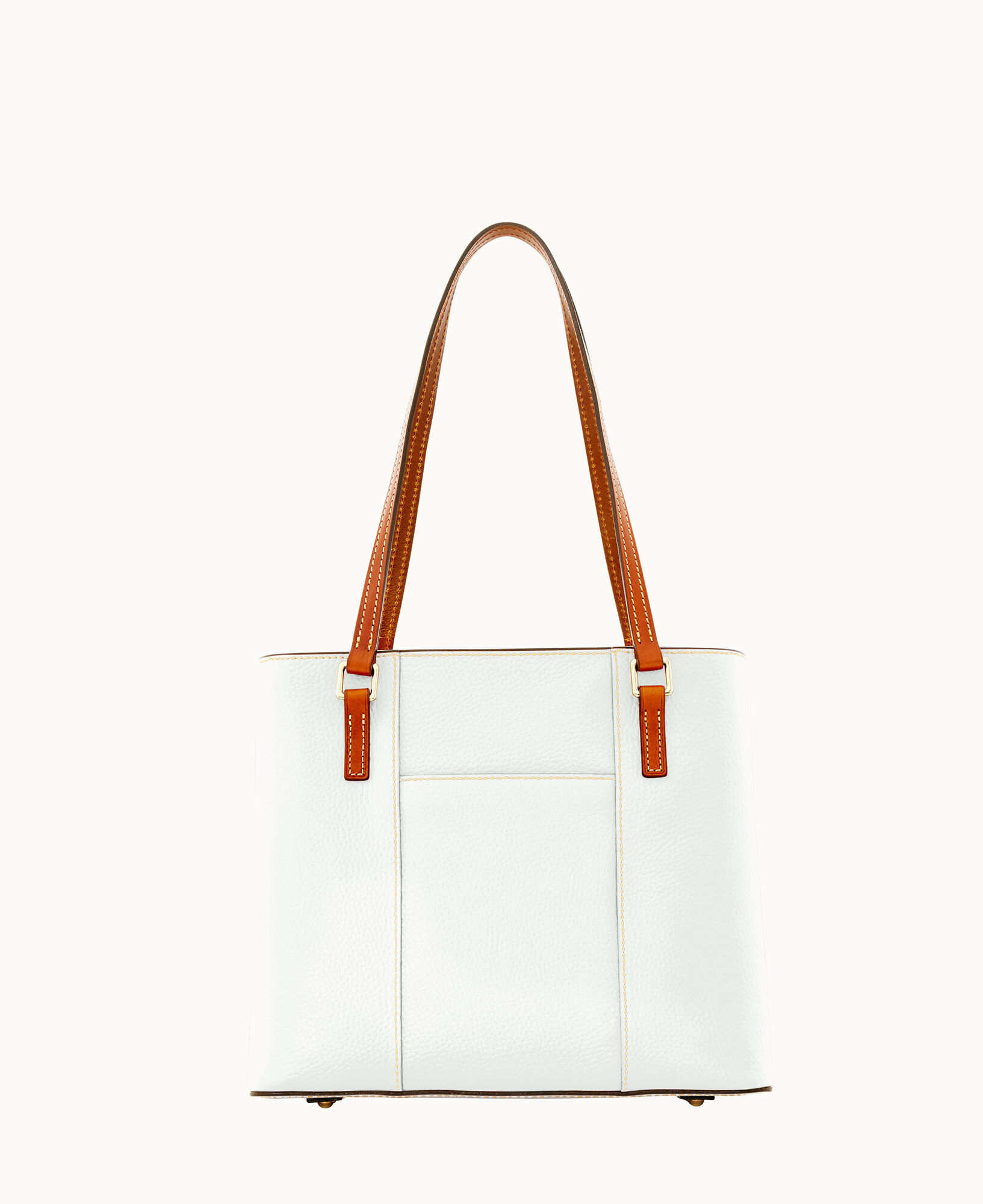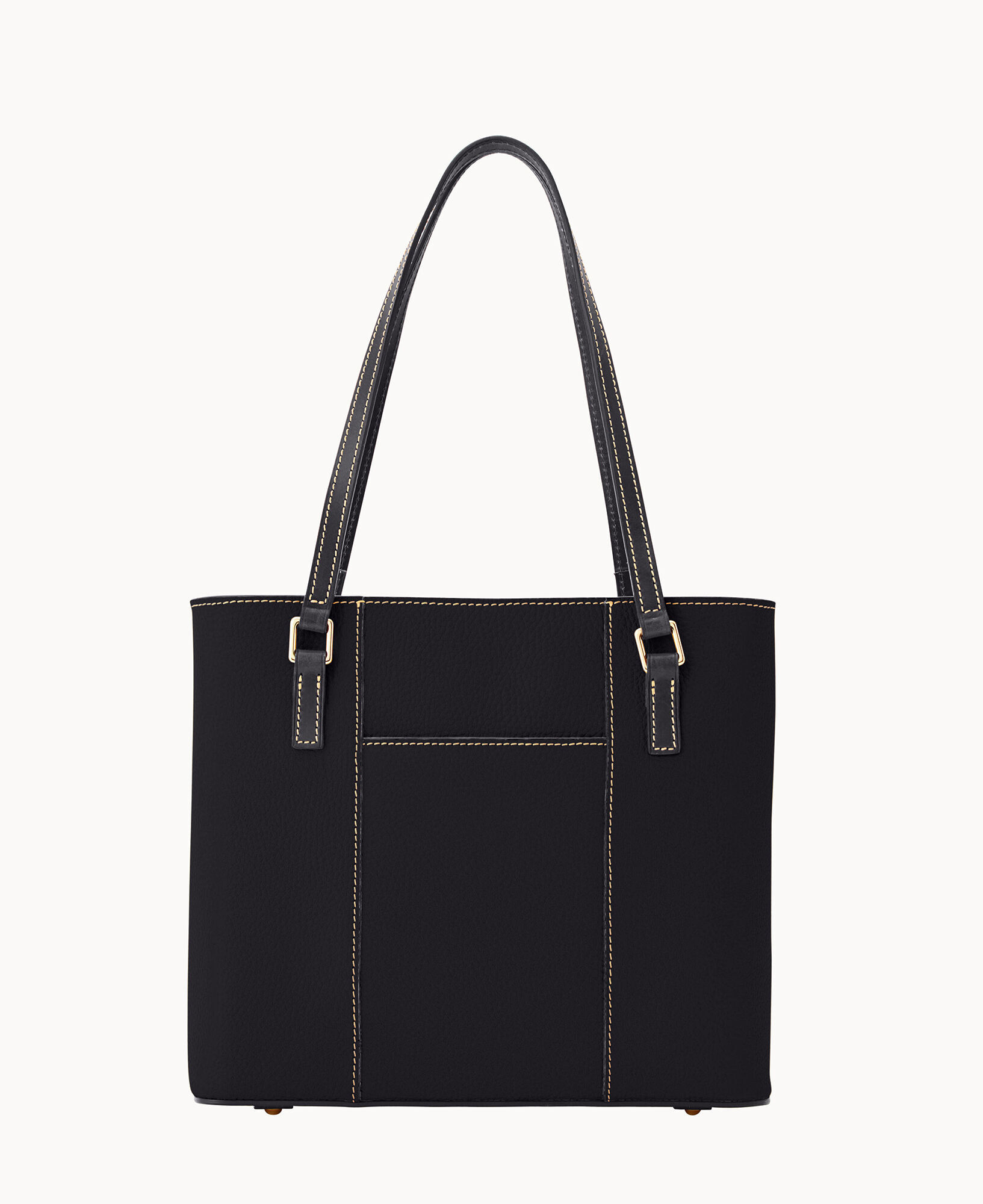This essential tote, made from long-lasting pebble leather with a rich finish, has all the features you need: protective feet on the bottom, an exterior slip pocket, comfortable leather straps, and a zippered closure for security.