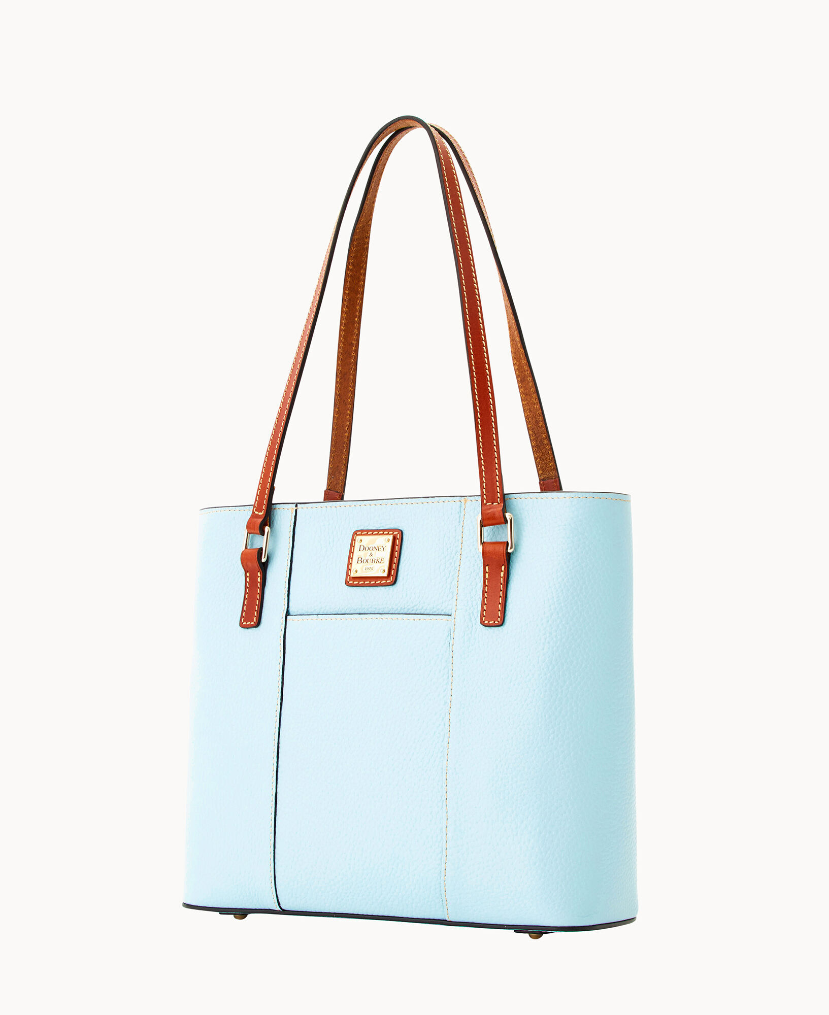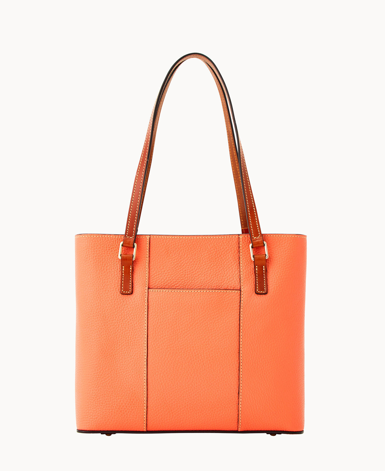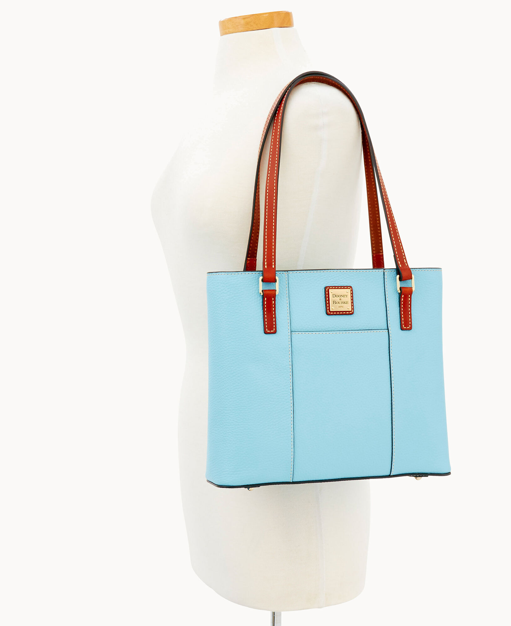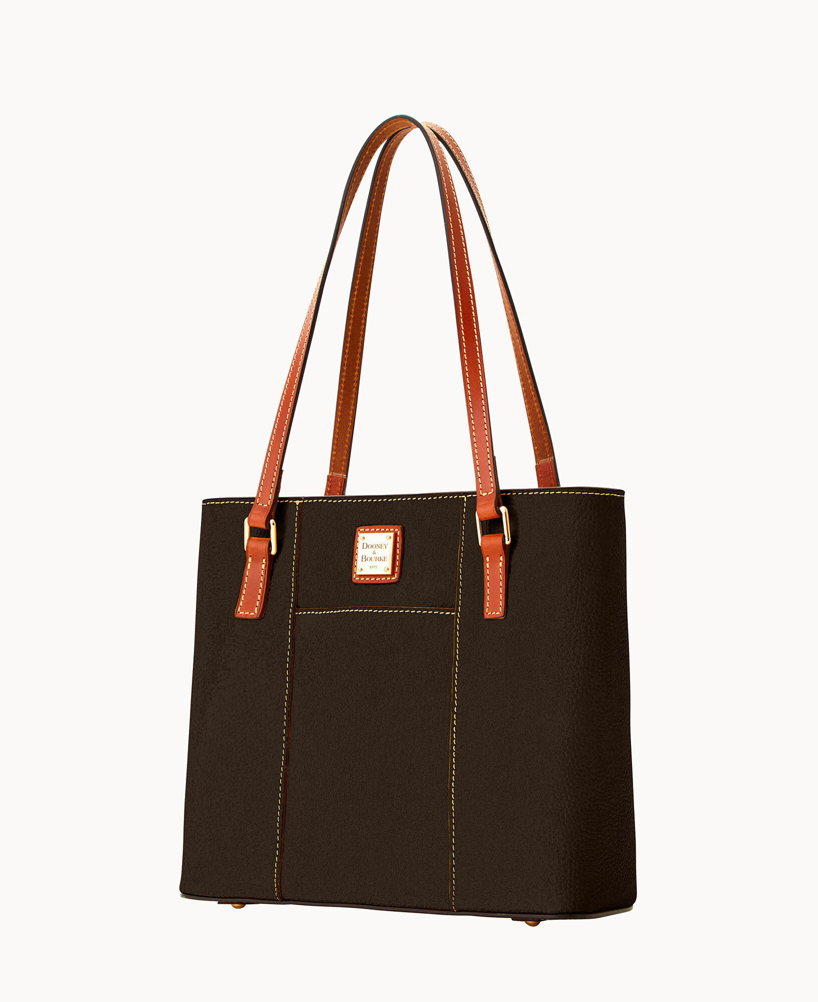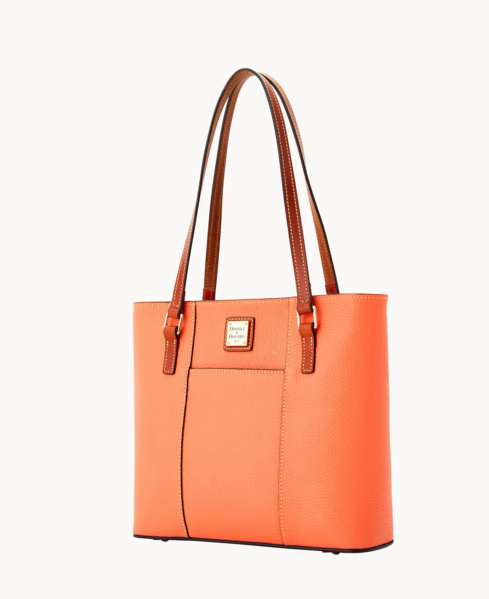 This essential tote, made from long-lasting pebble leather with a rich finish, has all the features you need: protective feet on the bottom, an exterior slip pocket, comfortable leather straps, and a zippered closure for security.