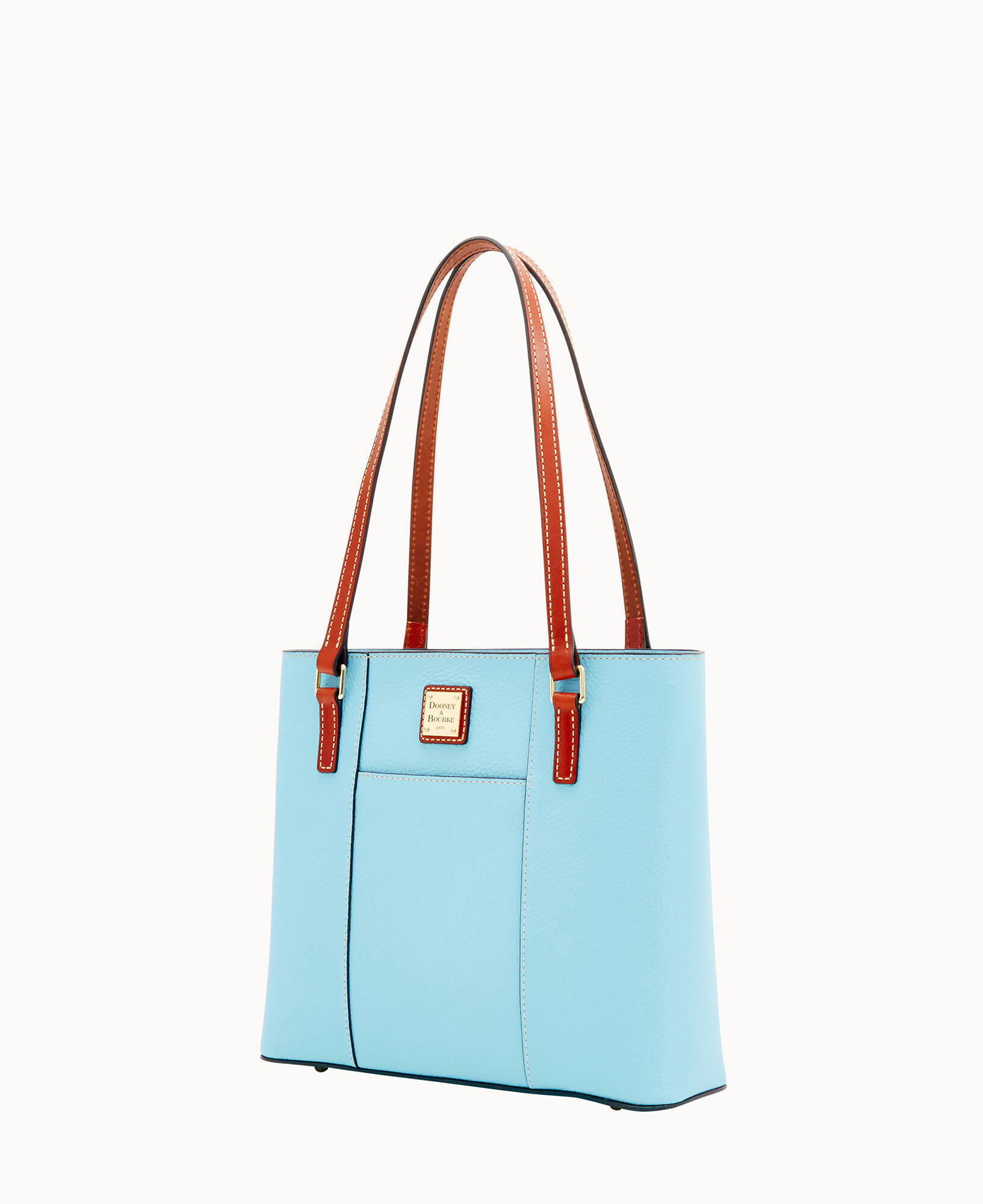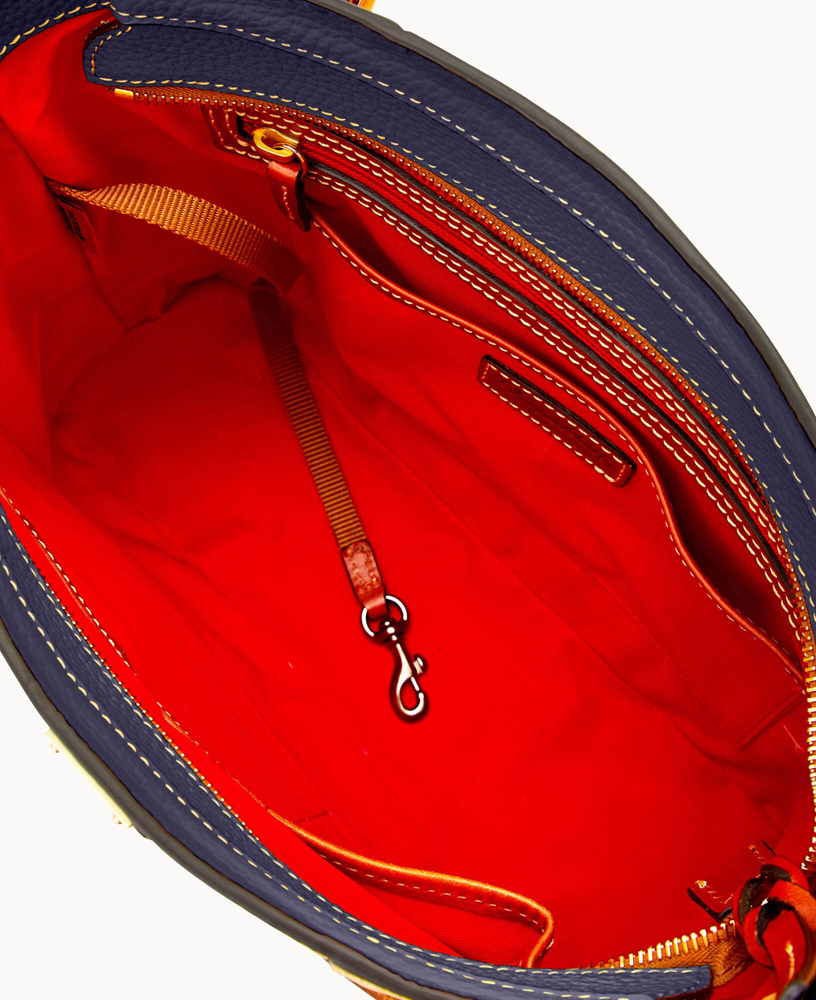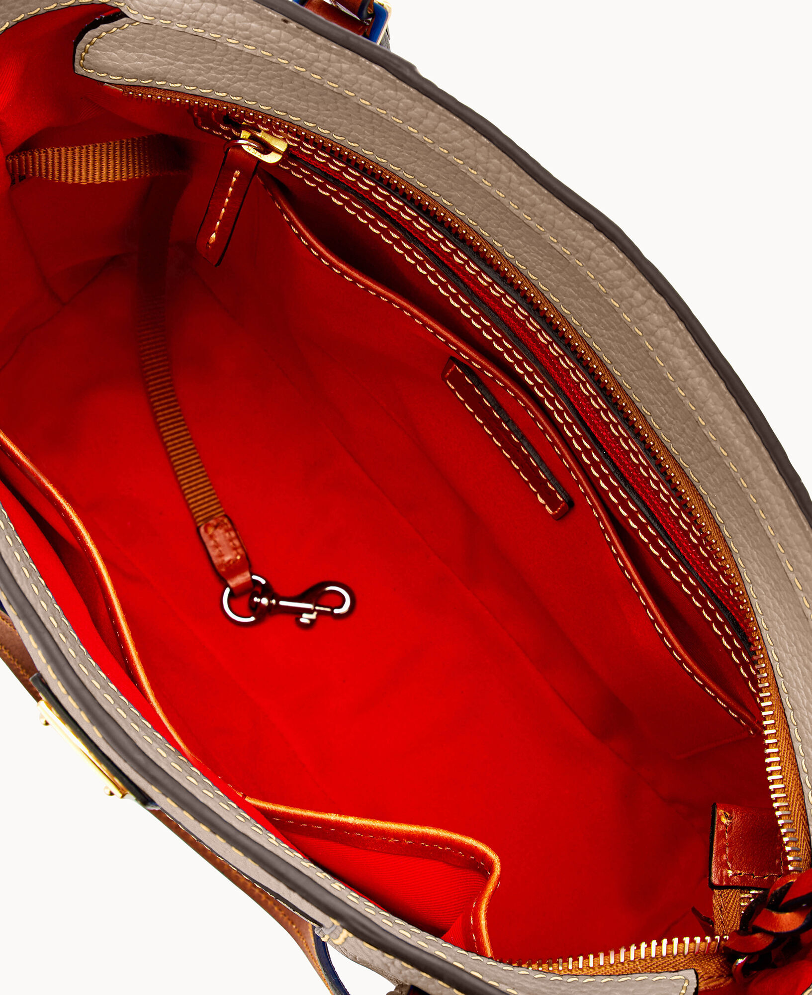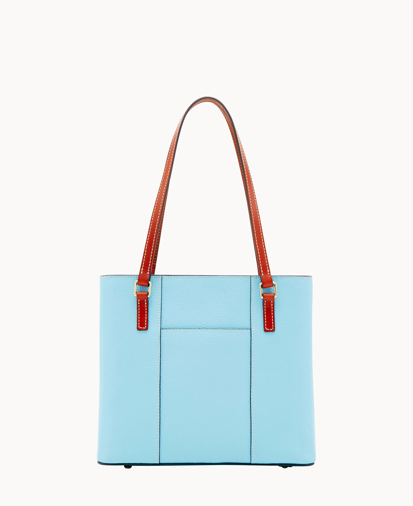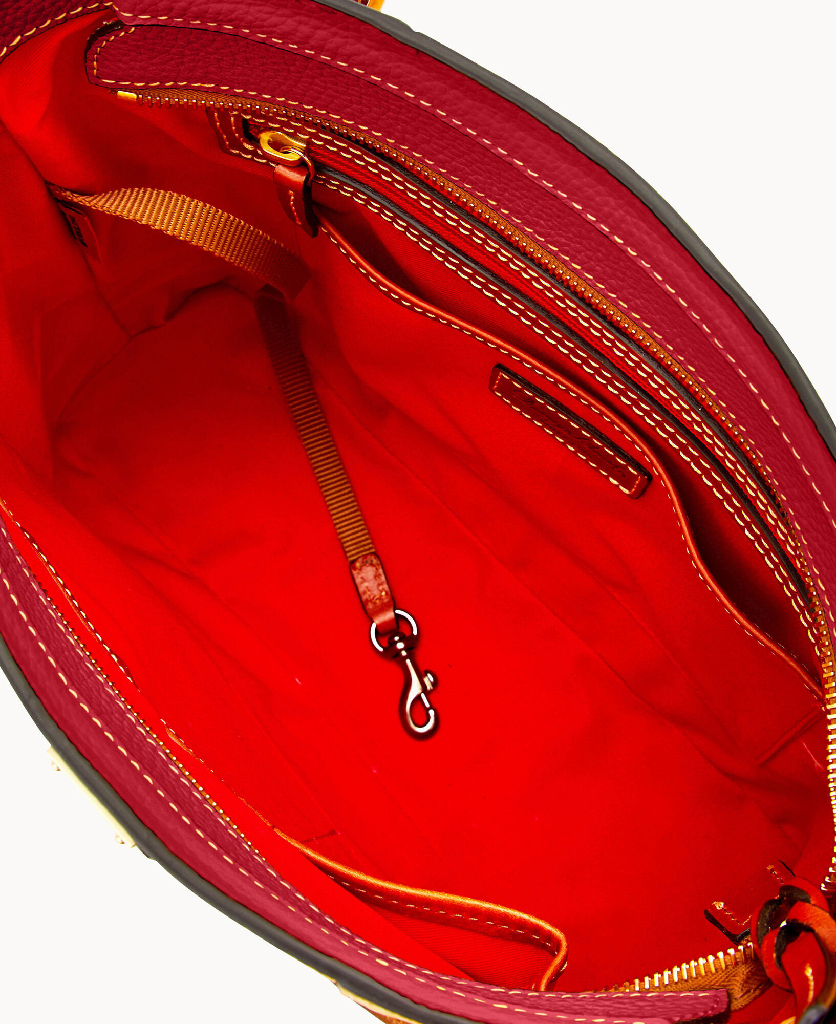 This essential tote, made from long-lasting pebble leather with a rich finish, has all the features you need: protective feet on the bottom, an exterior slip pocket, comfortable leather straps, and a zippered closure for security.