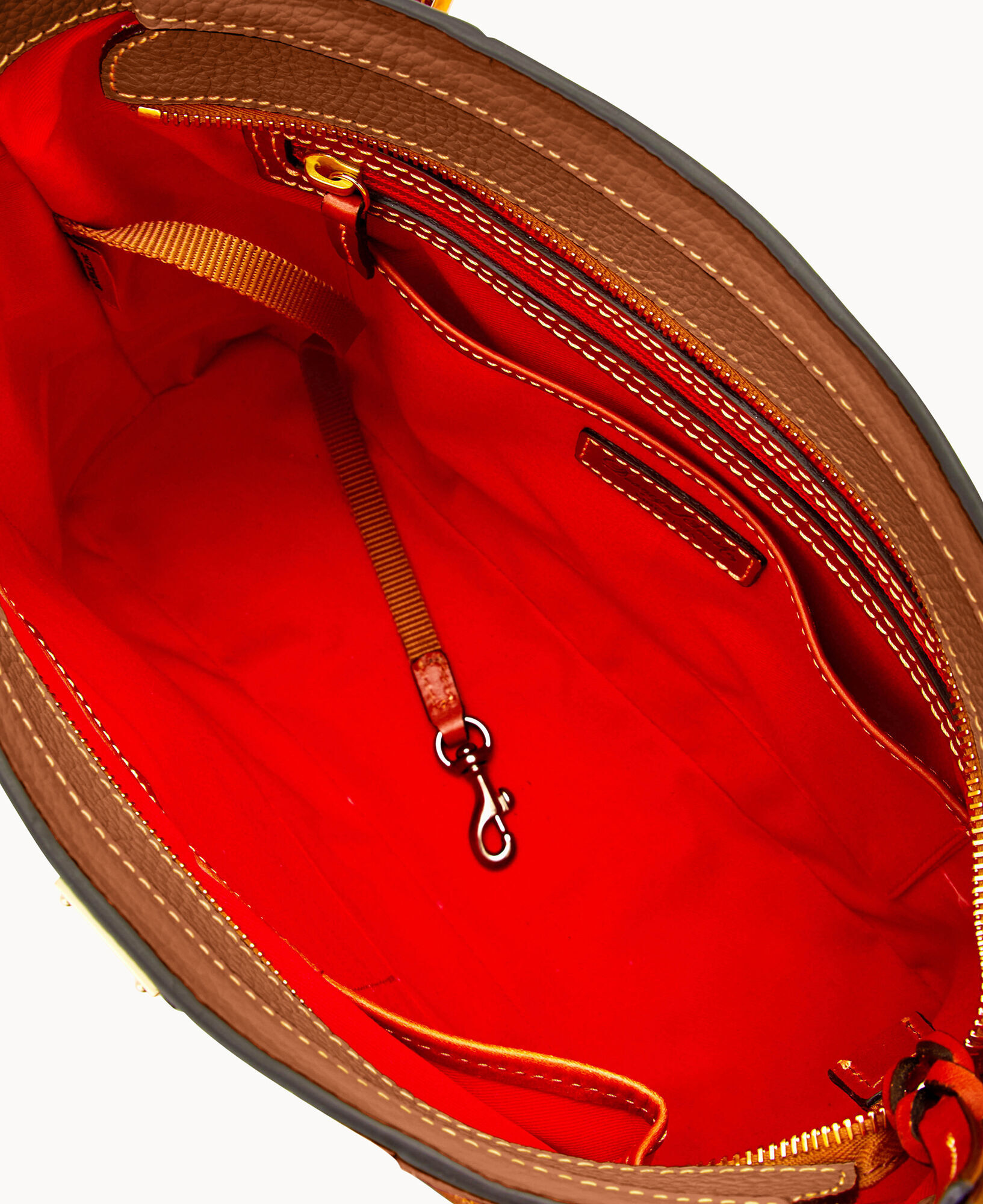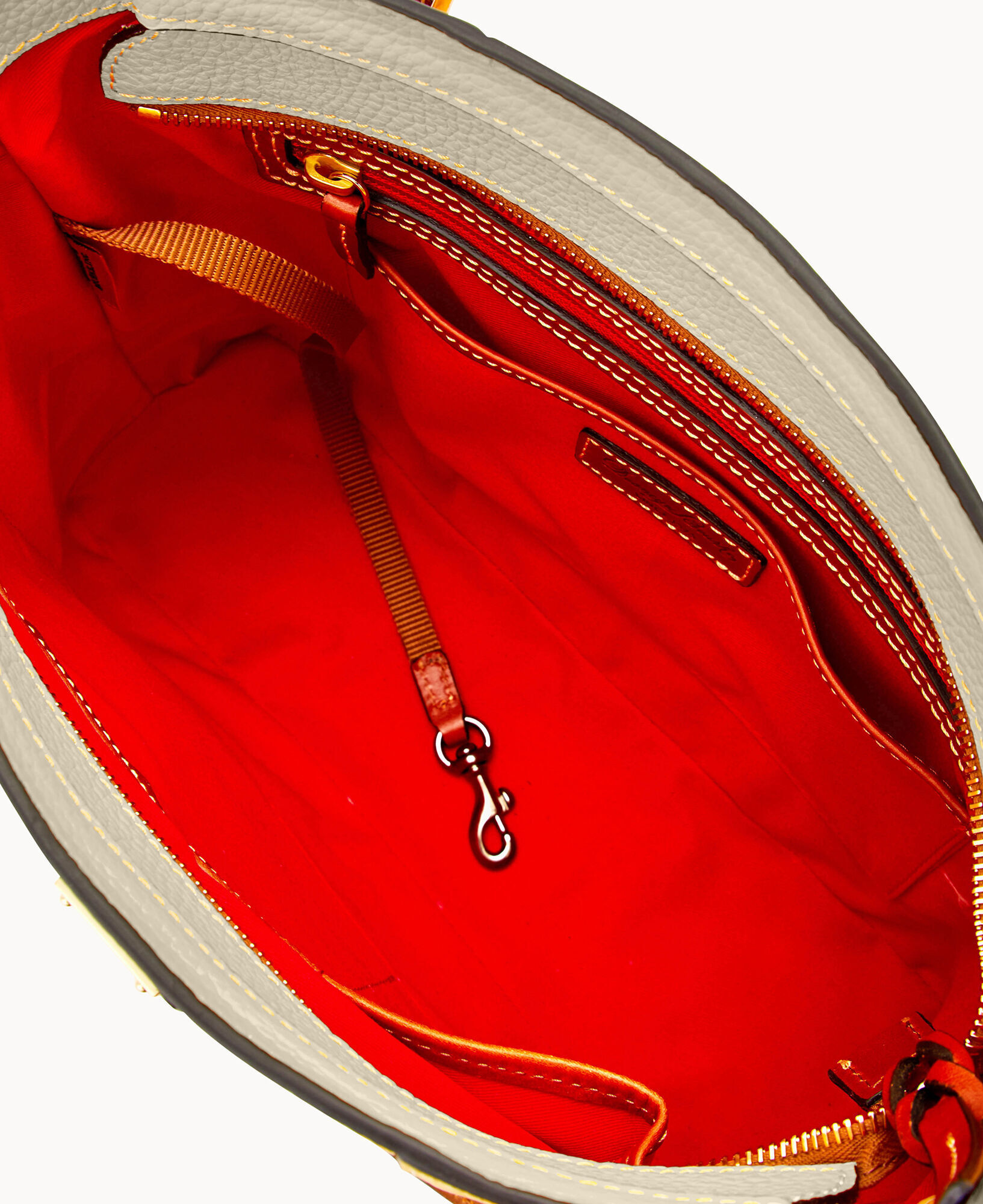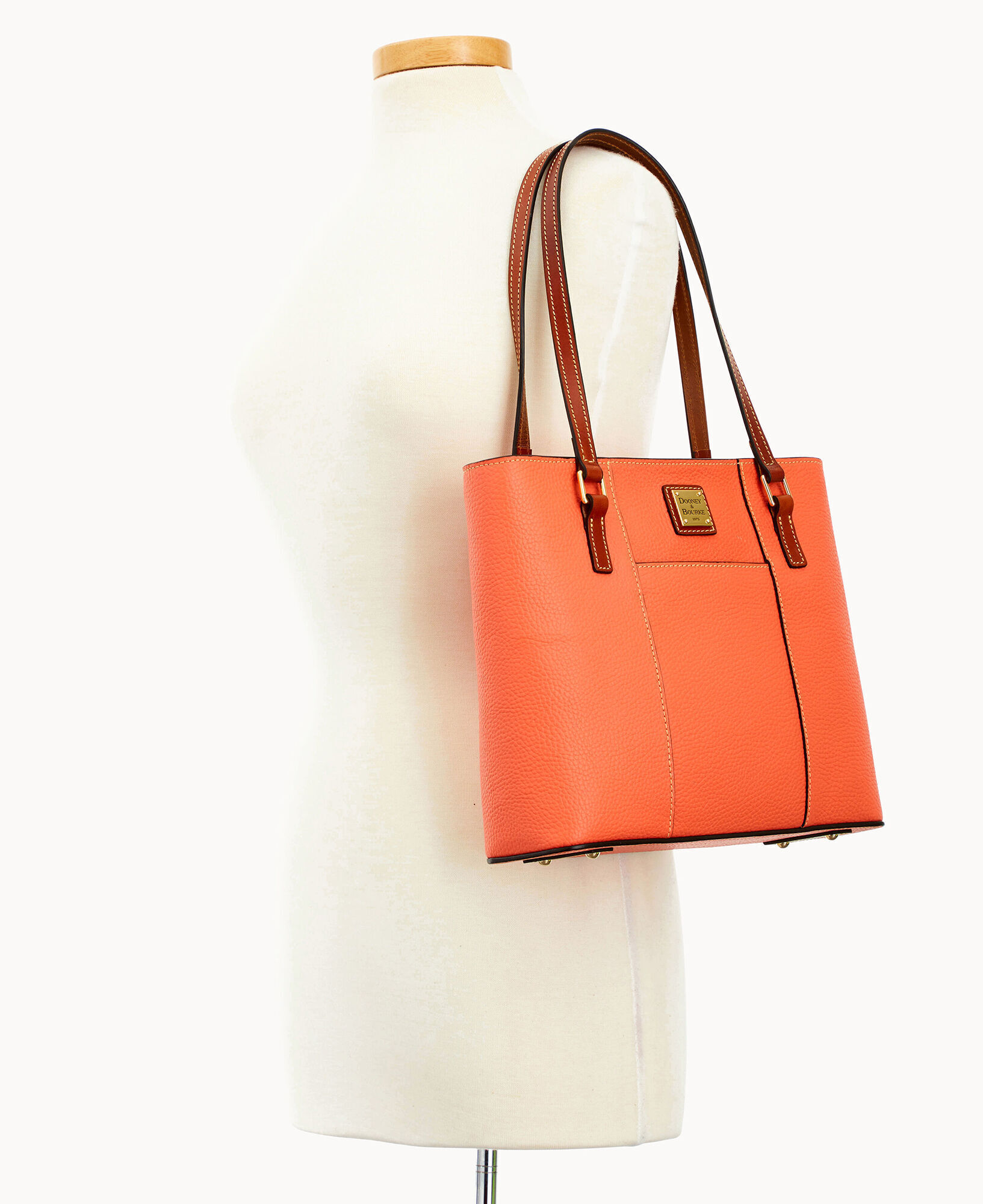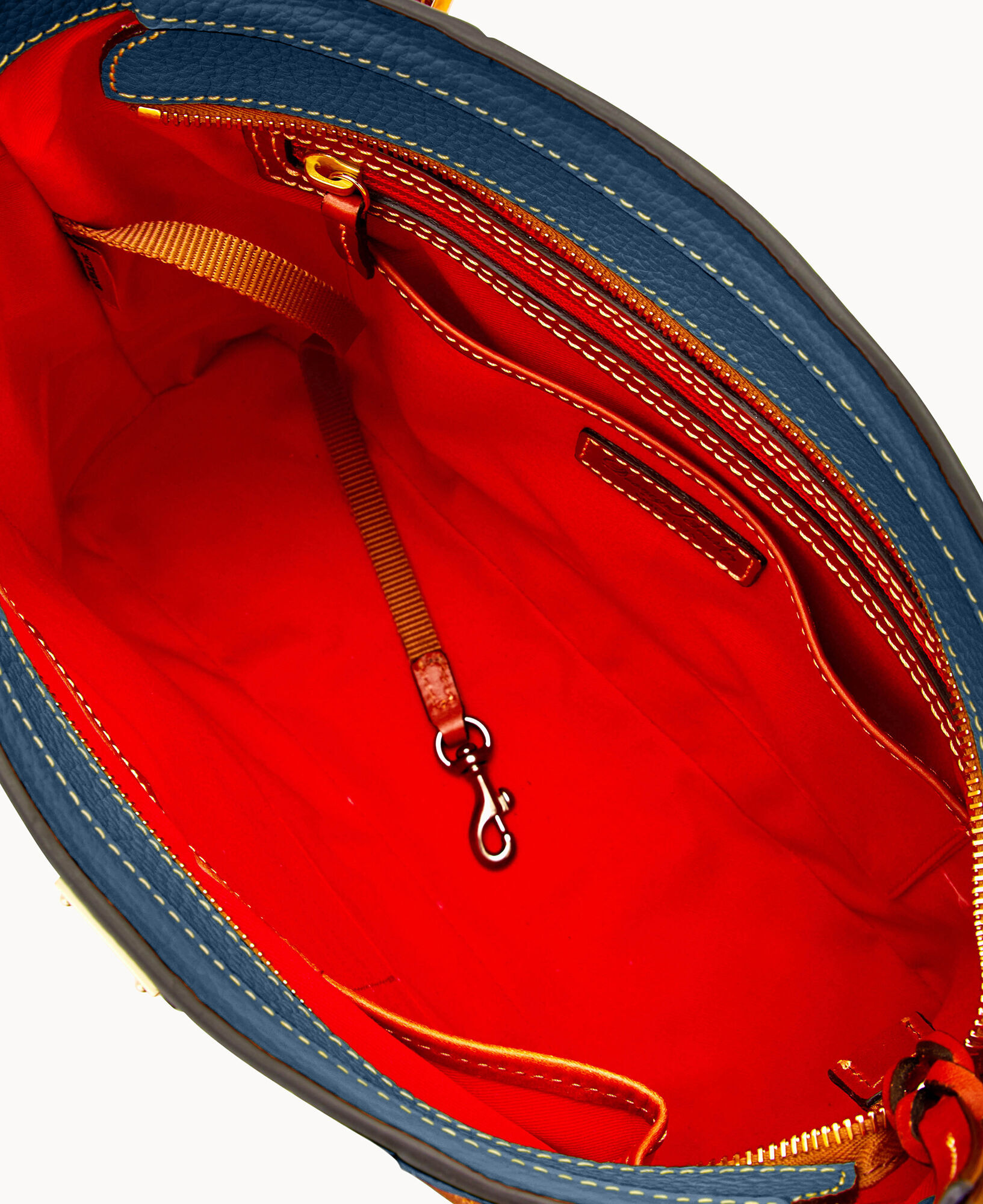 This essential tote, made from long-lasting pebble leather with a rich finish, has all the features you need: protective feet on the bottom, an exterior slip pocket, comfortable leather straps, and a zippered closure for security.
