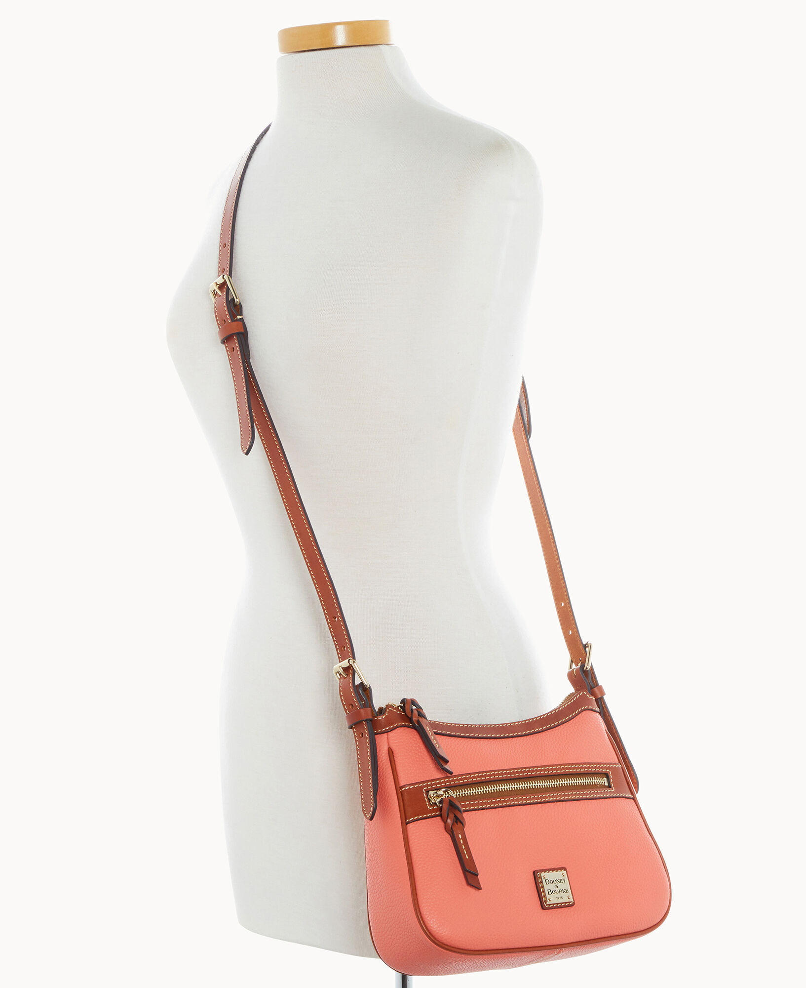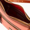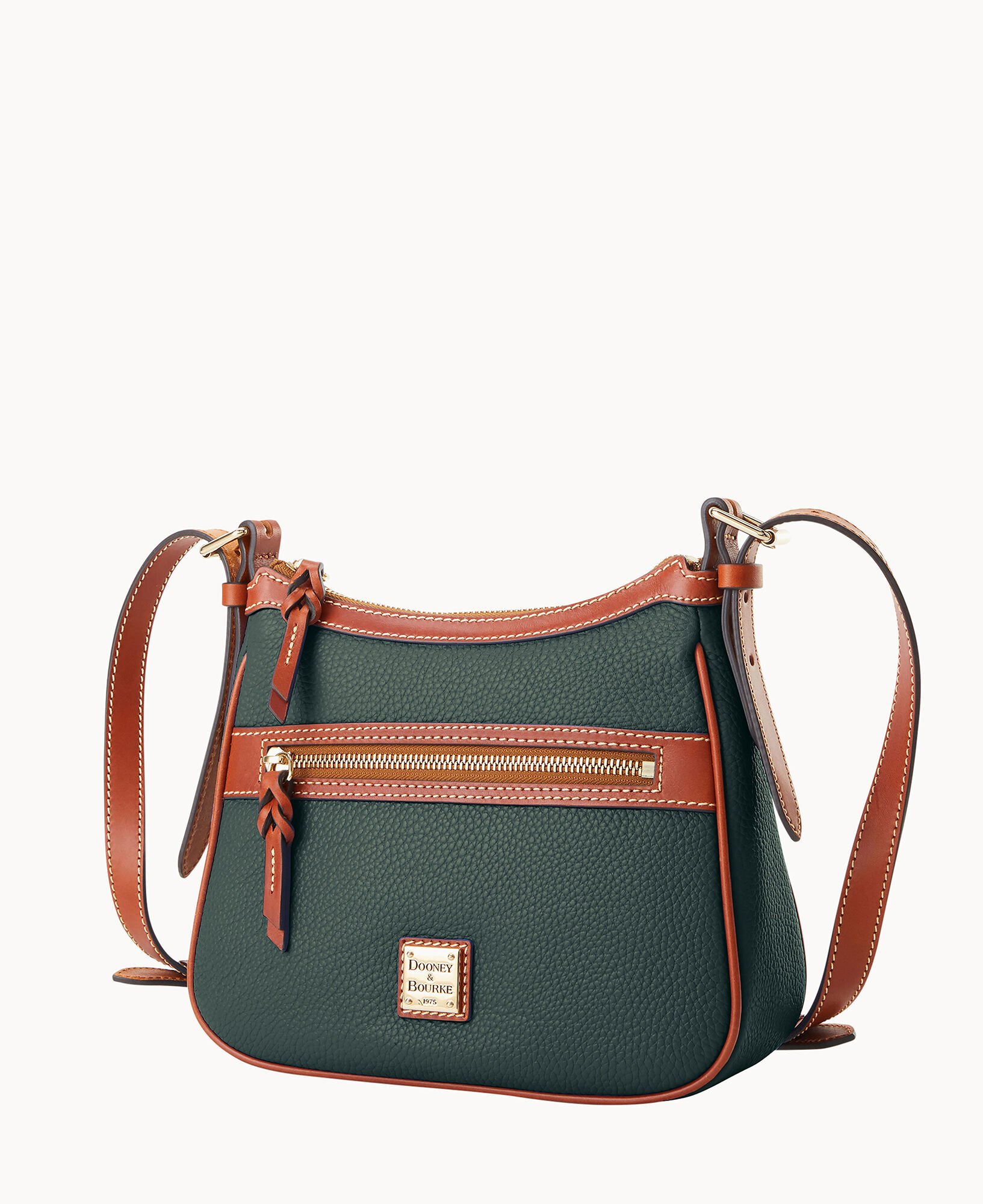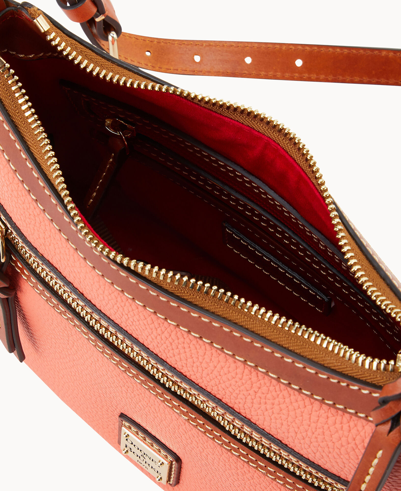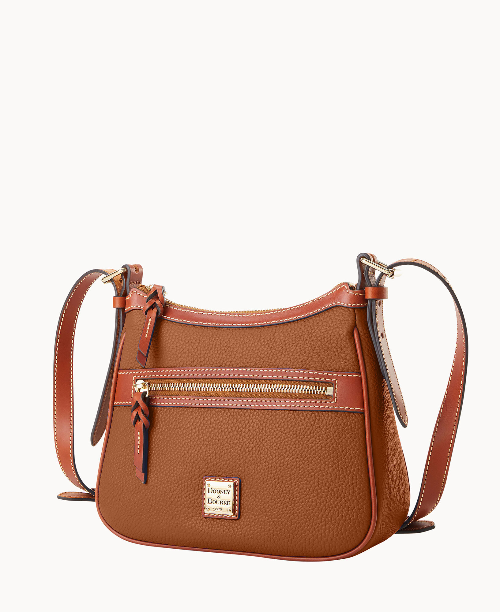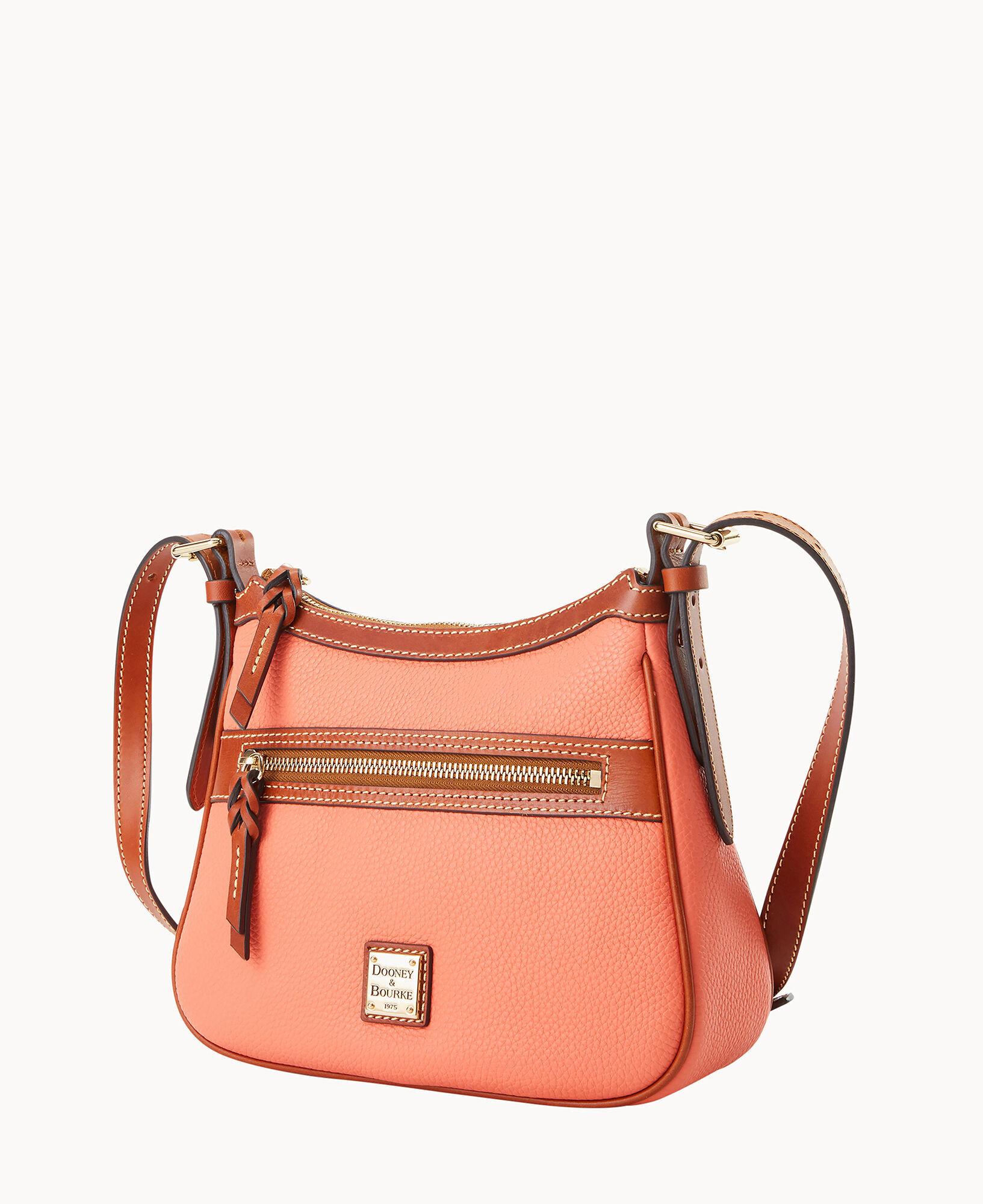 Outside zip pocket. Inside zip pocket. Two inside pockets. Inside key hook. Adjustable strap. Strap drop length 25″. Lined. Zipper closure.